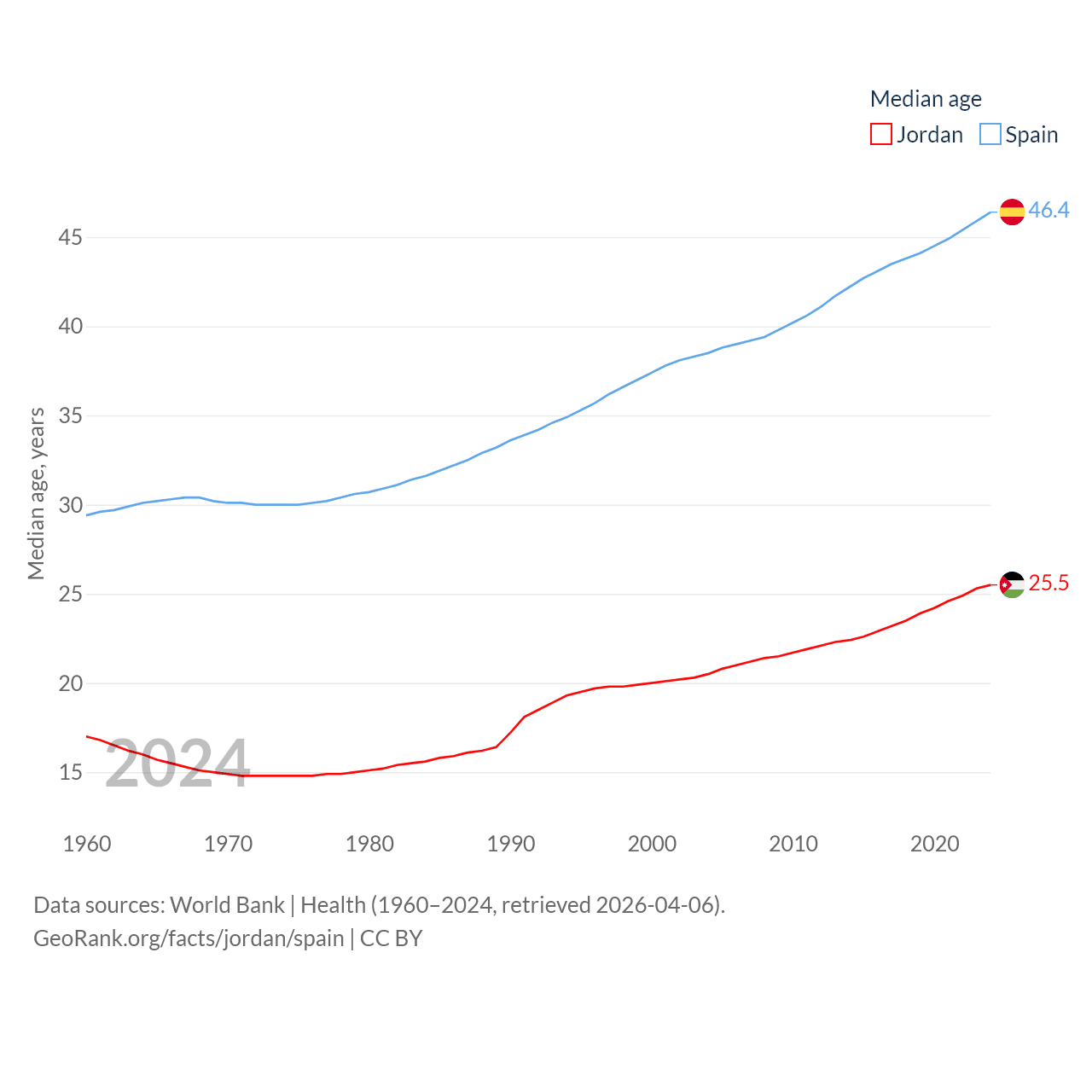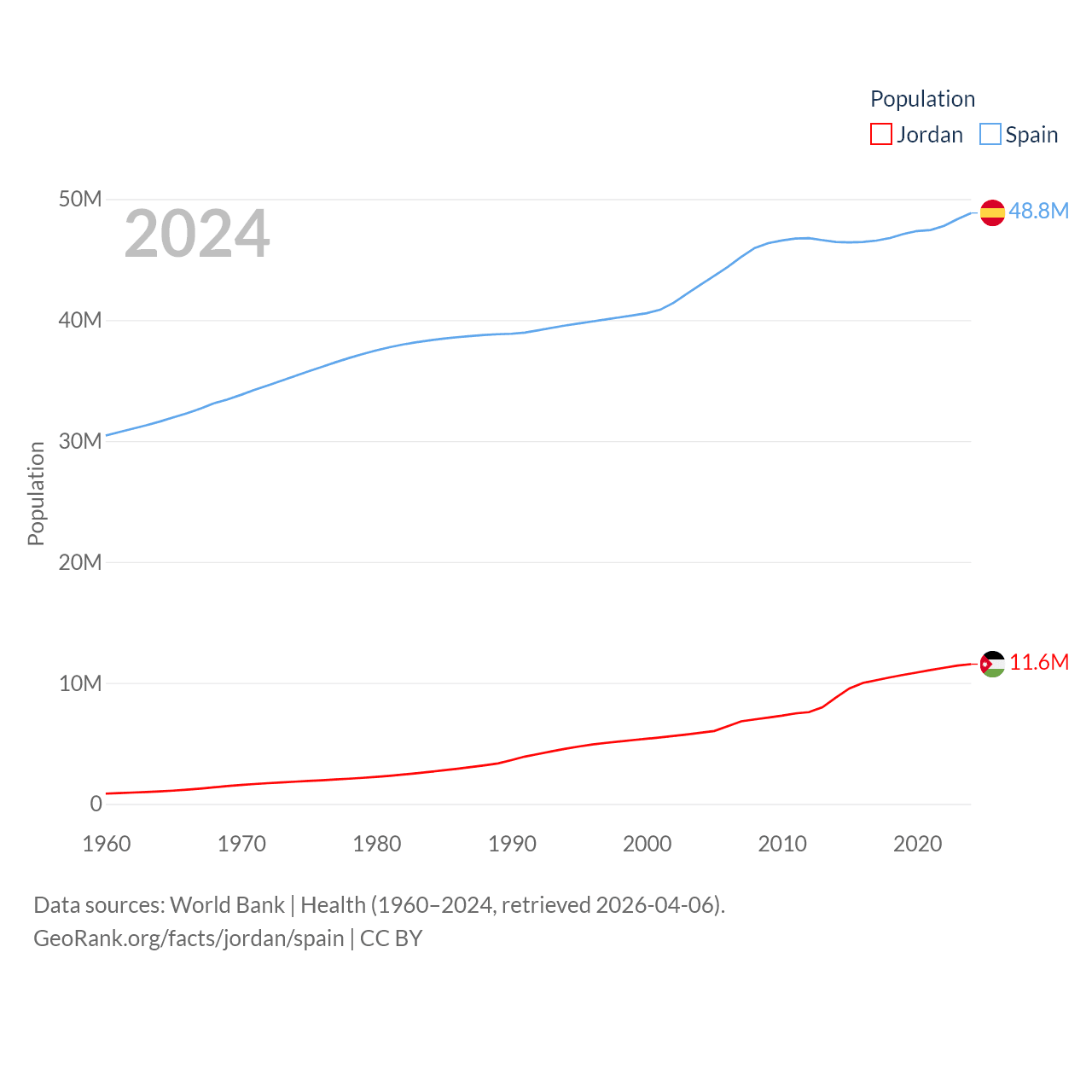 Jordan has a population of 11.6M (ranked 84/197), compared with 48.8M in Spain (ranked 32/197). Jordan's land area is 34,284 sq mi versus 192,934 sq mi for Spain (ranked 110th vs. 51st).