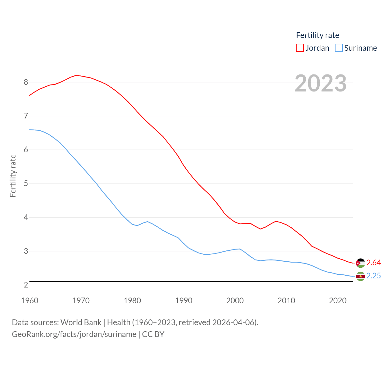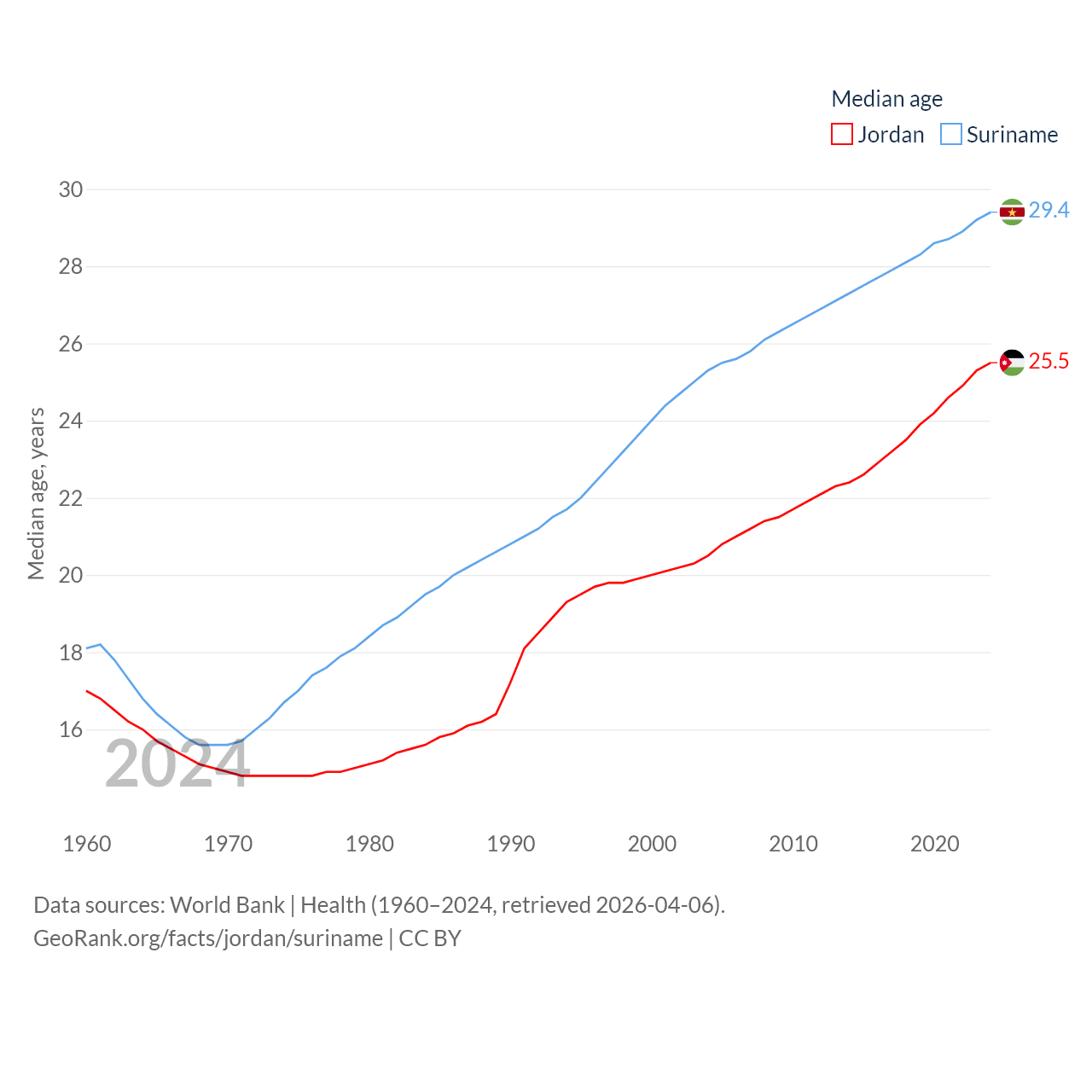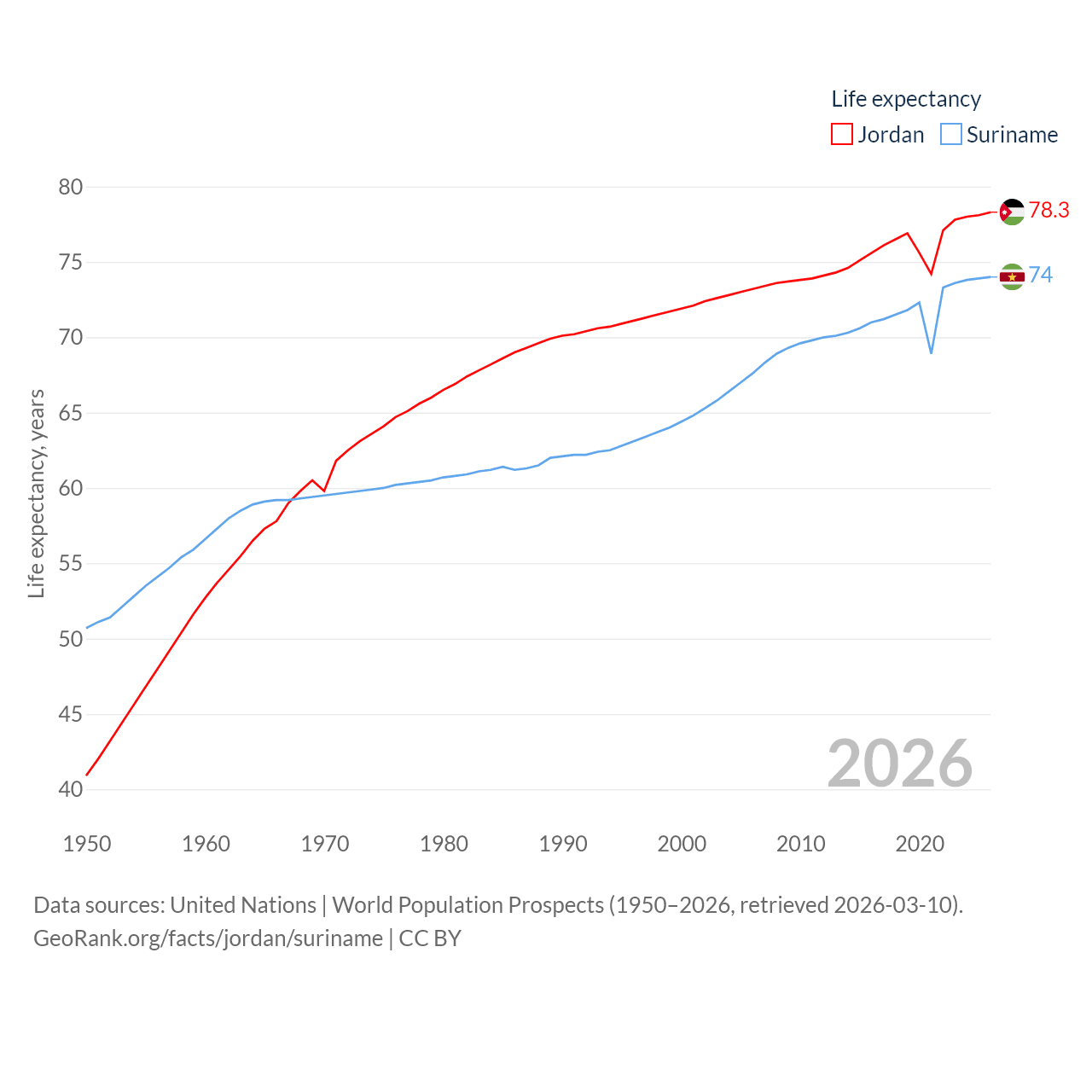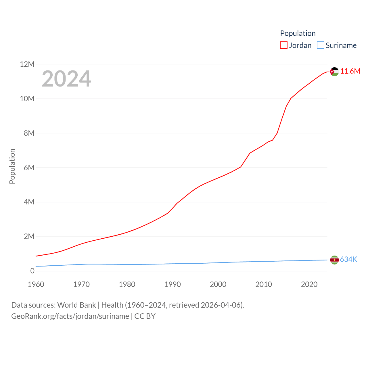 Jordan has a population of 11.6M (ranked 84/197), compared with 634K in Suriname (ranked 165/197). Jordan's land area is 34,284 sq mi versus 61,972 sq mi for Suriname (ranked 110th vs. 90th).
