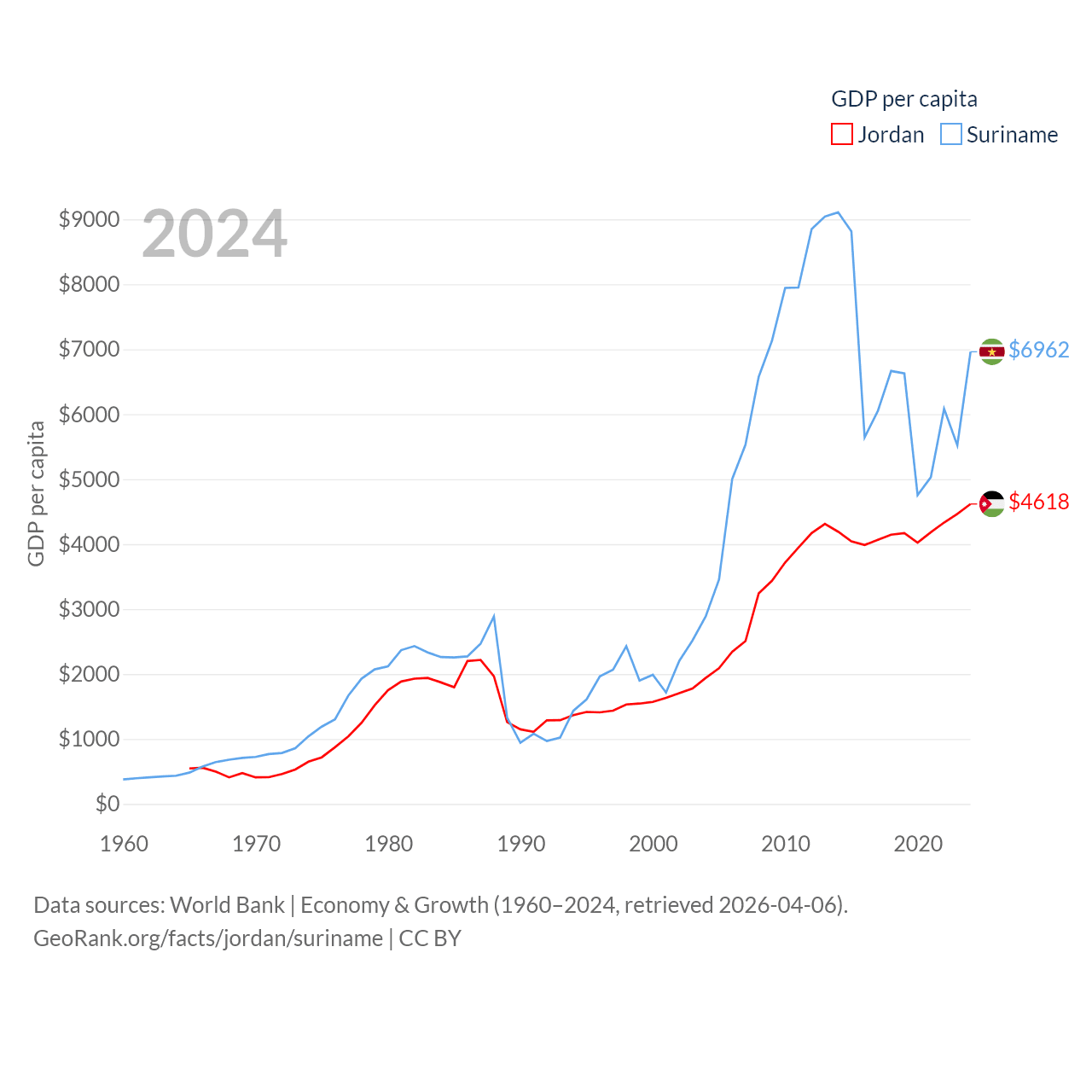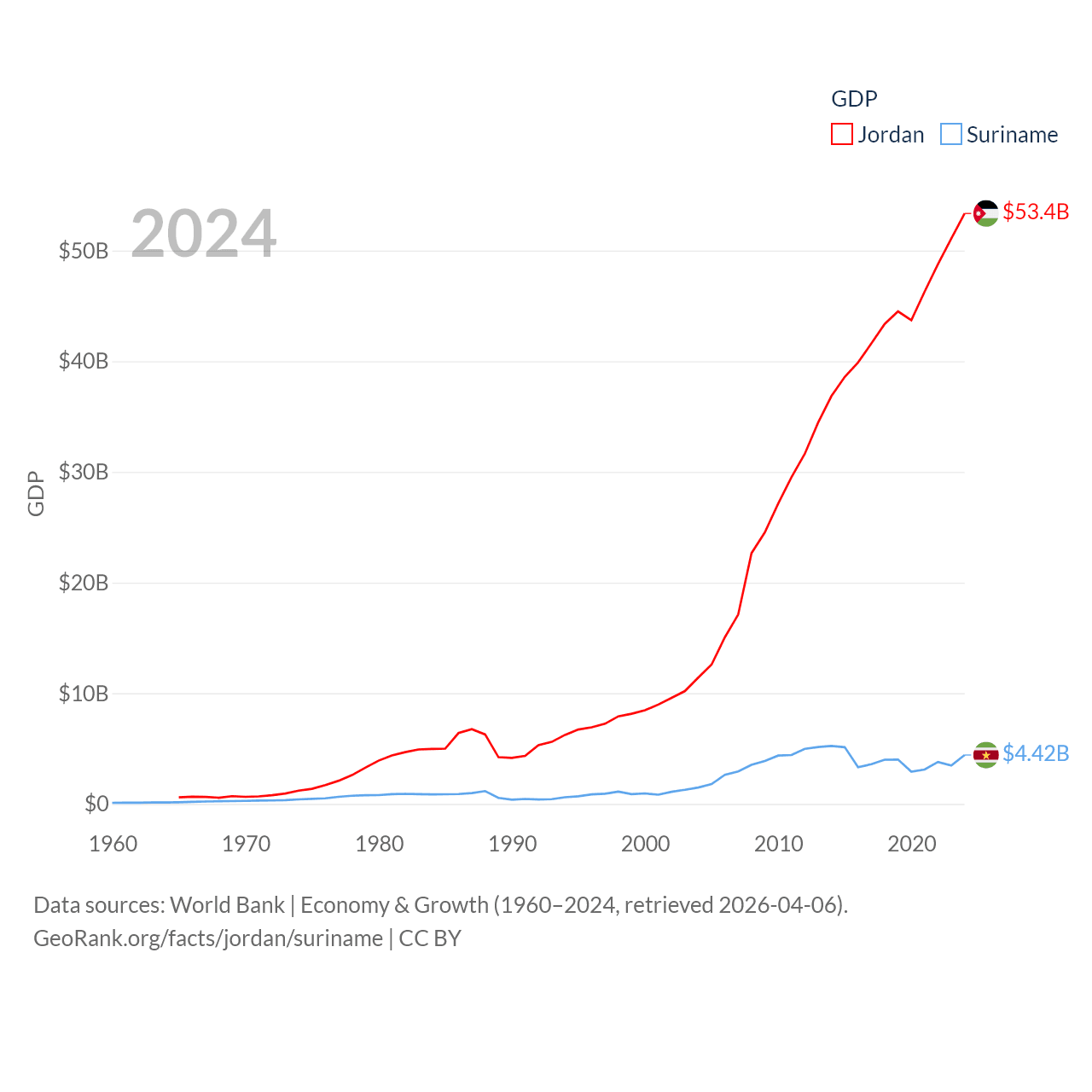 By GDP, Jordan ranks 90/197 ($53.4B) and Suriname ranks 164/197 ($4.42B). By GDP per capita, Jordan ranks 123/197 ($4,618), while Suriname ranks 102/197 ($6,962).