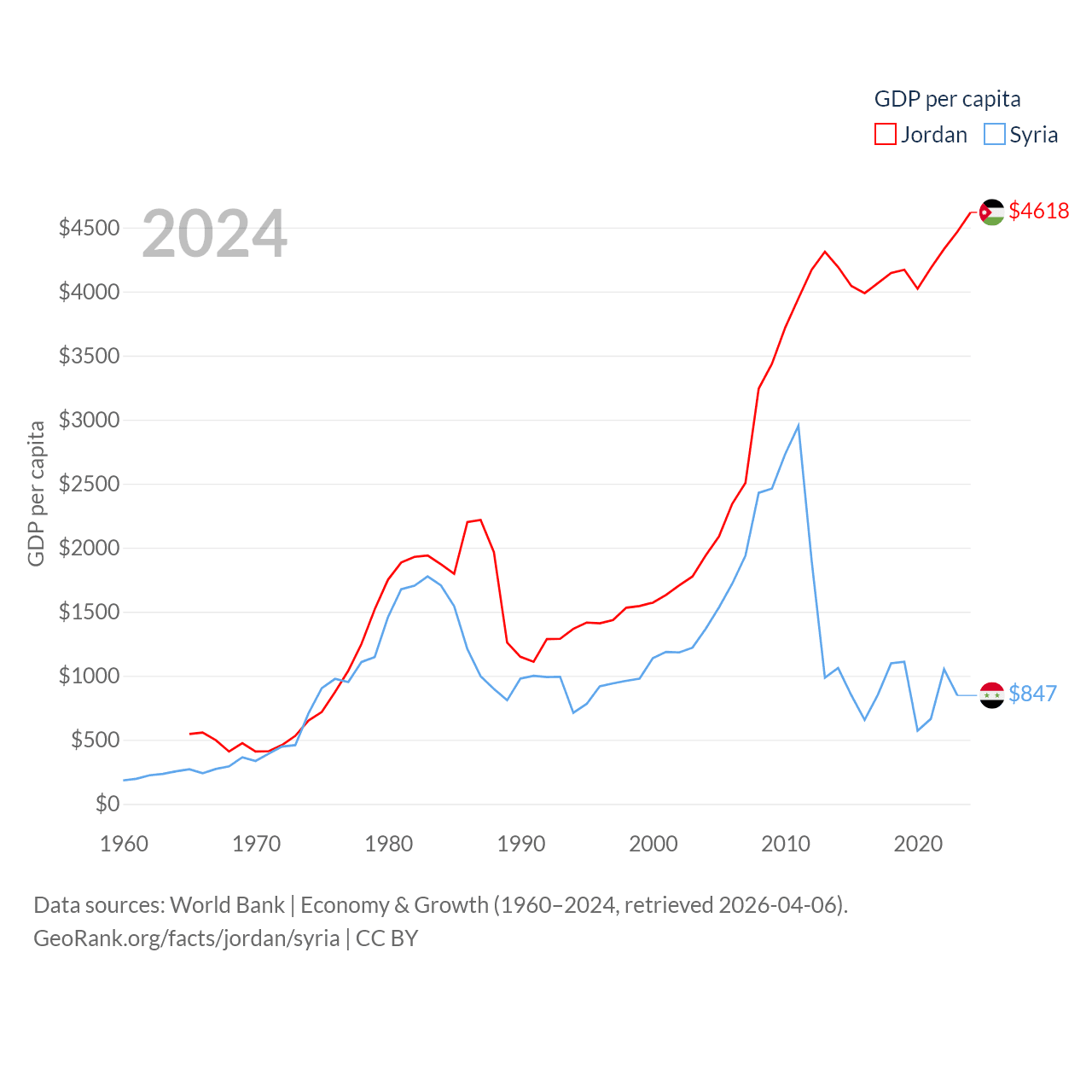 By GDP, Jordan ranks 90/197 ($53.4B) and Syria ranks 129/197 ($20B). By GDP per capita, Jordan ranks 123/197 ($4,618), while Syria ranks 185/197 ($847).