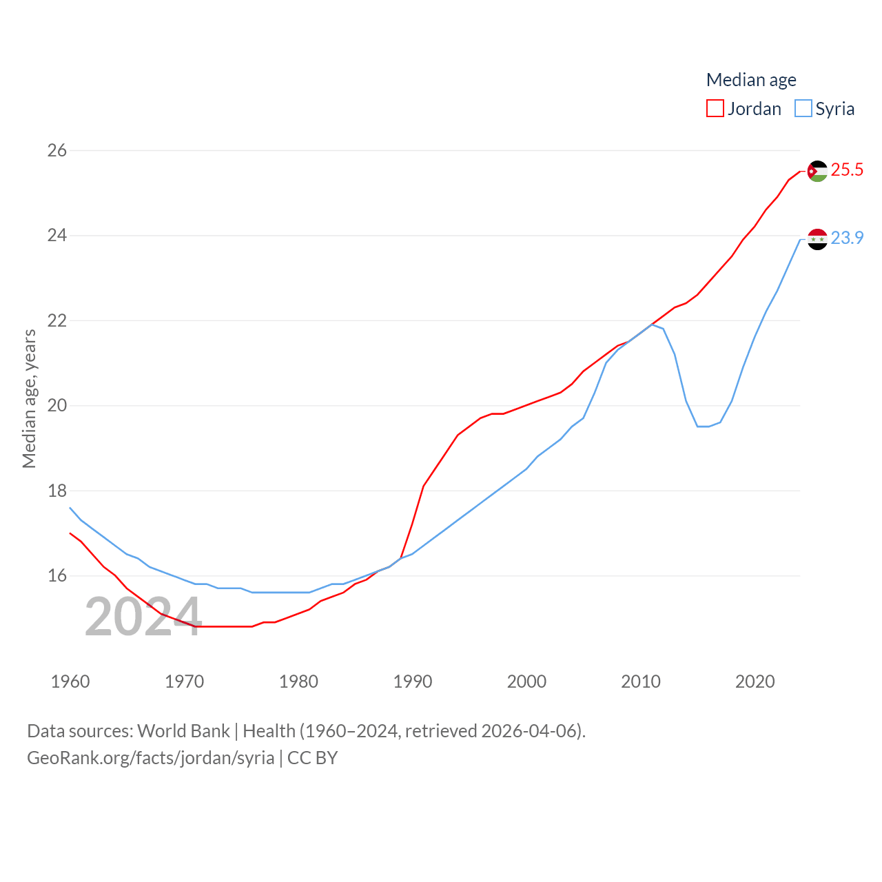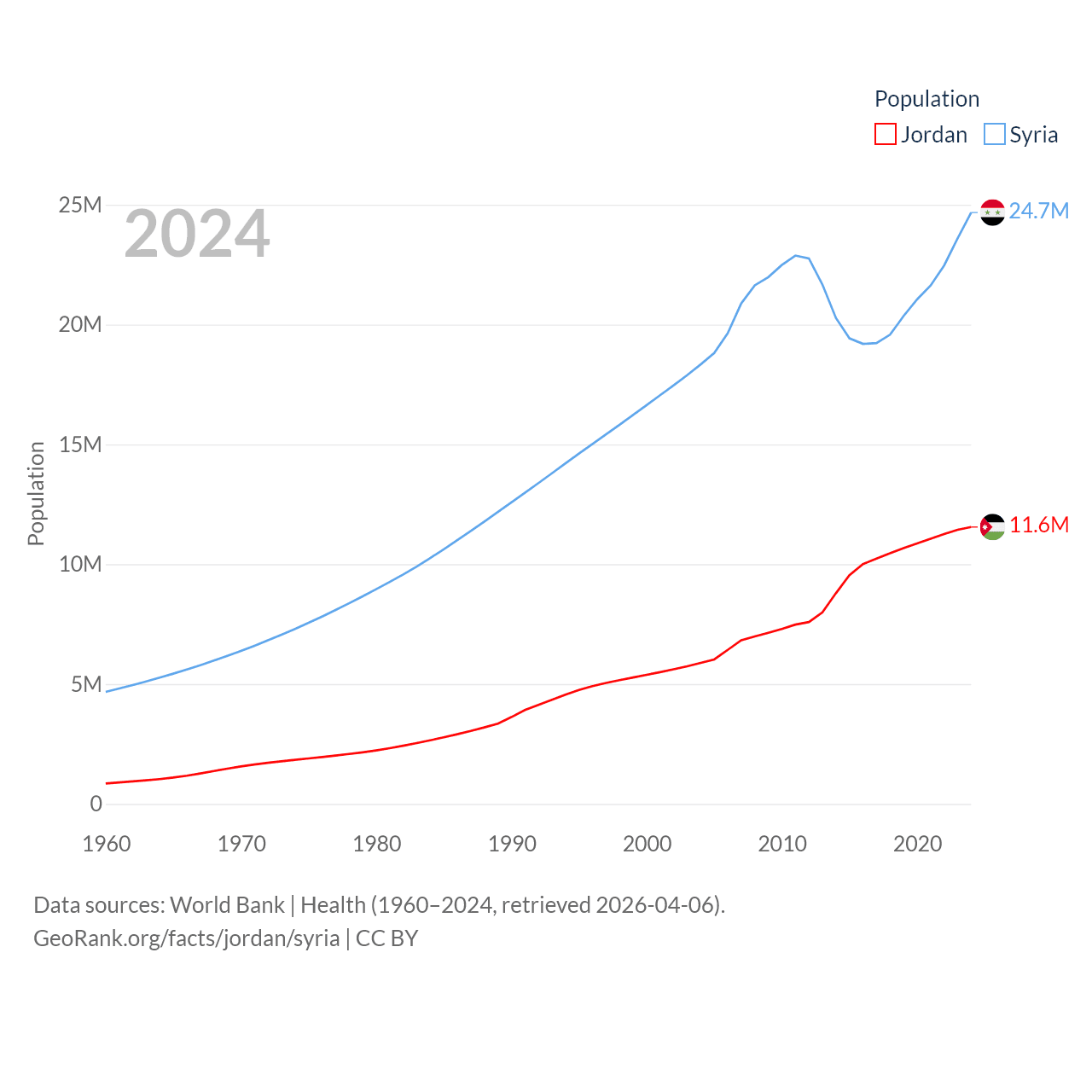 Jordan has a population of 11.6M (ranked 84/197), compared with 24.7M in Syria (ranked 57/197). Jordan's land area is 34,284 sq mi versus 70,900 sq mi for Syria (ranked 110th vs. 87th).
