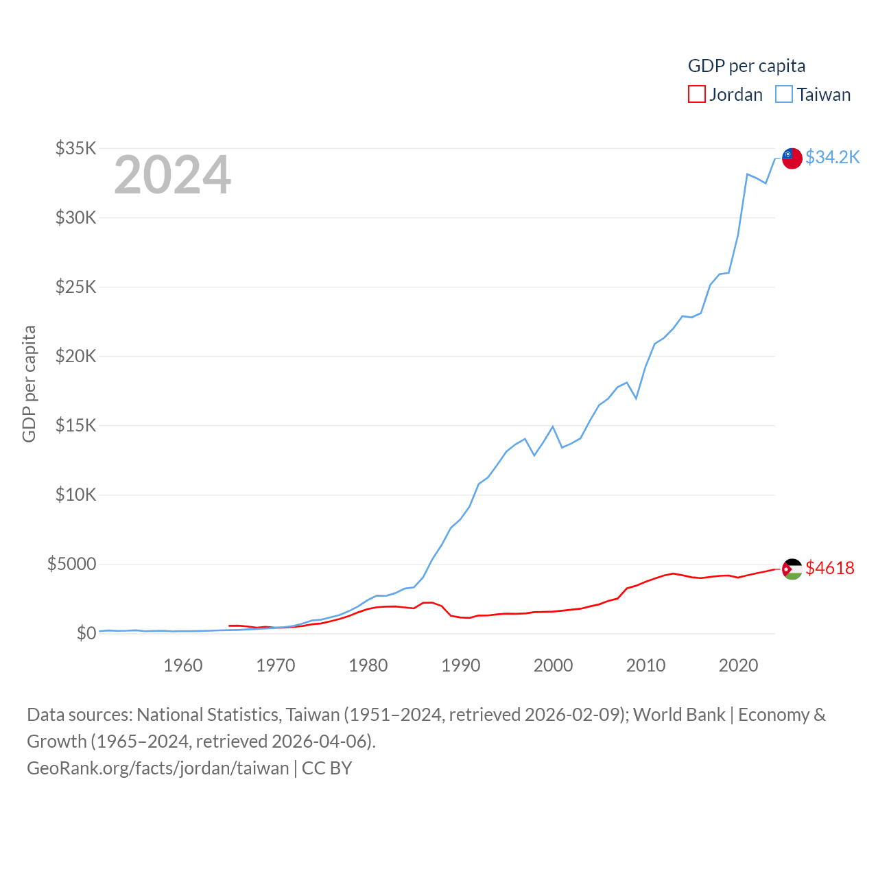 By GDP, Jordan ranks 90/197 ($53.4B) and Taiwan ranks 22/197 ($802B). By GDP per capita, Jordan ranks 123/197 ($4,618), while Taiwan ranks 35/197 ($34,238).