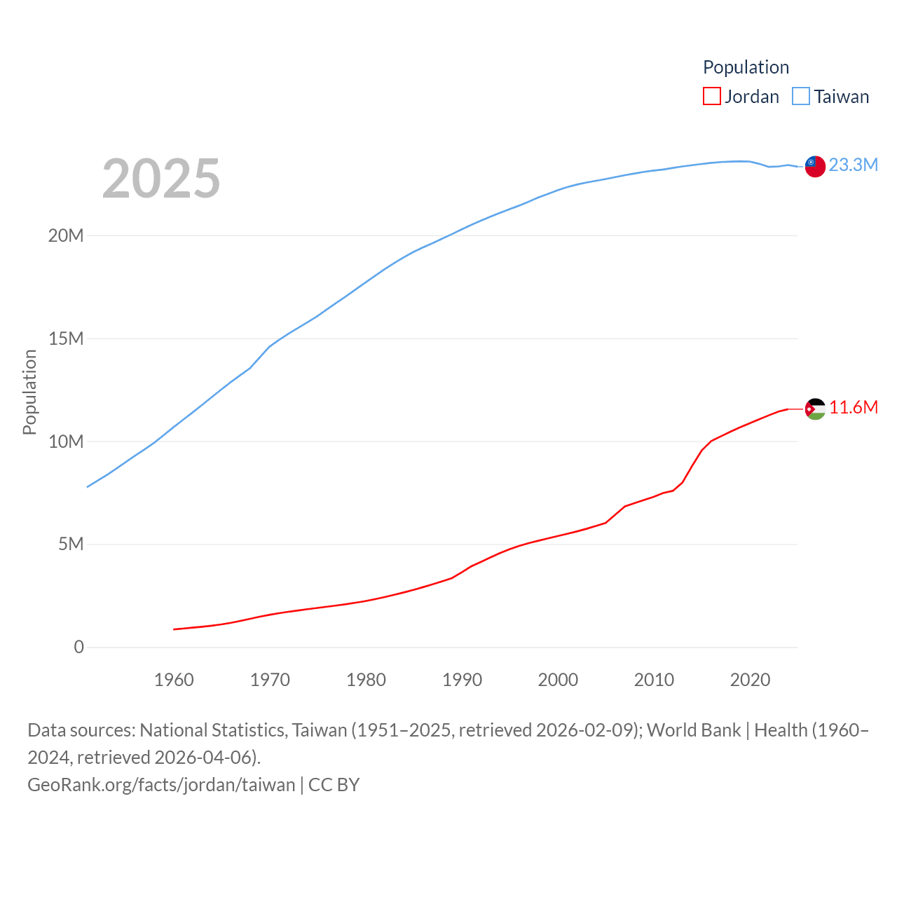 Jordan has a population of 11.6M (ranked 84/197), compared with 23.3M in Taiwan (ranked 60/197). Jordan's land area is 34,284 sq mi versus 13,976 sq mi for Taiwan (ranked 110th vs. 133rd).
