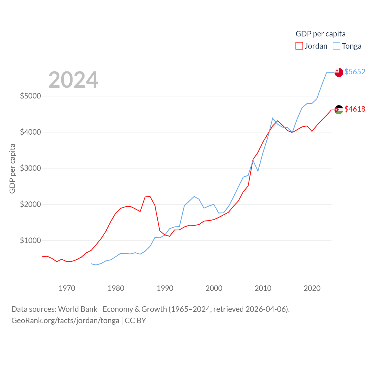 By GDP, Jordan ranks 90/197 ($53.4B) and Tonga ranks 191/197 ($591M). By GDP per capita, Jordan ranks 123/197 ($4,618), while Tonga ranks 115/197 ($5,652).