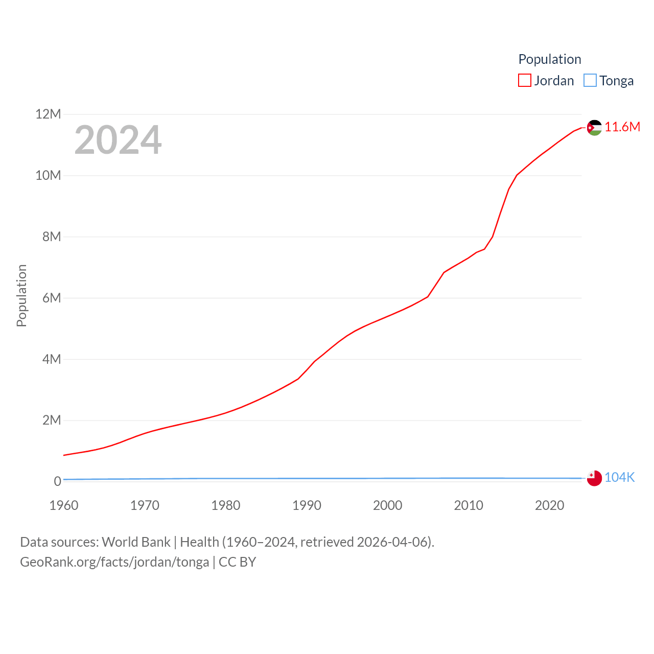 Jordan has a population of 11.6M (ranked 84/197), compared with 104K in Tonga (ranked 183/197). Jordan's land area is 34,284 sq mi versus 278 sq mi for Tonga (ranked 110th vs. 176th).