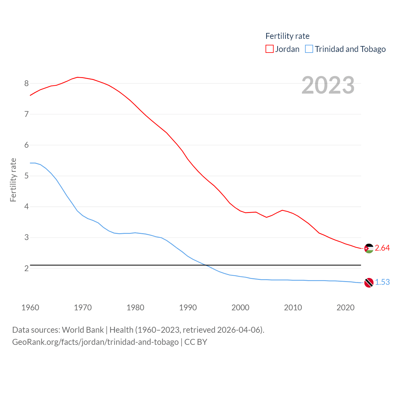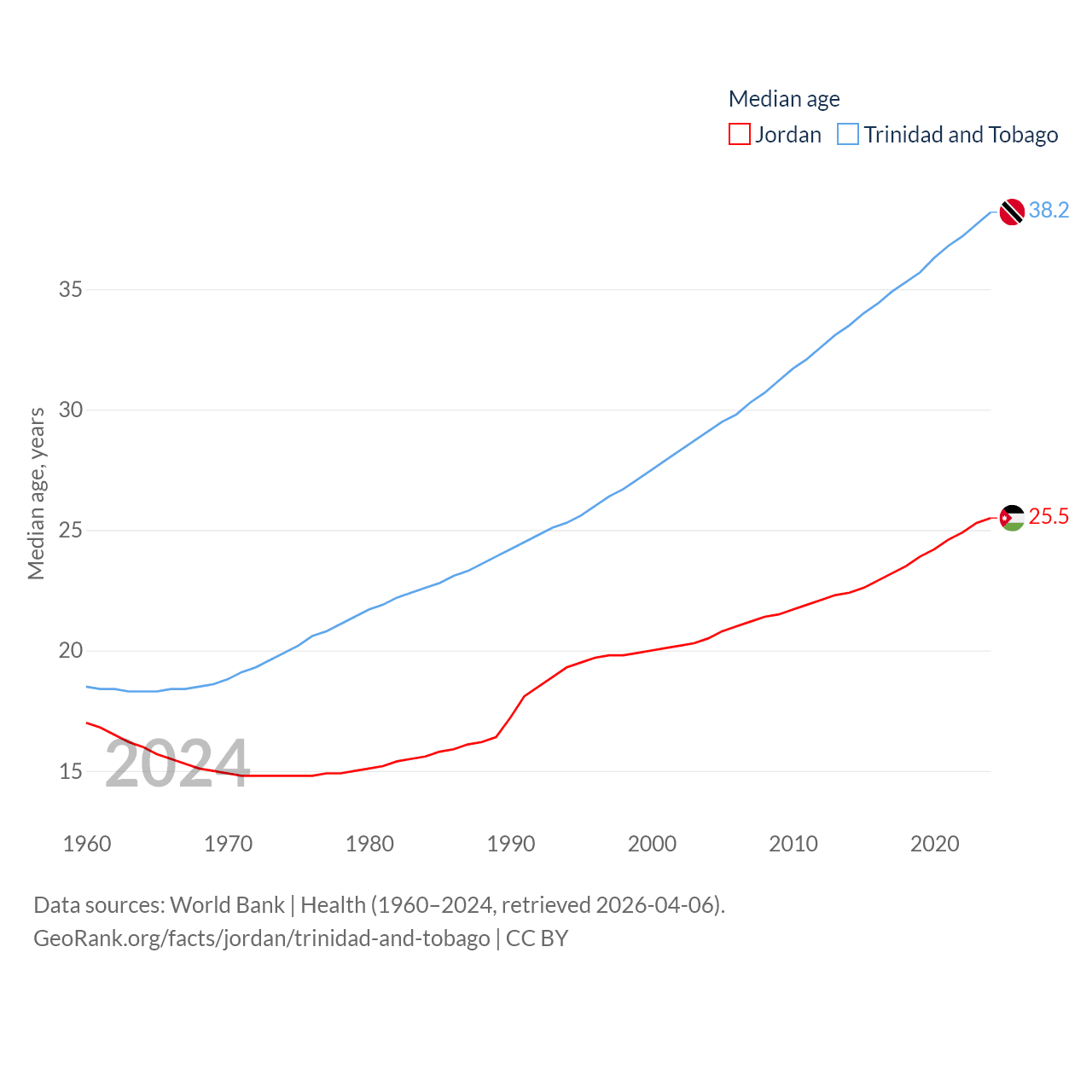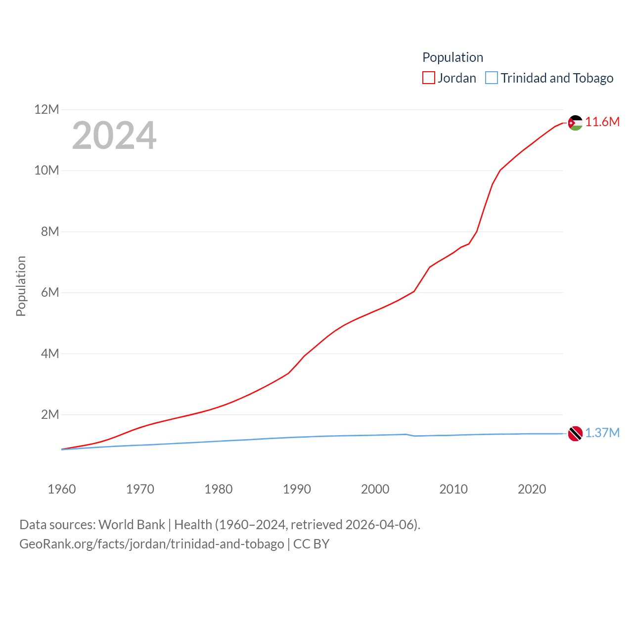 Jordan has a population of 11.6M (ranked 84/197), compared with 1.37M in Trinidad and Tobago (ranked 154/197). Jordan's land area is 34,284 sq mi versus 1,981 sq mi for Trinidad and Tobago (ranked 110th vs. 166th).