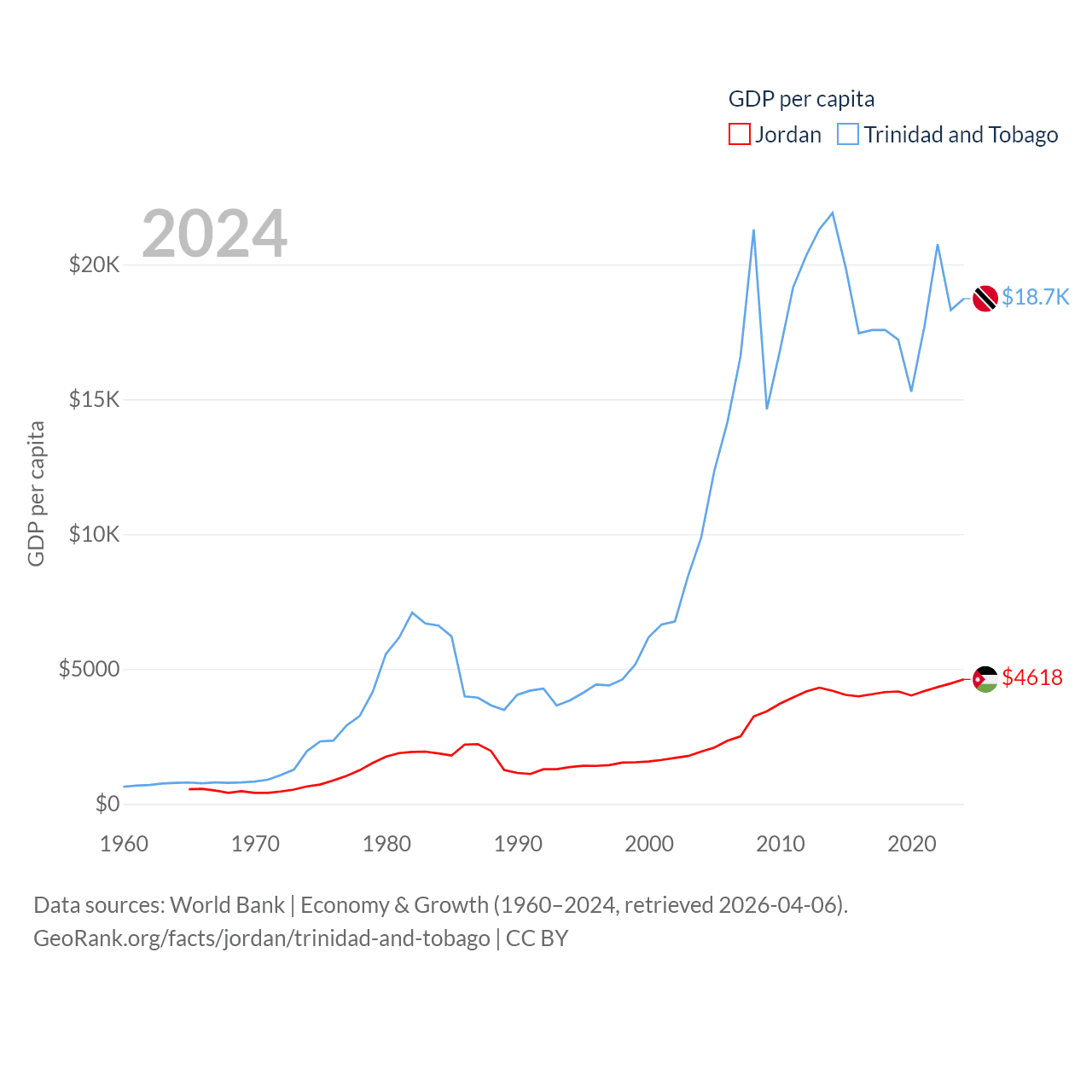 By GDP, Jordan ranks 90/197 ($53.4B) and Trinidad and Tobago ranks 115/197 ($25.6B). By GDP per capita, Jordan ranks 123/197 ($4,618), while Trinidad and Tobago ranks 61/197 ($18,733).