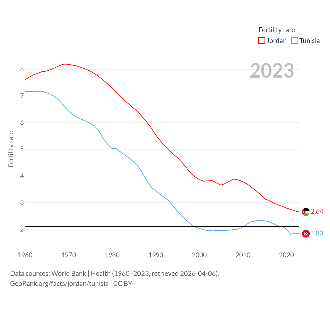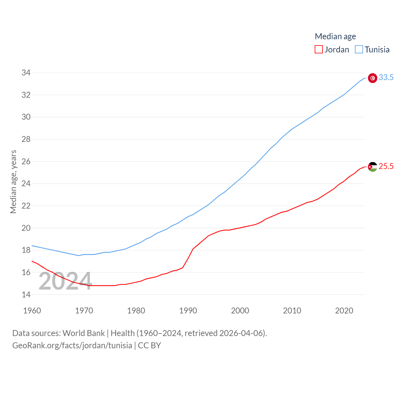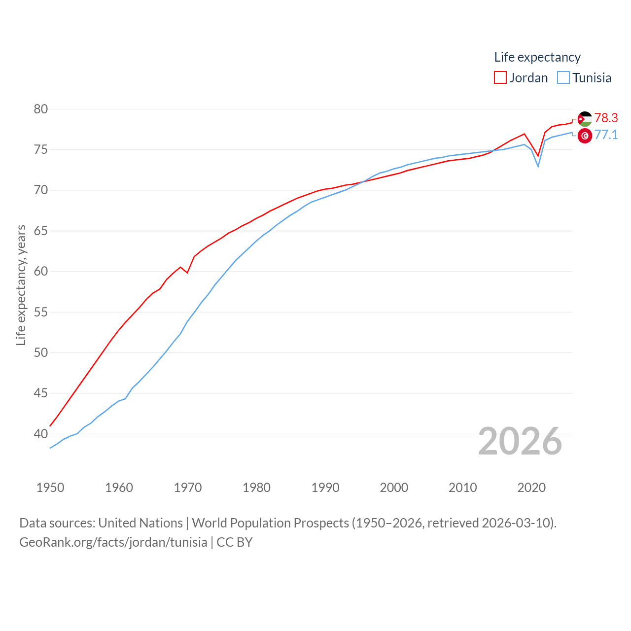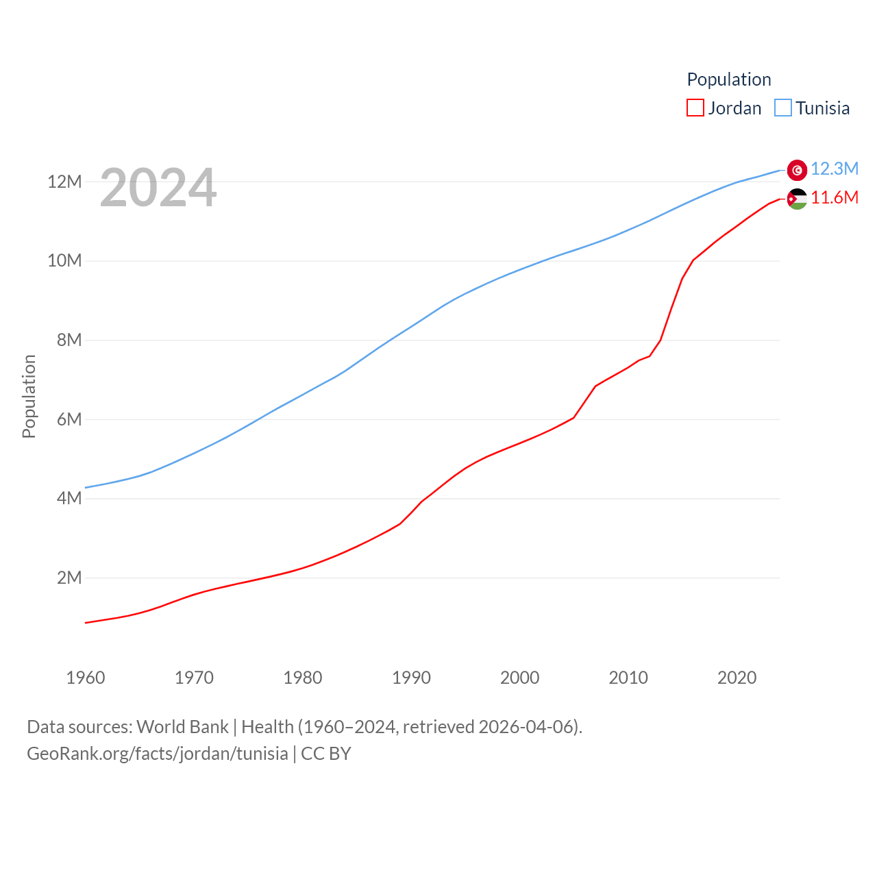 Jordan has a population of 11.6M (ranked 84/197), compared with 12.3M in Tunisia (ranked 80/197). Jordan's land area is 34,284 sq mi versus 59,985 sq mi for Tunisia (ranked 110th vs. 91st).