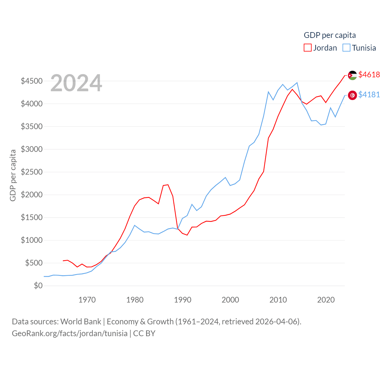 By GDP, Jordan ranks 90/197 ($53.4B) and Tunisia ranks 93/197 ($51.3B). By GDP per capita, Jordan ranks 123/197 ($4,618), while Tunisia ranks 129/197 ($4,181).