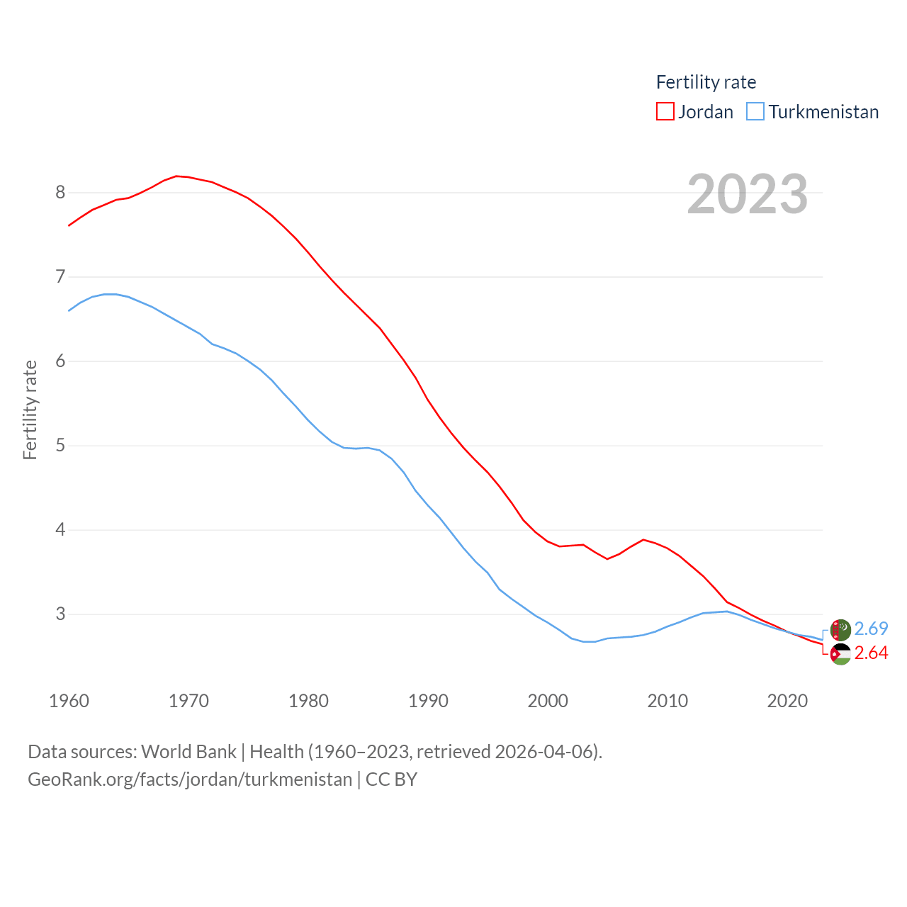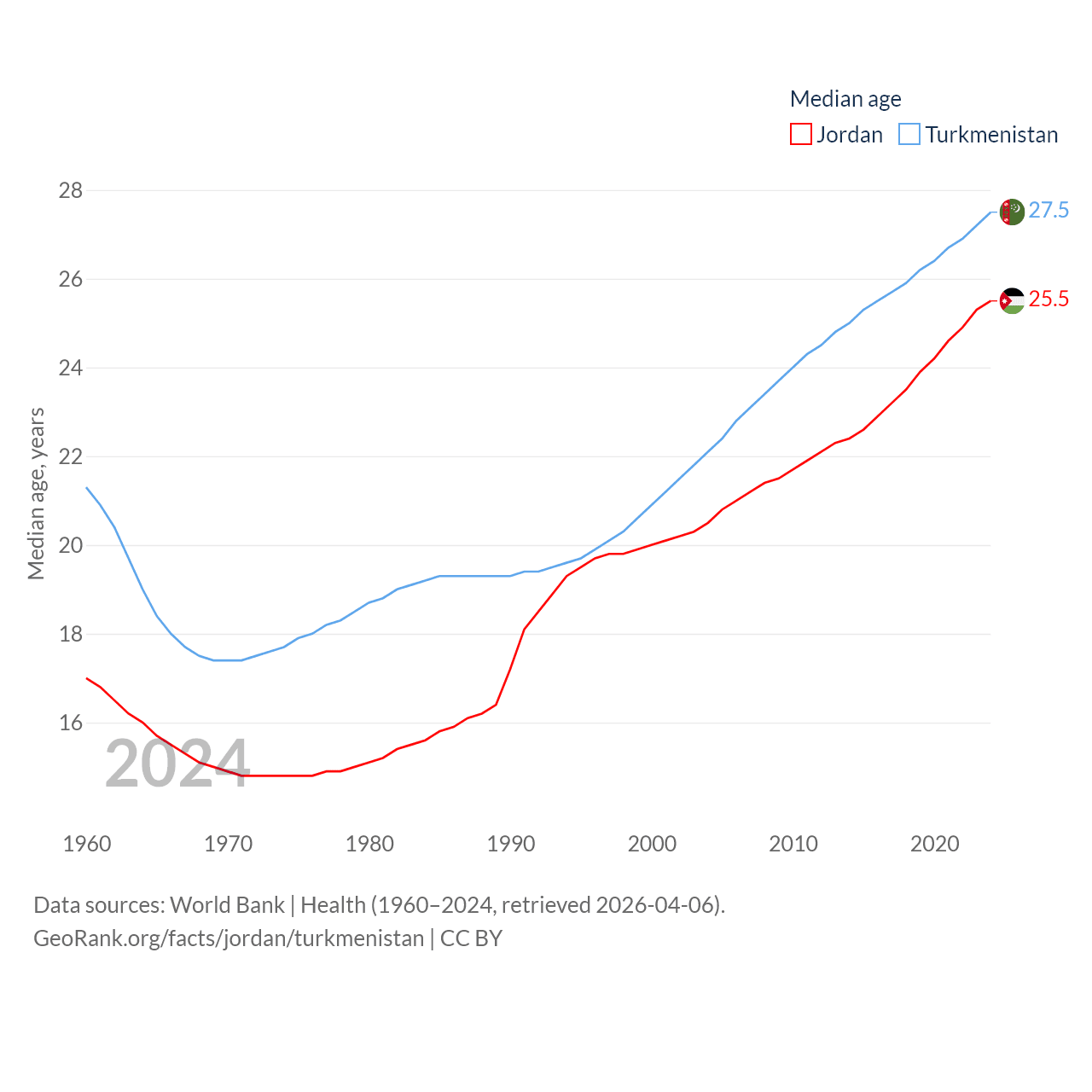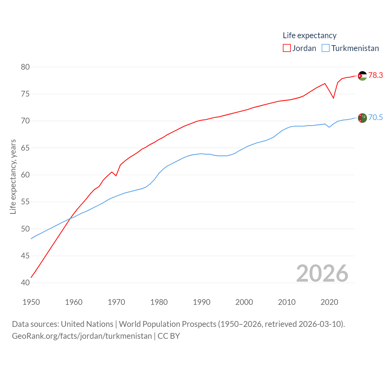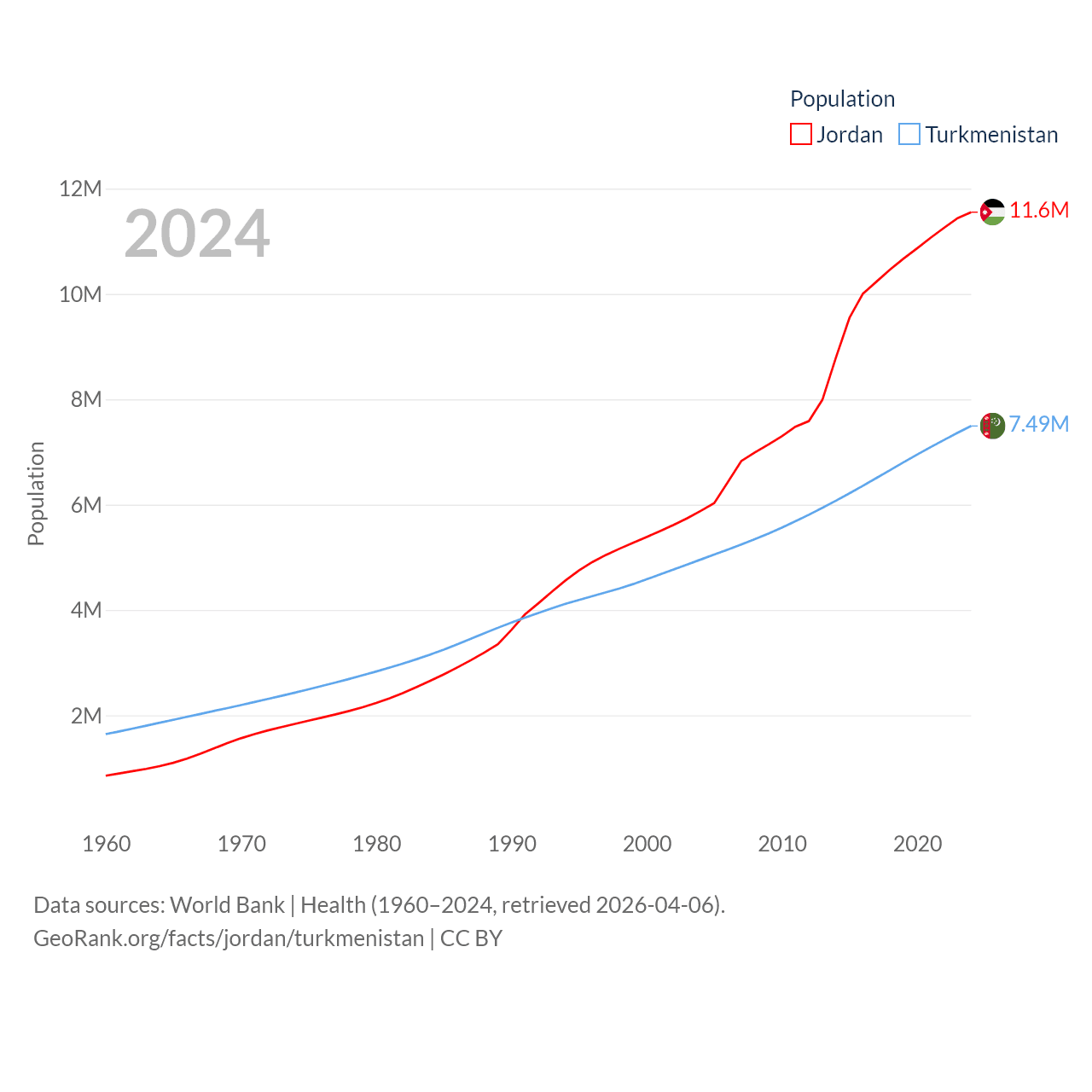 Jordan has a population of 11.6M (ranked 84/197), compared with 7.49M in Turkmenistan (ranked 104/197). Jordan's land area is 34,284 sq mi versus 181,441 sq mi for Turkmenistan (ranked 110th vs. 53rd).