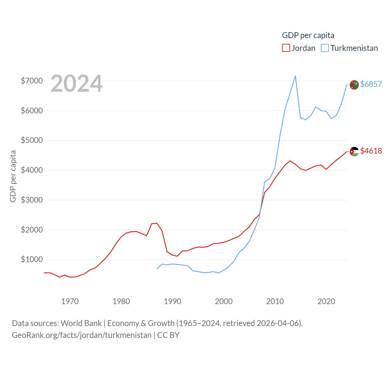 By GDP, Jordan ranks 90/197 ($53.4B) and Turkmenistan ranks 92/197 ($51.4B). By GDP per capita, Jordan ranks 123/197 ($4,618), while Turkmenistan ranks 104/197 ($6,857).
