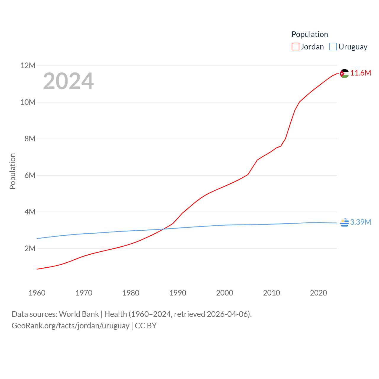 Jordan has a population of 11.6M (ranked 84/197), compared with 3.39M in Uruguay (ranked 133/197). Jordan's land area is 34,284 sq mi versus 67,576 sq mi for Uruguay (ranked 110th vs. 89th).