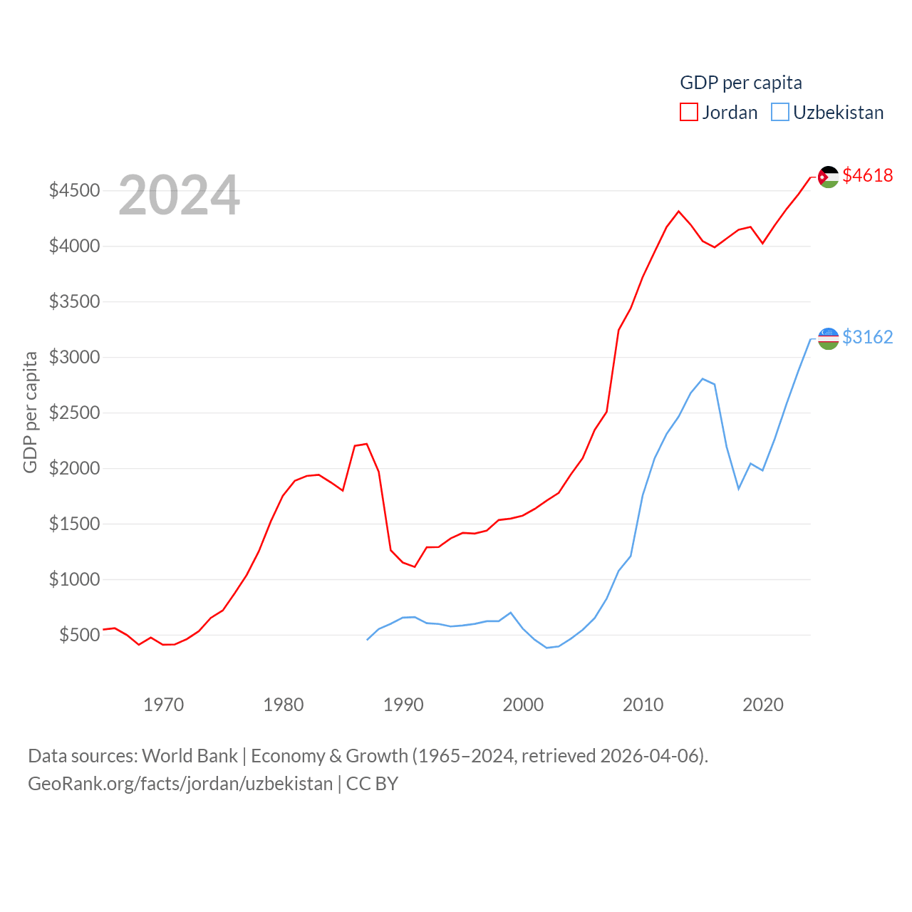 By GDP, Jordan ranks 90/197 ($53.4B) and Uzbekistan ranks 66/197 ($115B). By GDP per capita, Jordan ranks 123/197 ($4,618), while Uzbekistan ranks 139/197 ($3,162).