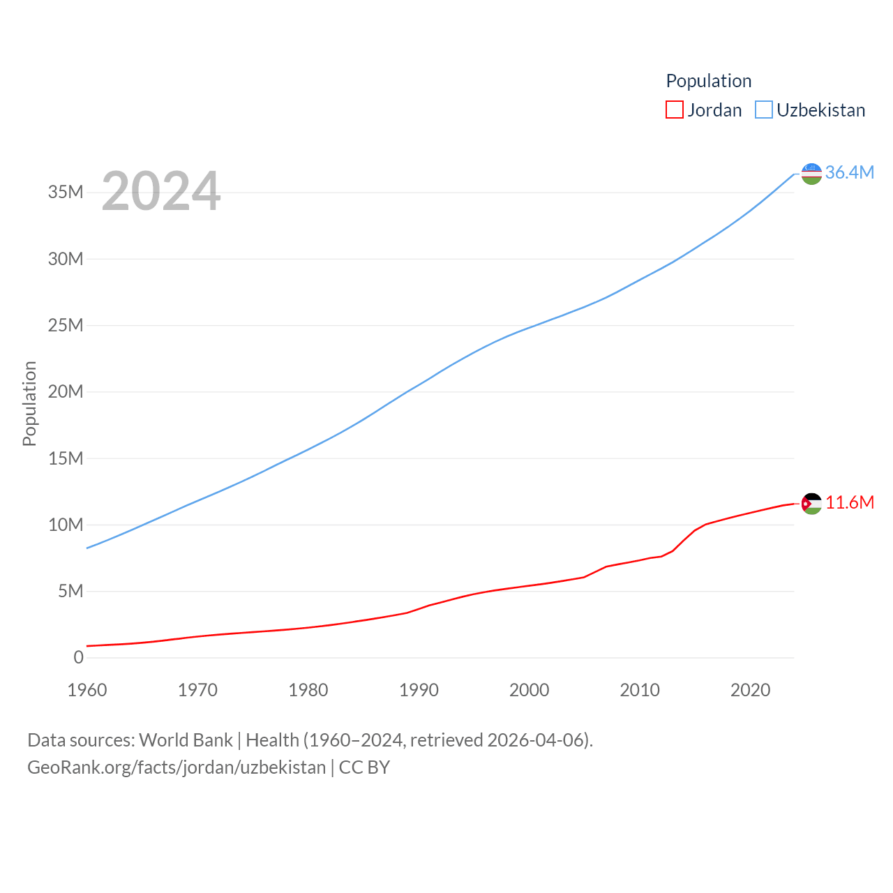 Jordan has a population of 11.6M (ranked 84/197), compared with 36.4M in Uzbekistan (ranked 43/197). Jordan's land area is 34,284 sq mi versus 170,136 sq mi for Uzbekistan (ranked 110th vs. 56th).