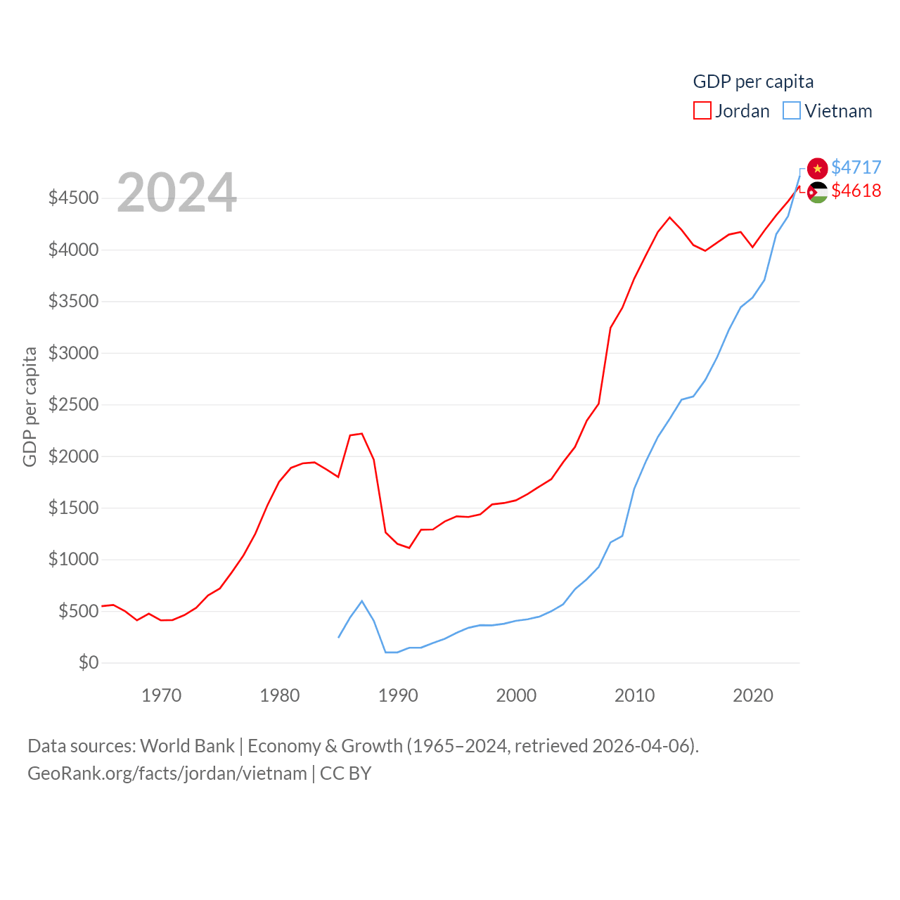 By GDP, Jordan ranks 90/197 ($53.4B) and Vietnam ranks 33/197 ($476B). By GDP per capita, Jordan ranks 123/197 ($4,618), while Vietnam ranks 122/197 ($4,717).