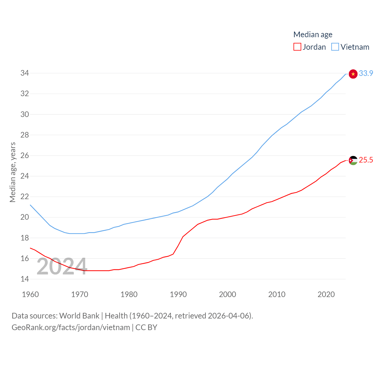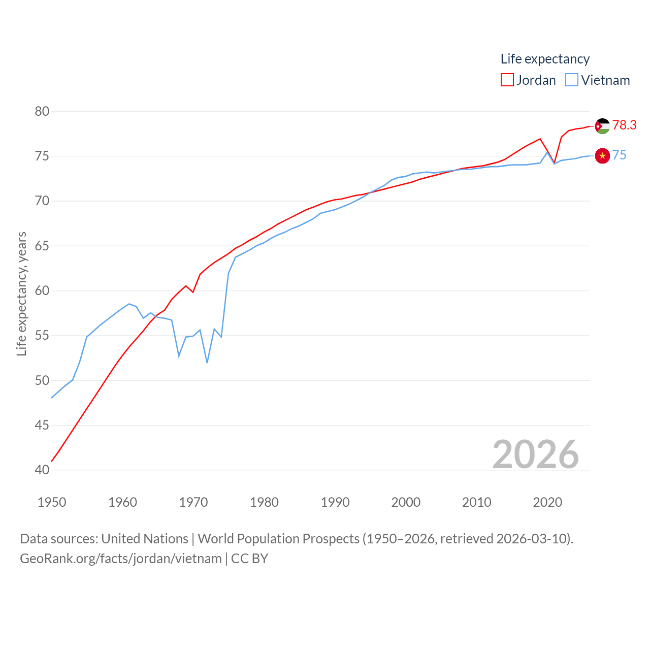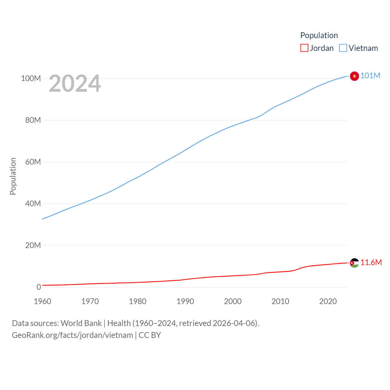 Jordan has a population of 11.6M (ranked 84/197), compared with 101M in Vietnam (ranked 16/197). Jordan's land area is 34,284 sq mi versus 121,016 sq mi for Vietnam (ranked 110th vs. 67th).