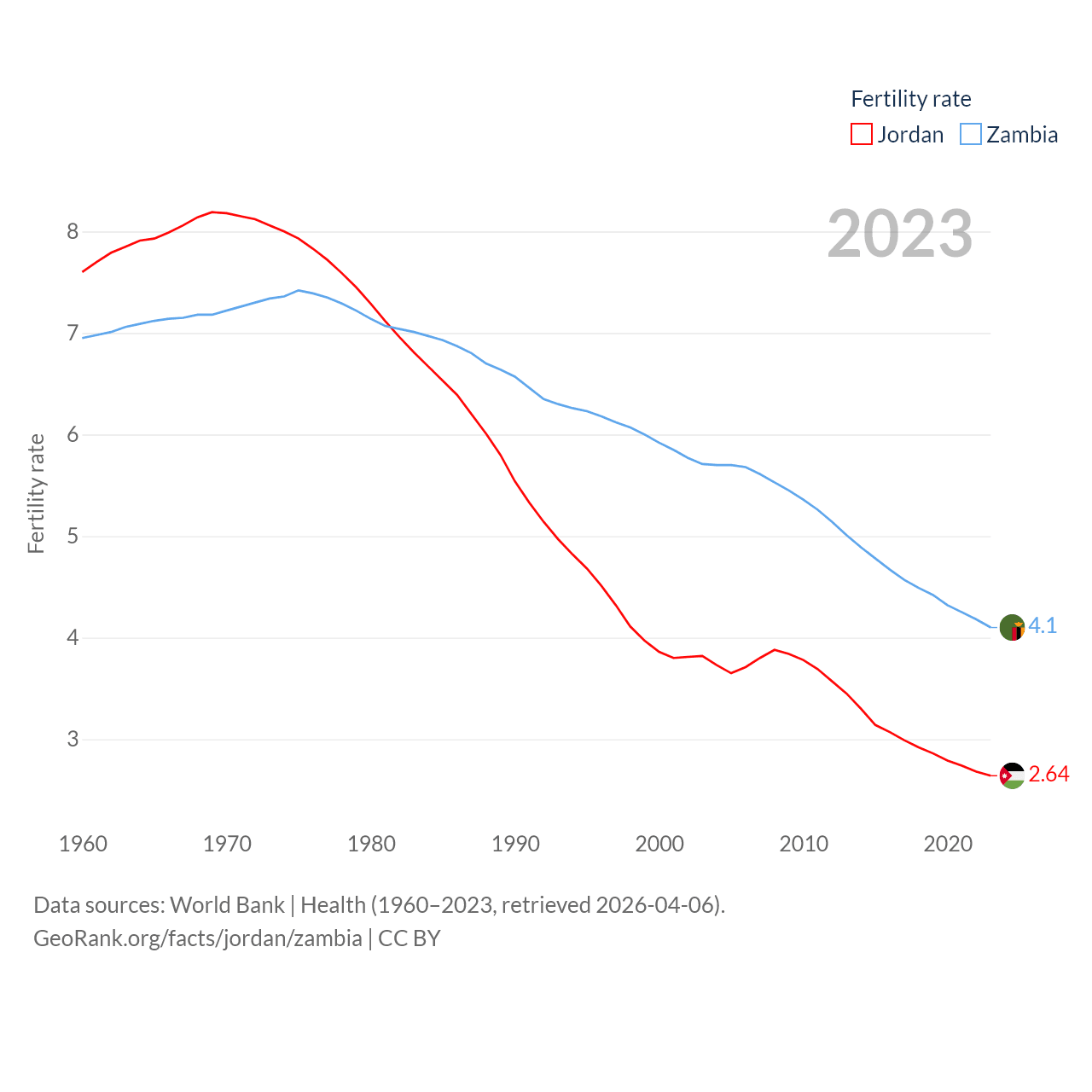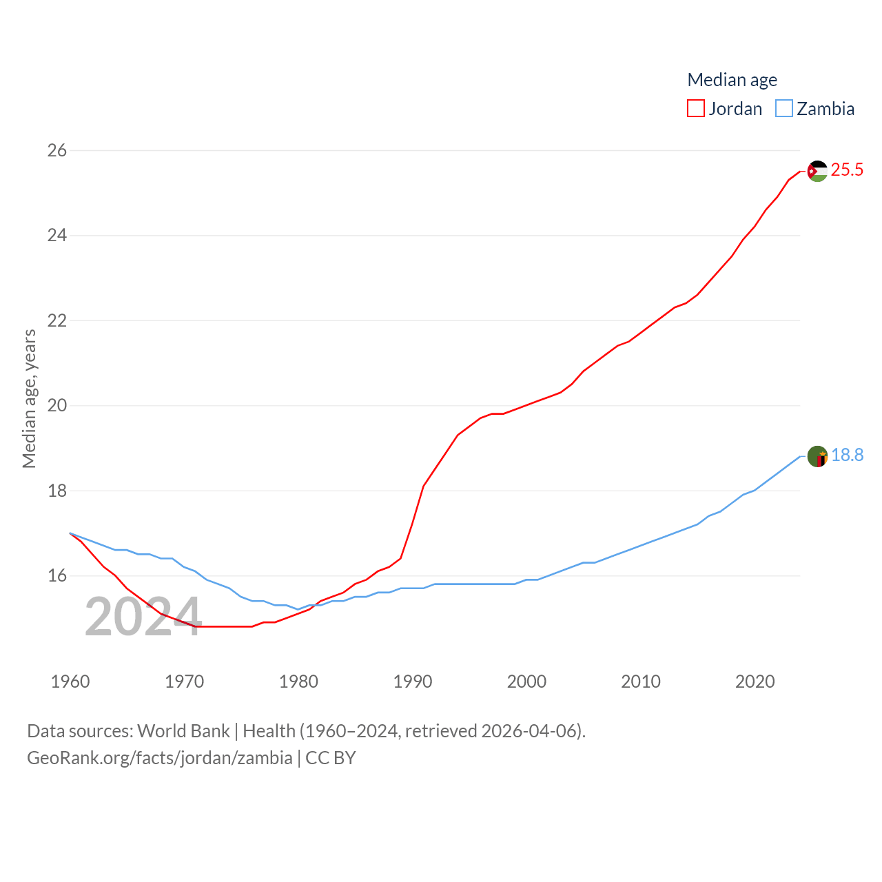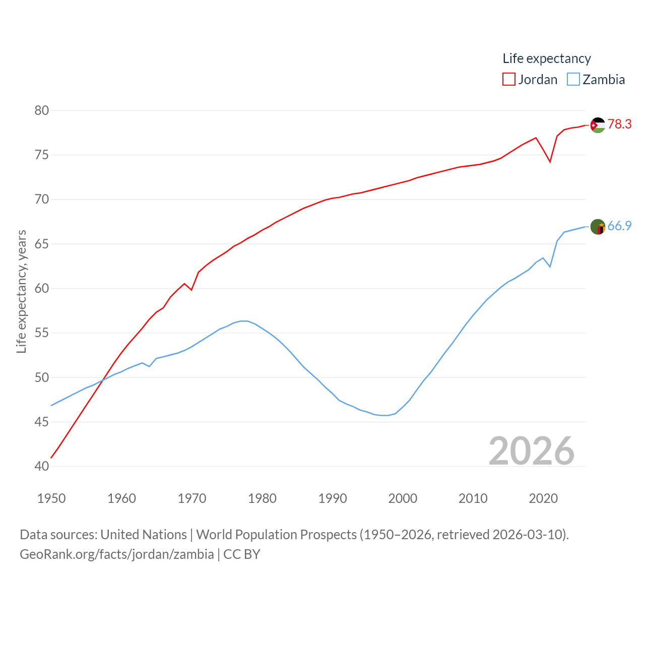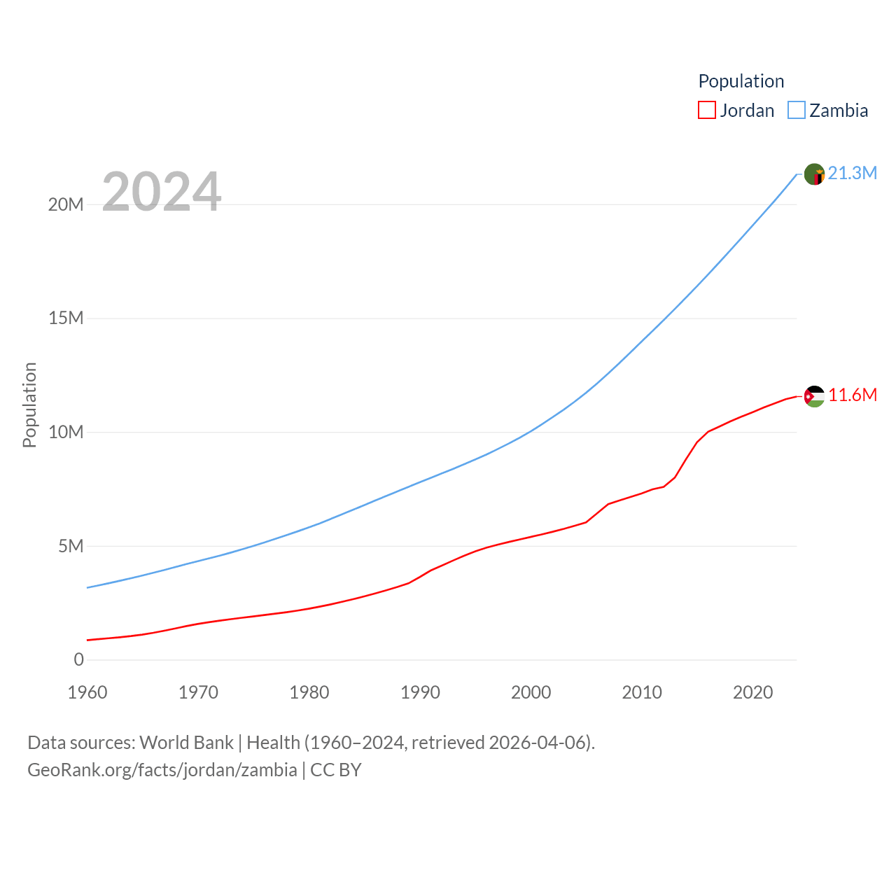 Jordan has a population of 11.6M (ranked 84/197), compared with 21.3M in Zambia (ranked 63/197). Jordan's land area is 34,284 sq mi versus 287,024 sq mi for Zambia (ranked 110th vs. 37th).