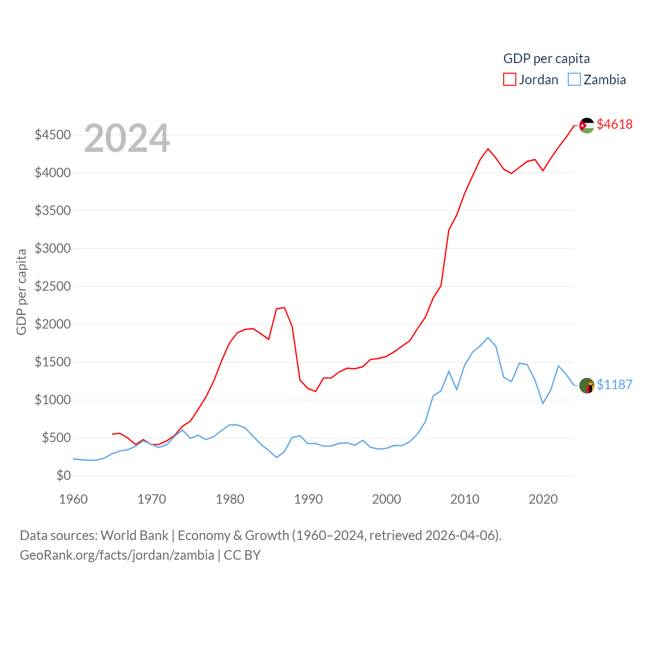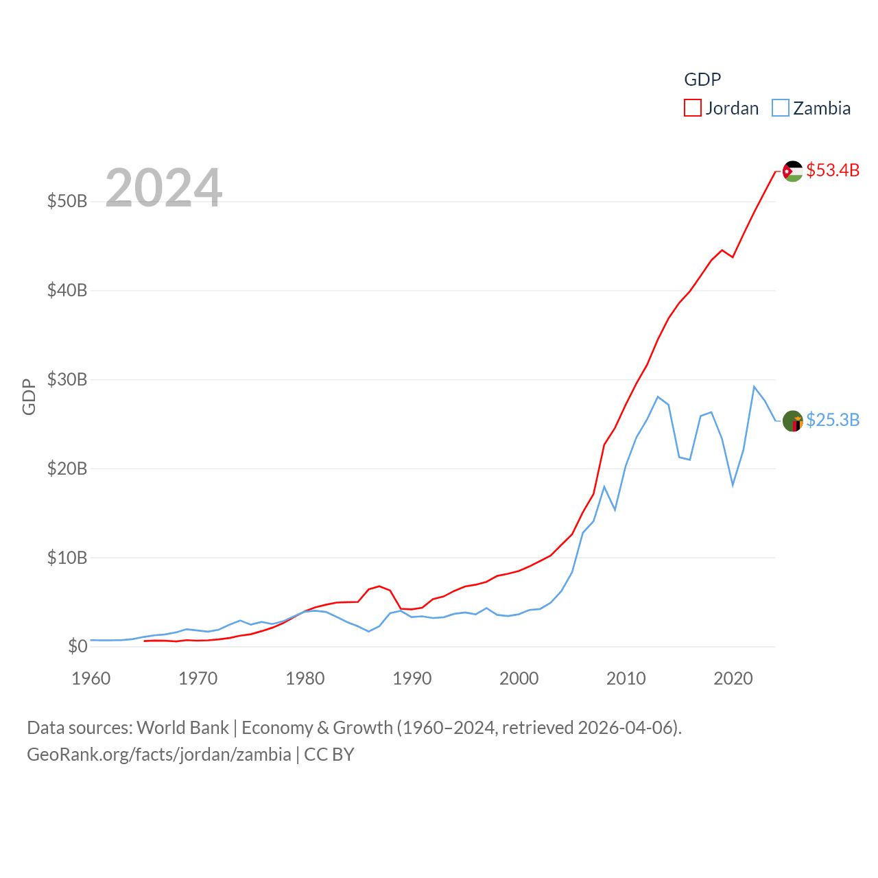By GDP, Jordan ranks 90/197 ($53.4B) and Zambia ranks 116/197 ($25.3B). By GDP per capita, Jordan ranks 123/197 ($4,618), while Zambia ranks 169/197 ($1,187).