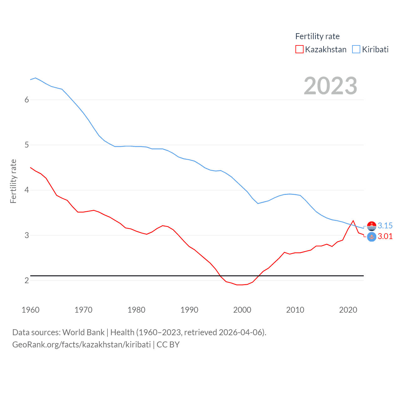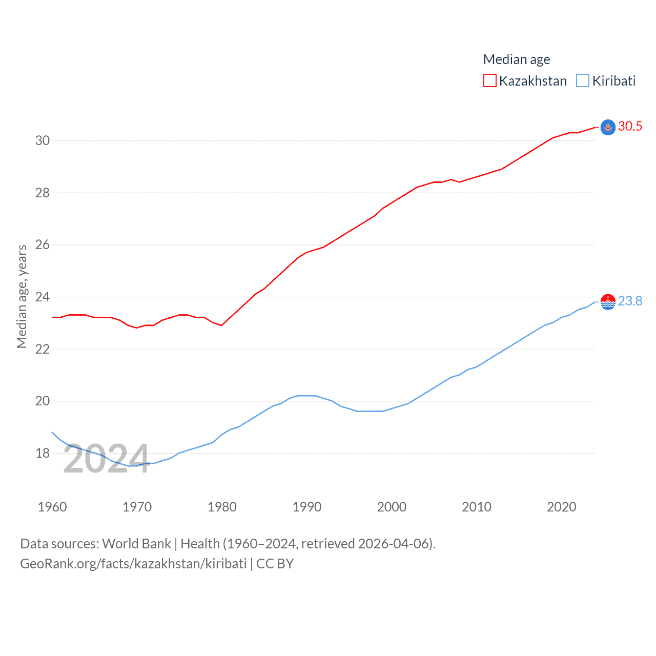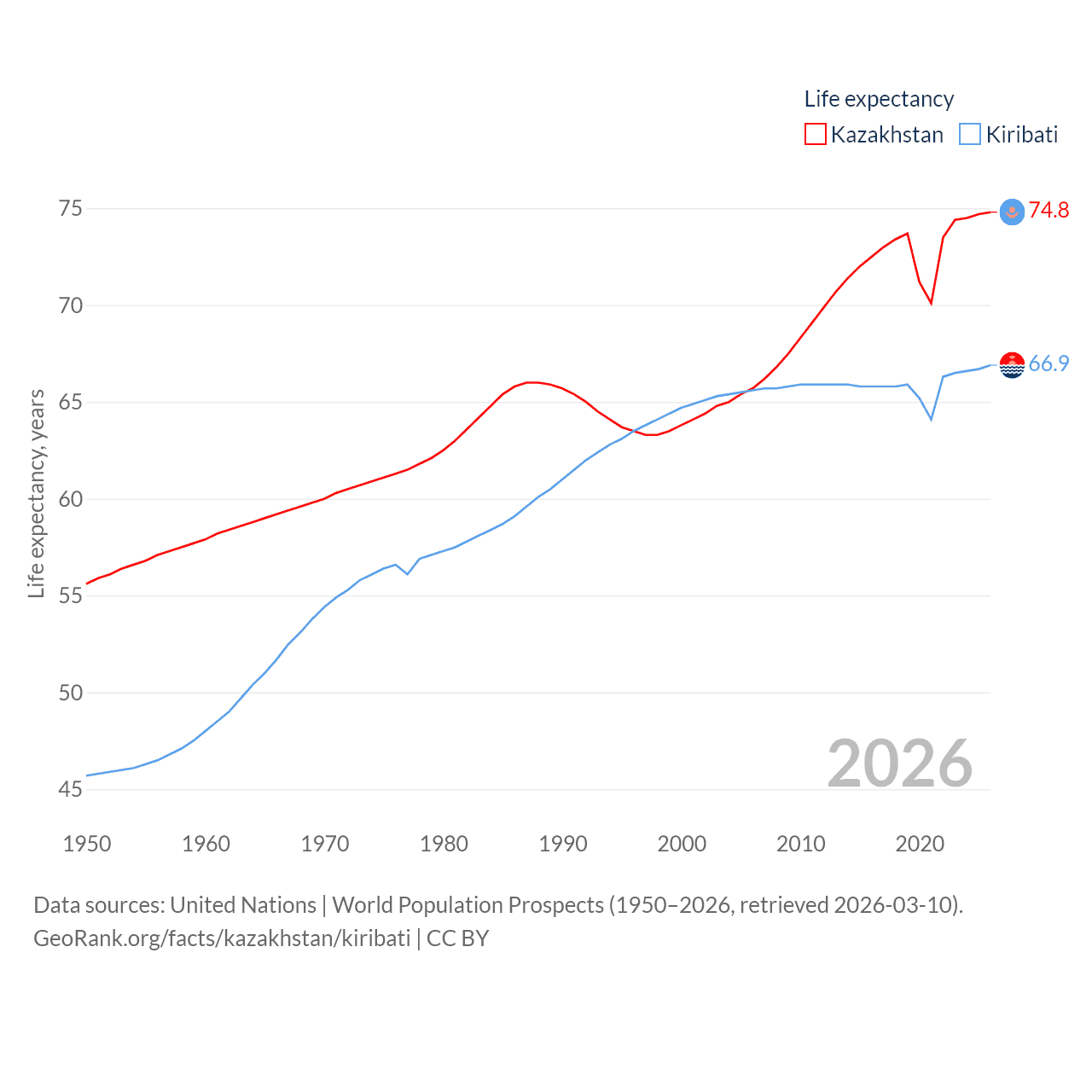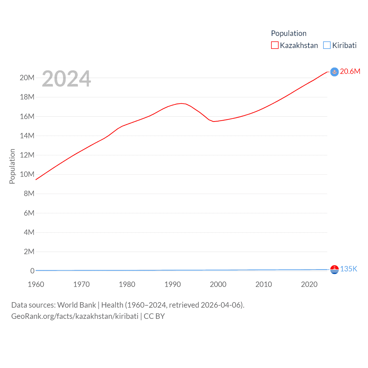 Kazakhstan has a population of 20.6M (ranked 64/197), compared with 135K in Kiribati (ranked 180/197). Kazakhstan's land area is 1,042,360 sq mi versus 313 sq mi for Kiribati (ranked 9th vs. 173rd).