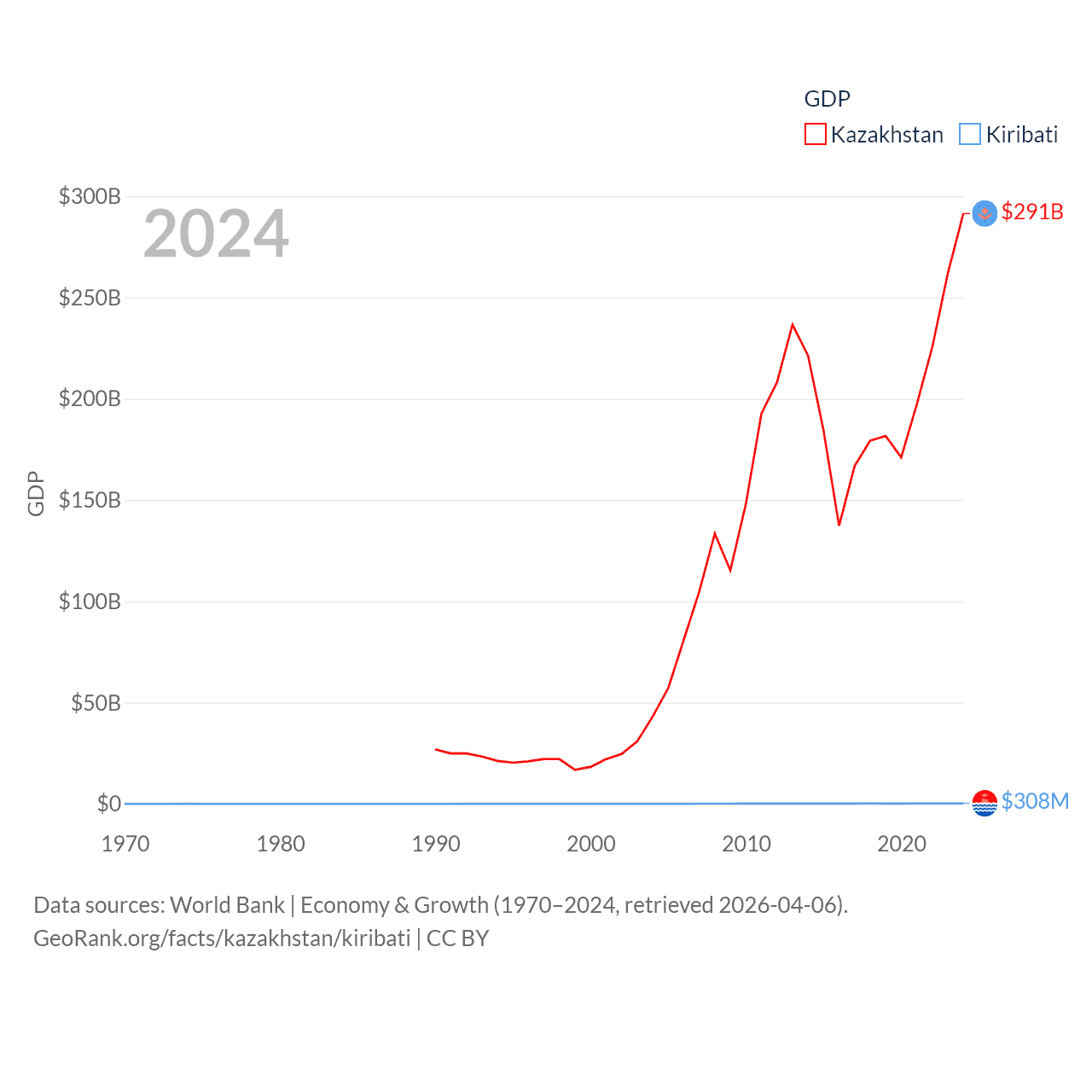 By GDP, Kazakhstan ranks 48/197 ($291B) and Kiribati ranks 192/197 ($308M). By GDP per capita, Kazakhstan ranks 71/197 ($14,155), while Kiribati ranks 152/197 ($2,289).