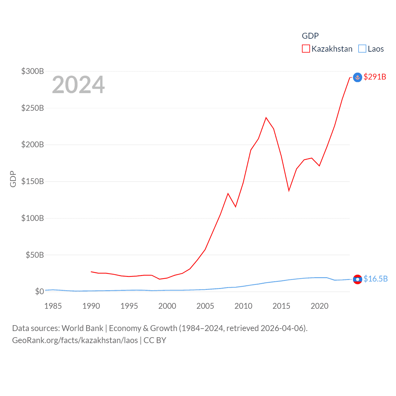 By GDP, Kazakhstan ranks 48/197 ($291B) and Laos ranks 139/197 ($16.5B). By GDP per capita, Kazakhstan ranks 71/197 ($14,155), while Laos ranks 155/197 ($2,124).