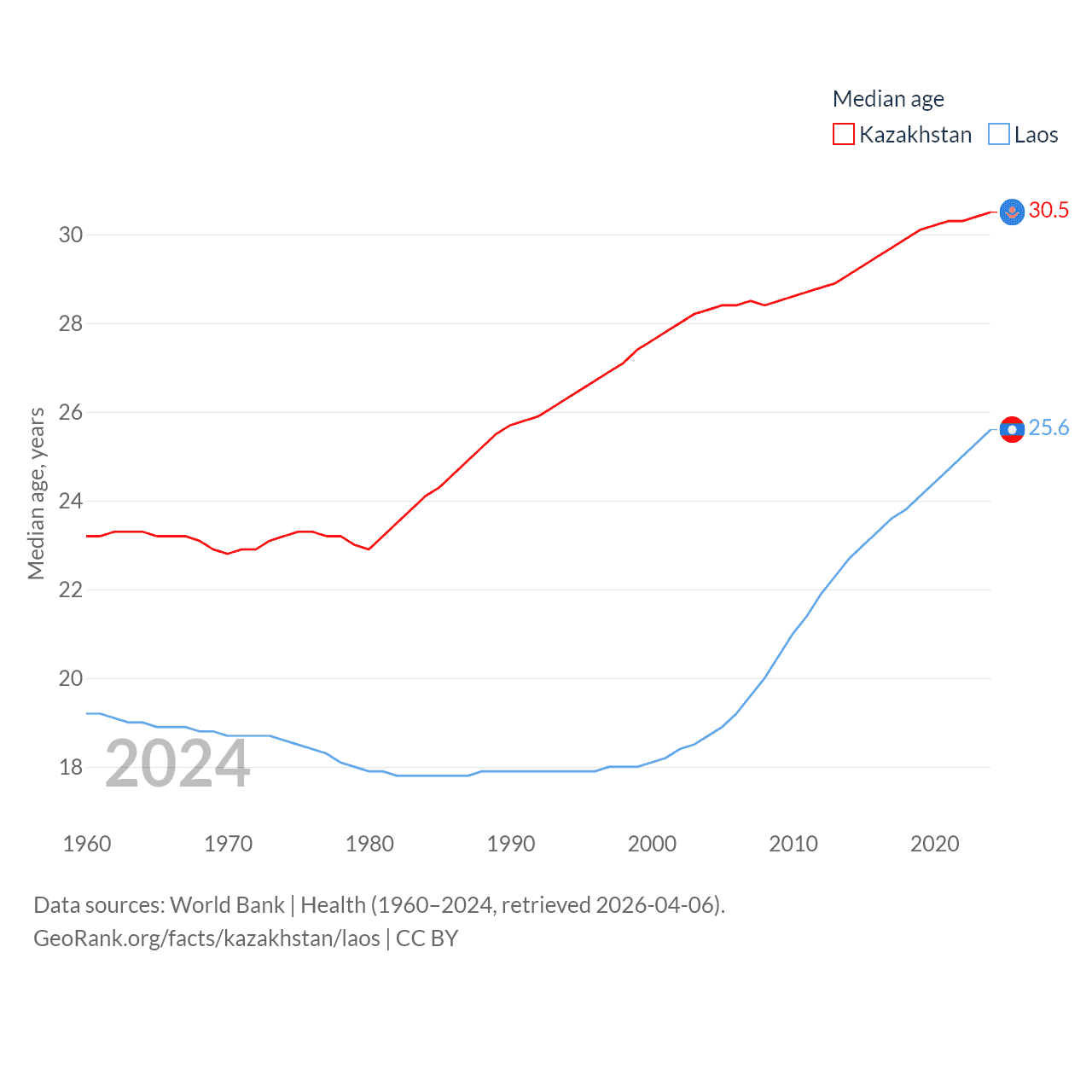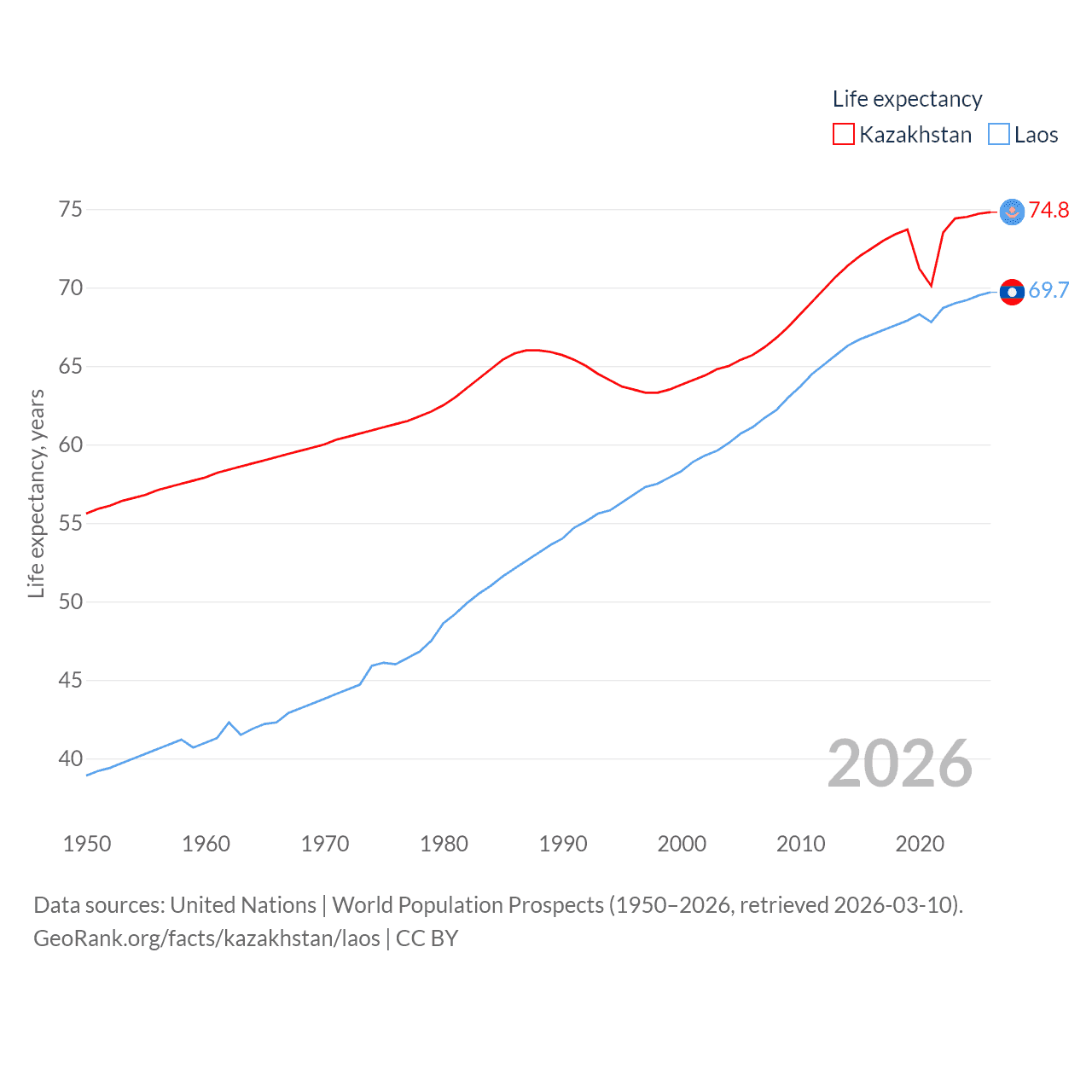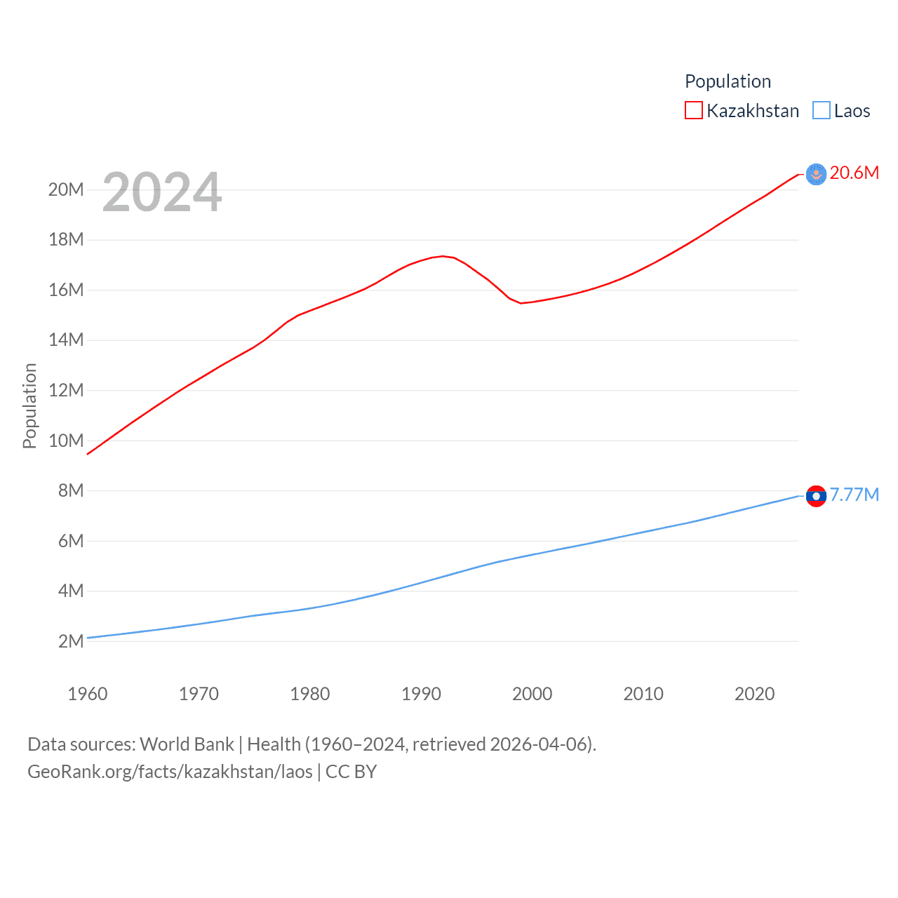 Kazakhstan has a population of 20.6M (ranked 64/197), compared with 7.77M in Laos (ranked 103/197). Kazakhstan's land area is 1,042,360 sq mi versus 89,112 sq mi for Laos (ranked 9th vs. 79th).