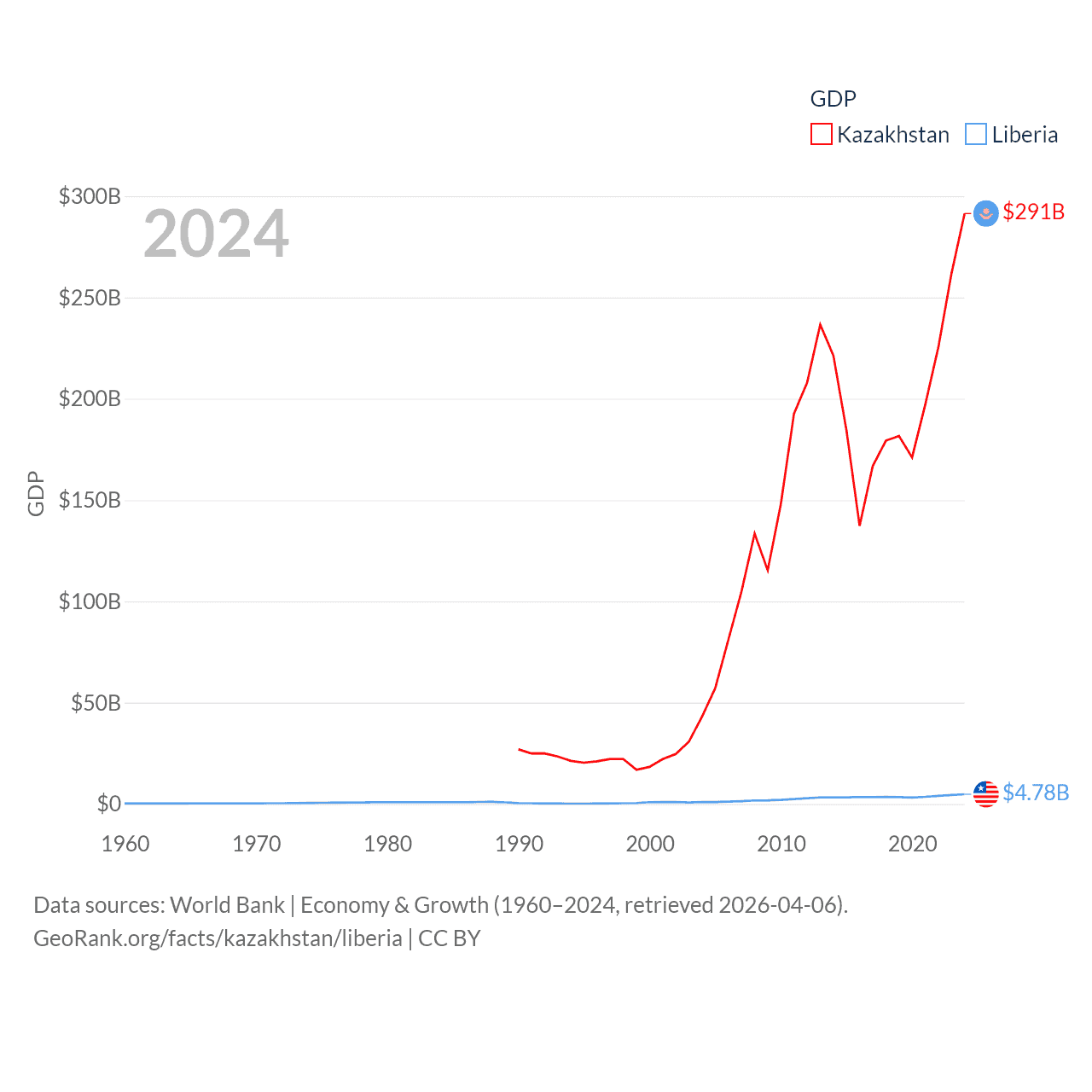 By GDP, Kazakhstan ranks 48/197 ($291B) and Liberia ranks 163/197 ($4.78B). By GDP per capita, Kazakhstan ranks 71/197 ($14,155), while Liberia ranks 184/197 ($851).