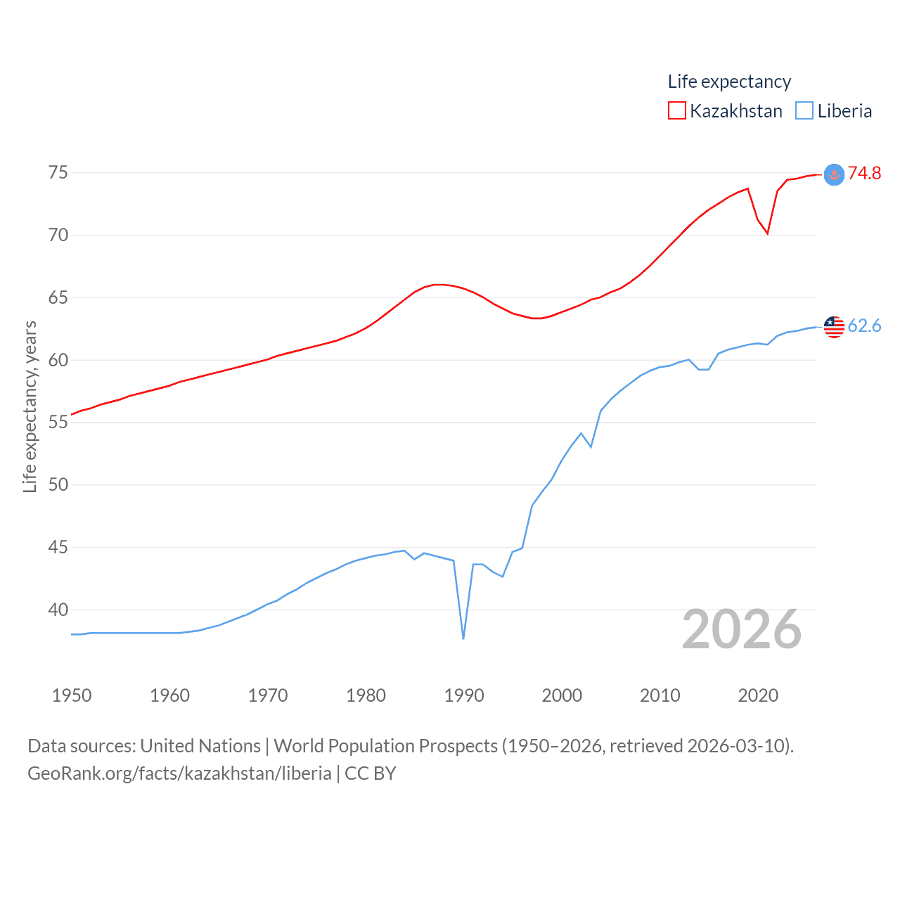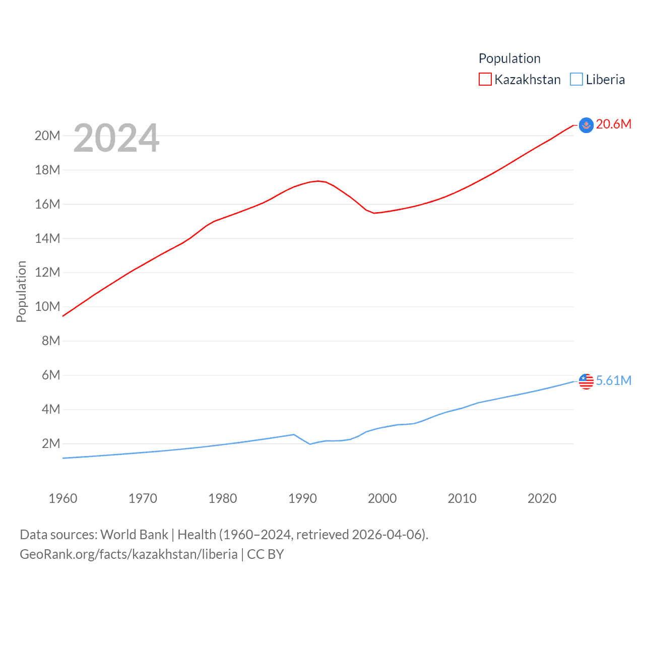 Kazakhstan has a population of 20.6M (ranked 64/197), compared with 5.61M in Liberia (ranked 117/197). Kazakhstan's land area is 1,042,360 sq mi versus 37,189 sq mi for Liberia (ranked 9th vs. 106th).