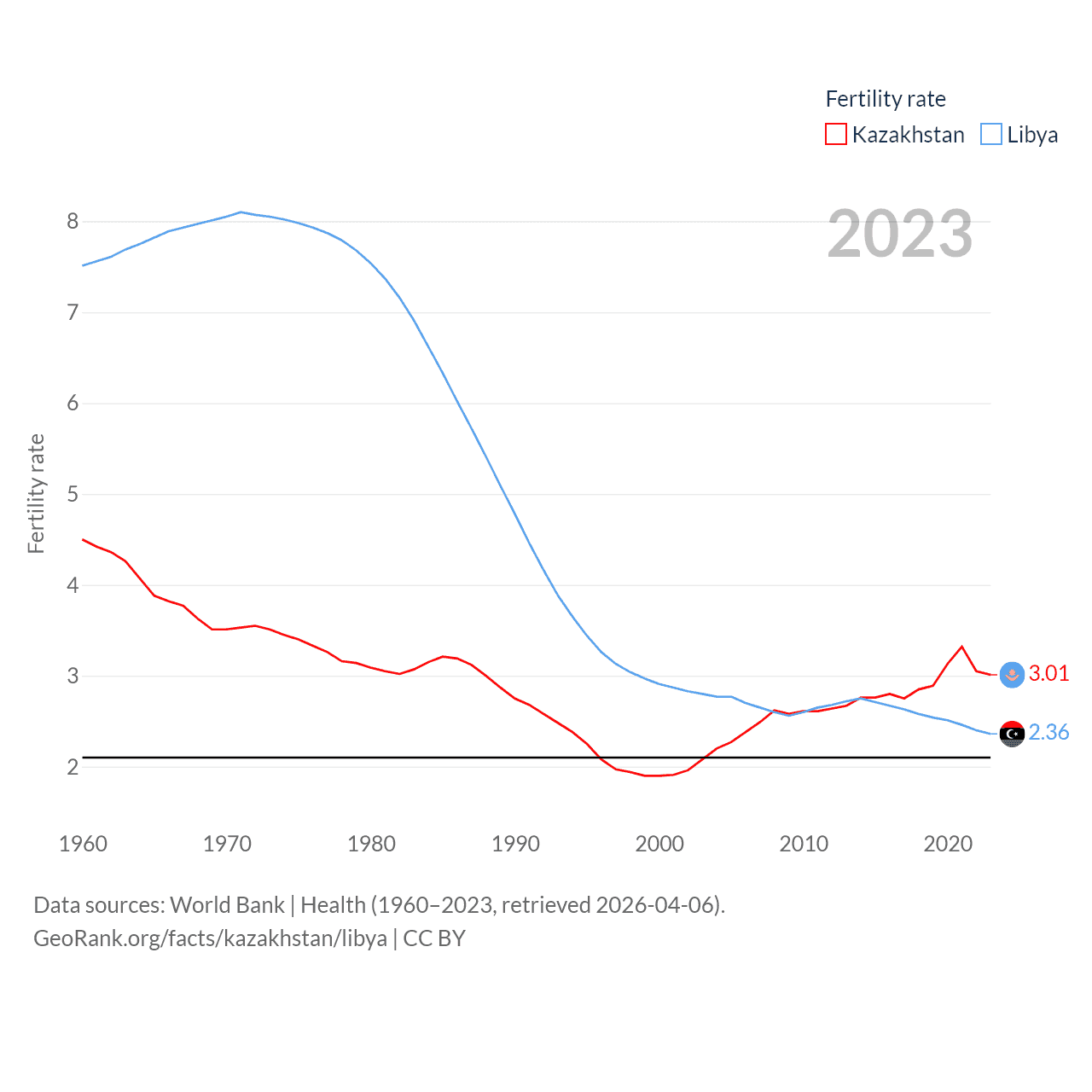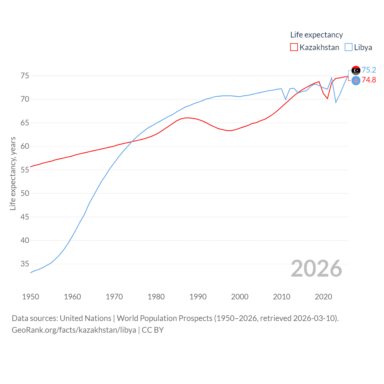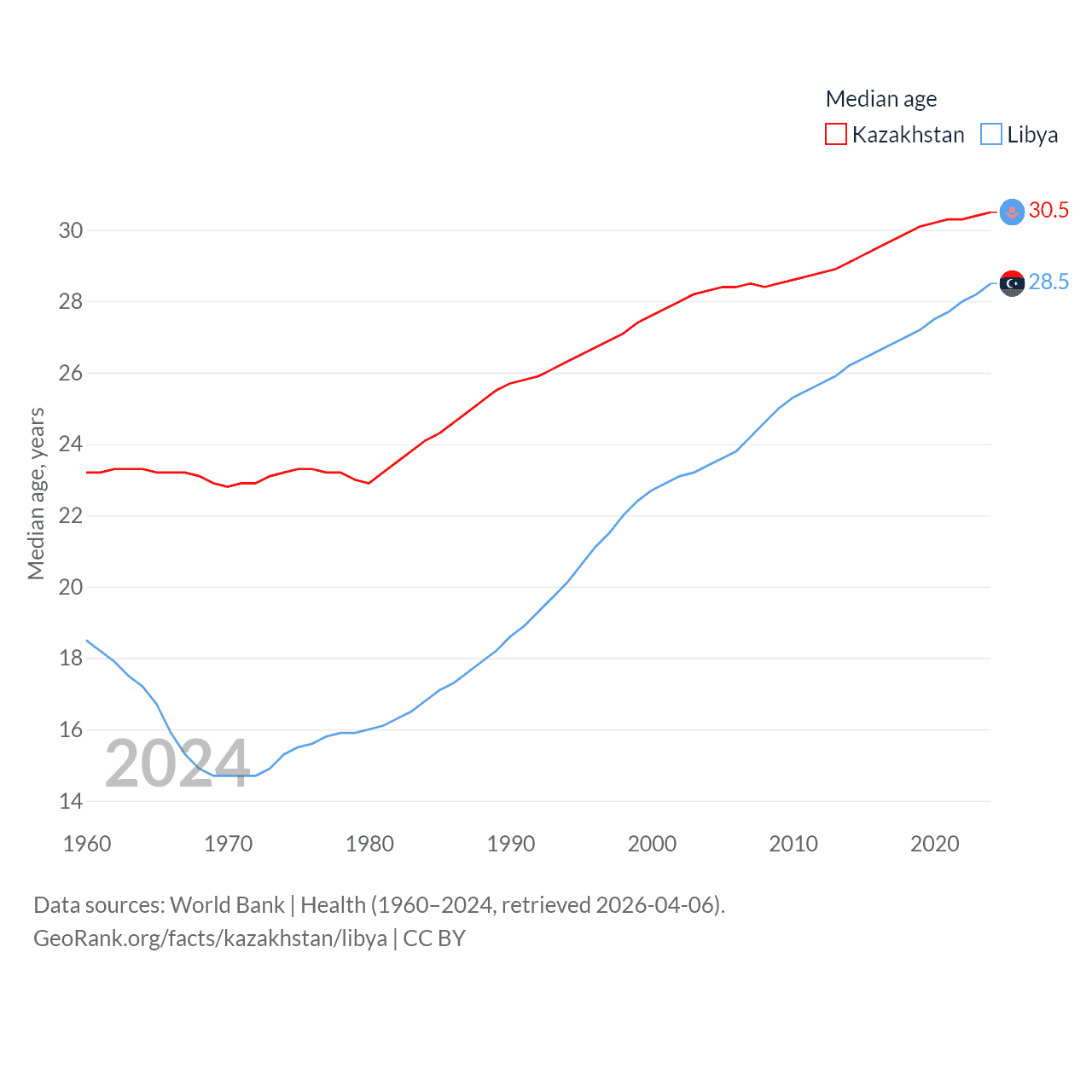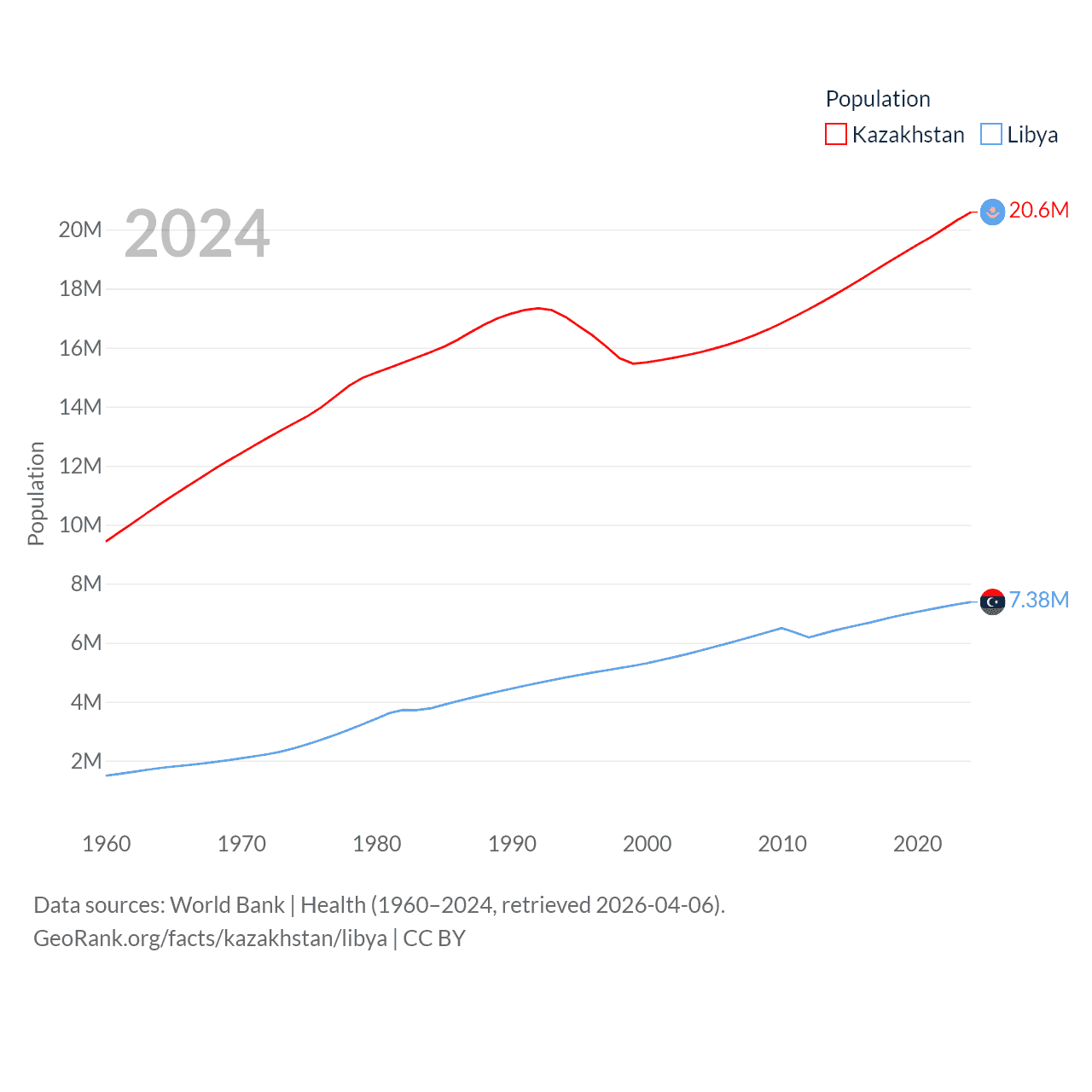 Kazakhstan has a population of 20.6M (ranked 64/197), compared with 7.38M in Libya (ranked 105/197). Kazakhstan's land area is 1,042,360 sq mi versus 679,362 sq mi for Libya (ranked 9th vs. 16th).