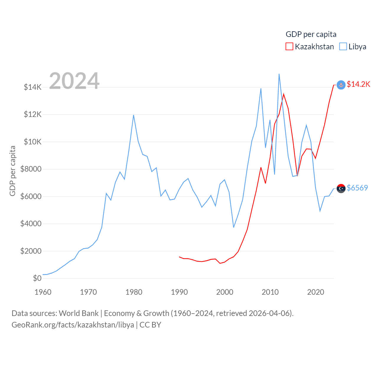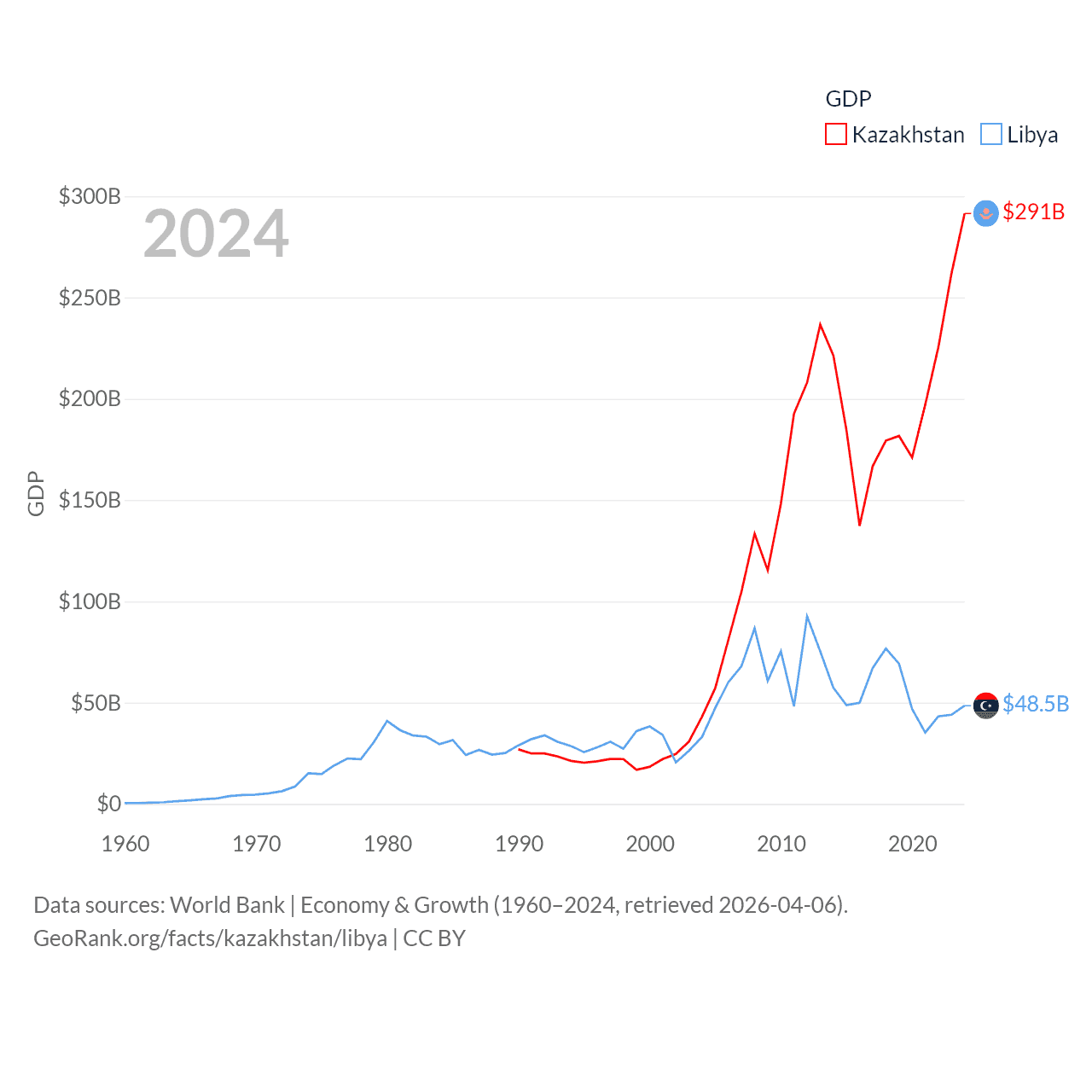By GDP, Kazakhstan ranks 48/197 ($291B) and Libya ranks 95/197 ($48.5B). By GDP per capita, Kazakhstan ranks 71/197 ($14,155), while Libya ranks 107/197 ($6,569).