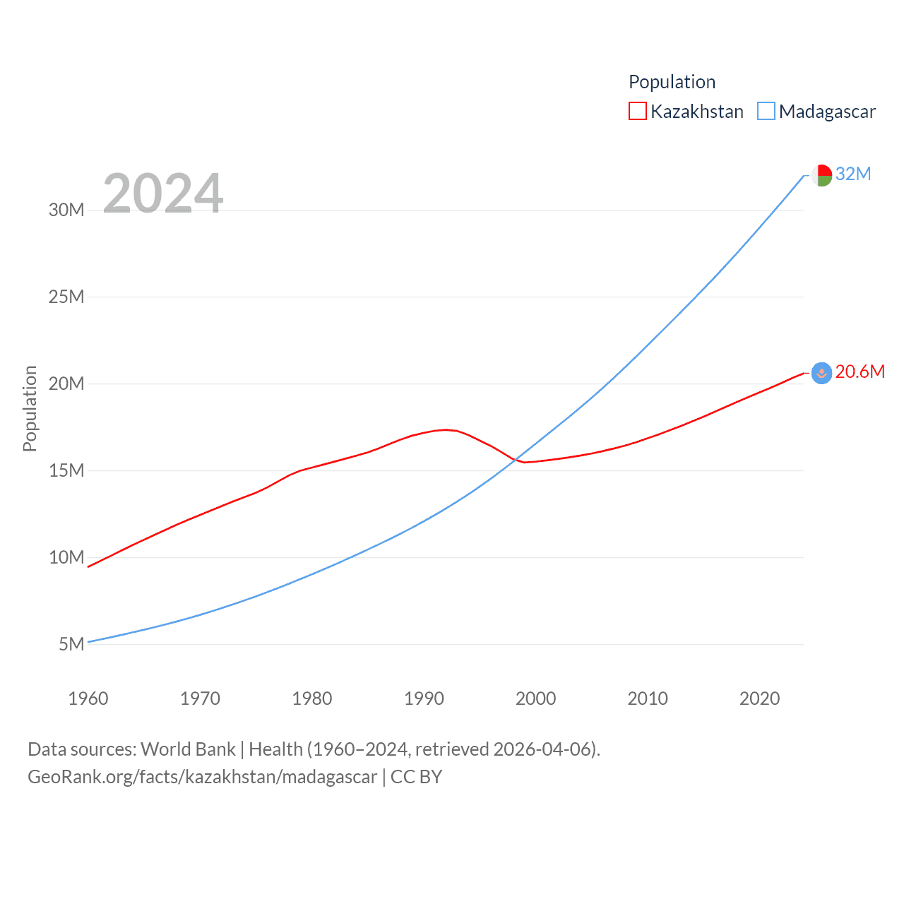 Kazakhstan has a population of 20.6M (ranked 64/197), compared with 32M in Madagascar (ranked 49/197). Kazakhstan's land area is 1,042,360 sq mi versus 224,634 sq mi for Madagascar (ranked 9th vs. 44th).