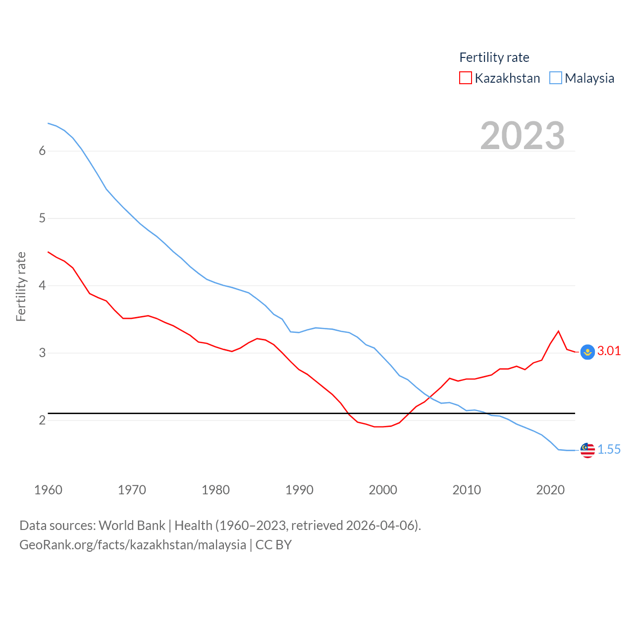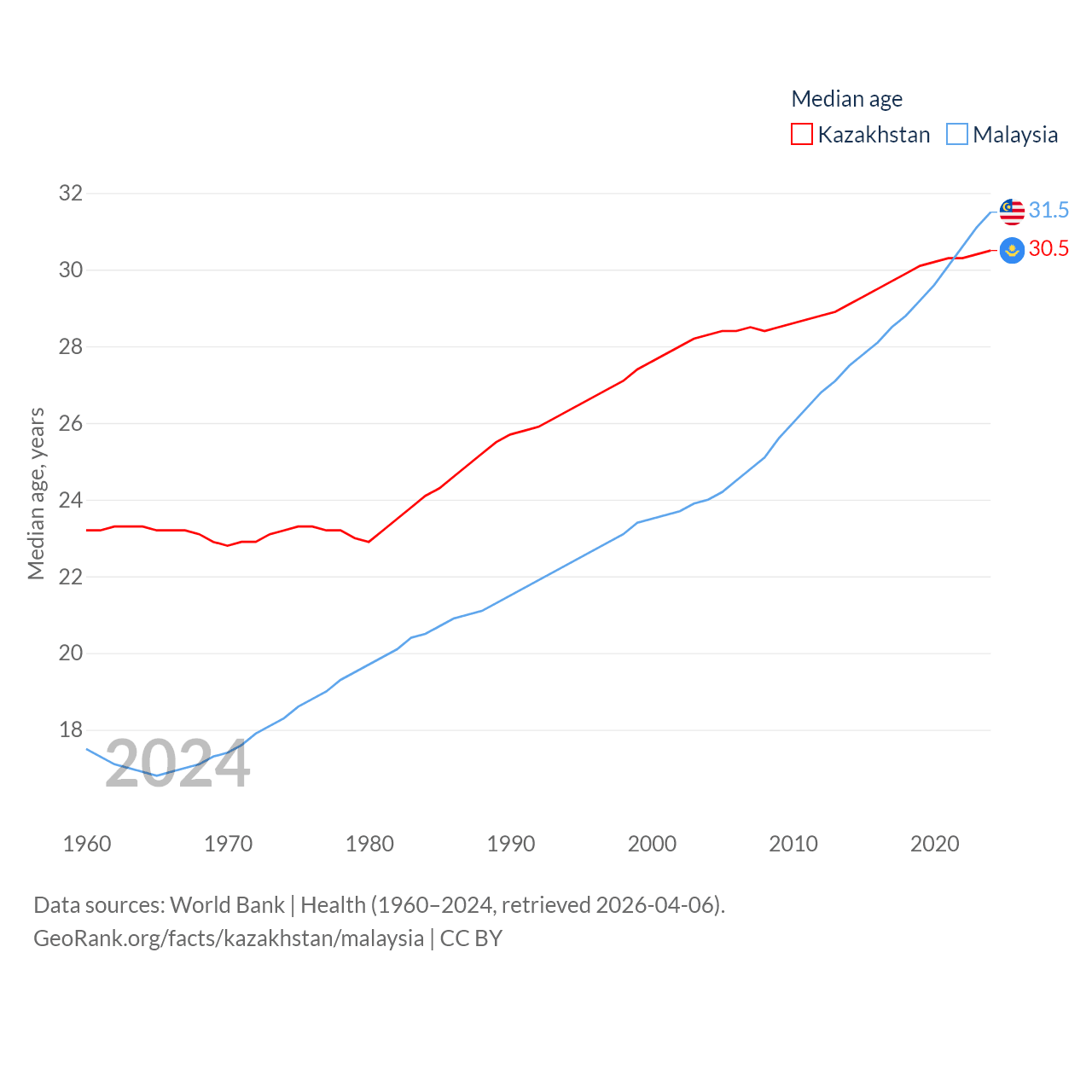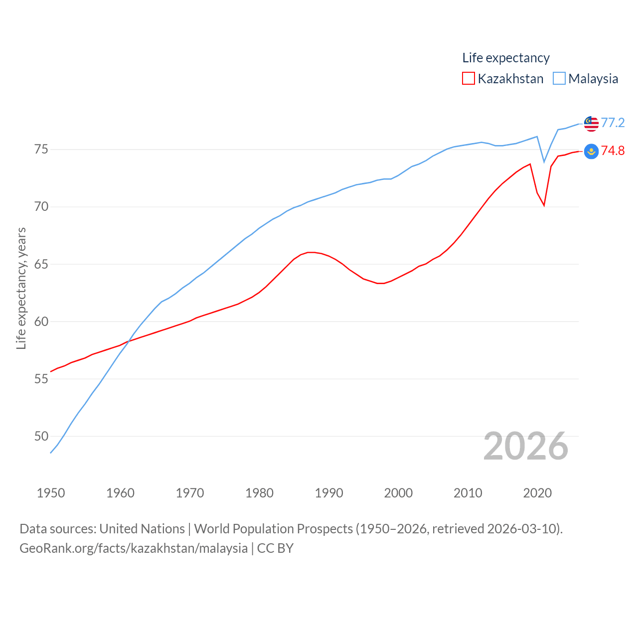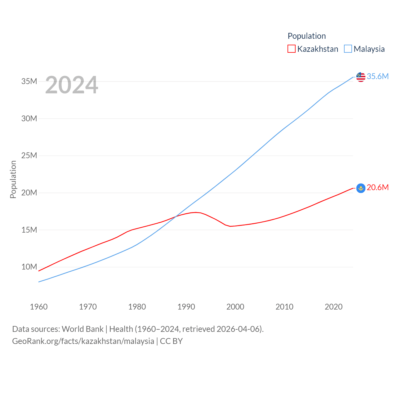 Kazakhstan has a population of 20.6M (ranked 64/197), compared with 35.6M in Malaysia (ranked 44/197). Kazakhstan's land area is 1,042,360 sq mi versus 126,854 sq mi for Malaysia (ranked 9th vs. 65th).