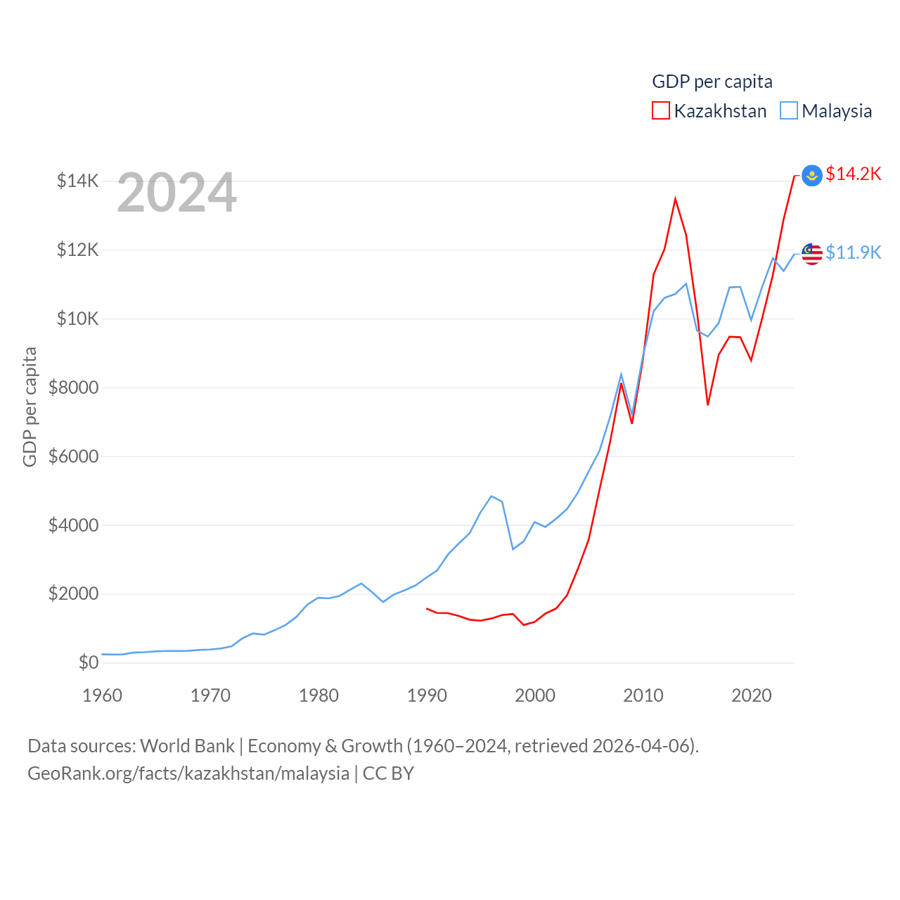 By GDP, Kazakhstan ranks 48/197 ($291B) and Malaysia ranks 38/197 ($422B). By GDP per capita, Kazakhstan ranks 71/197 ($14,155), while Malaysia ranks 79/197 ($11,874).