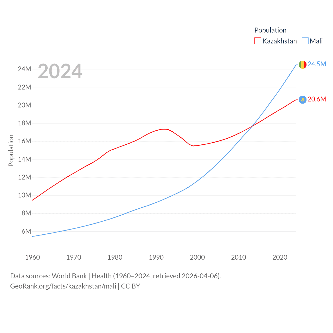 Kazakhstan has a population of 20.6M (ranked 64/197), compared with 24.5M in Mali (ranked 58/197). Kazakhstan's land area is 1,042,360 sq mi versus 471,118 sq mi for Mali (ranked 9th vs. 23rd).