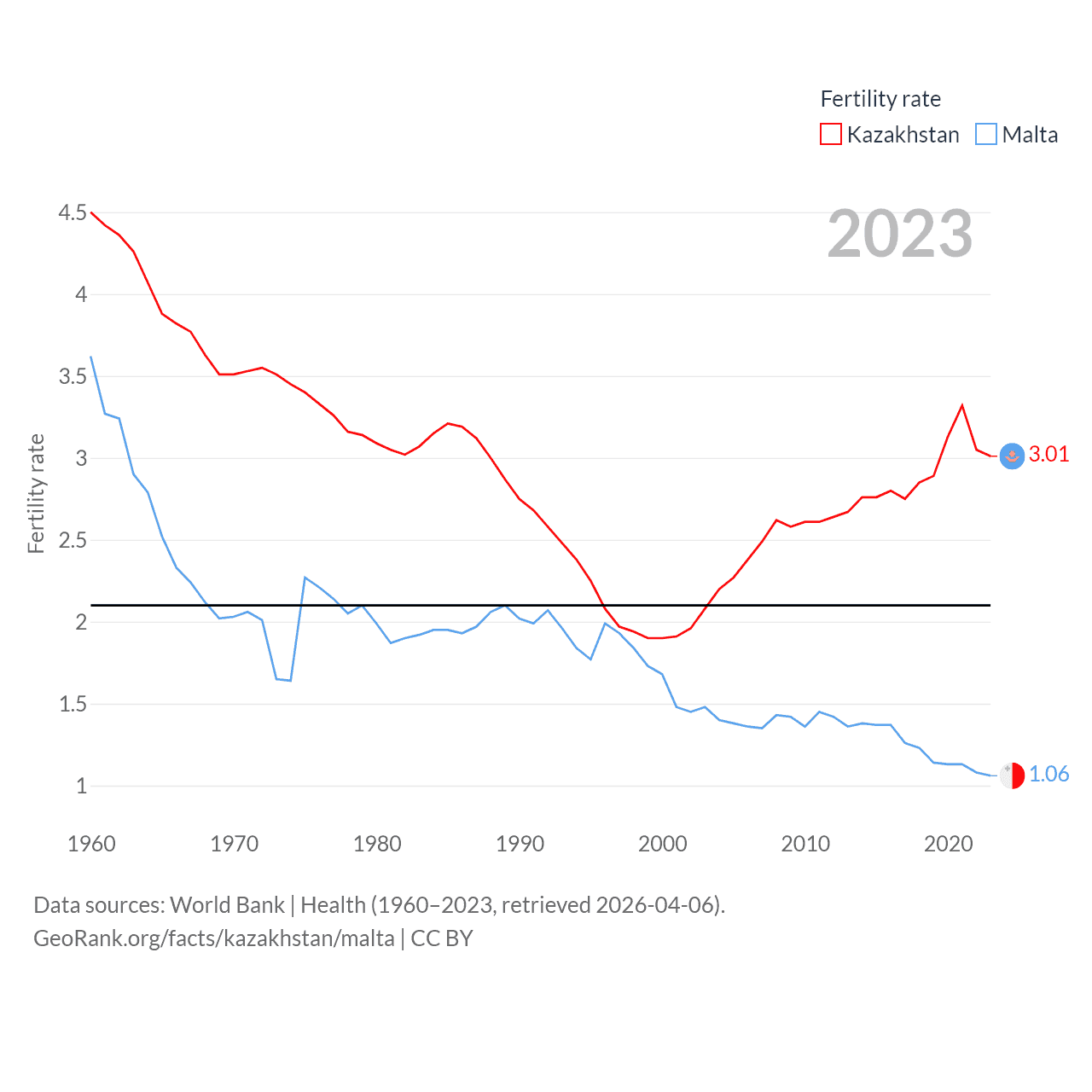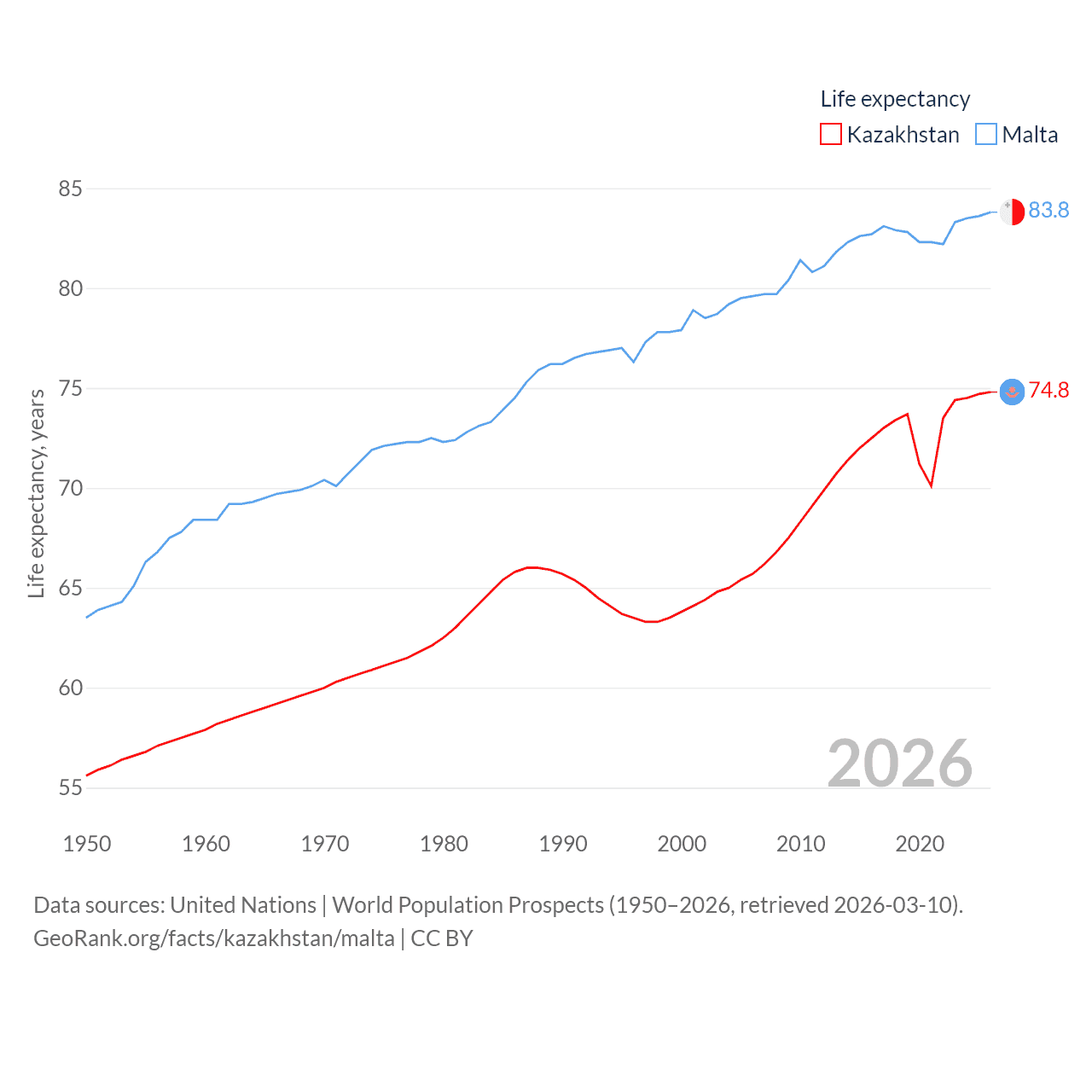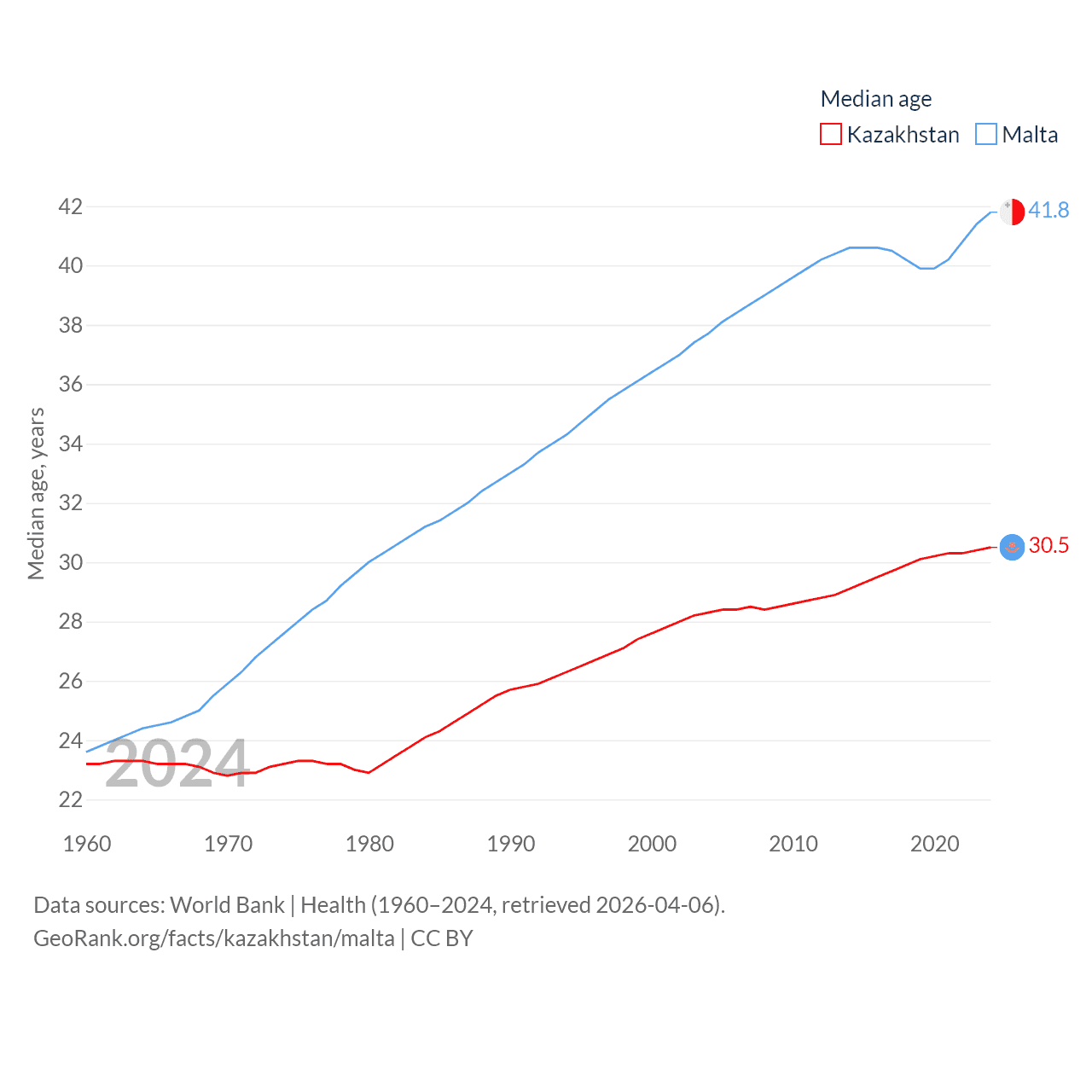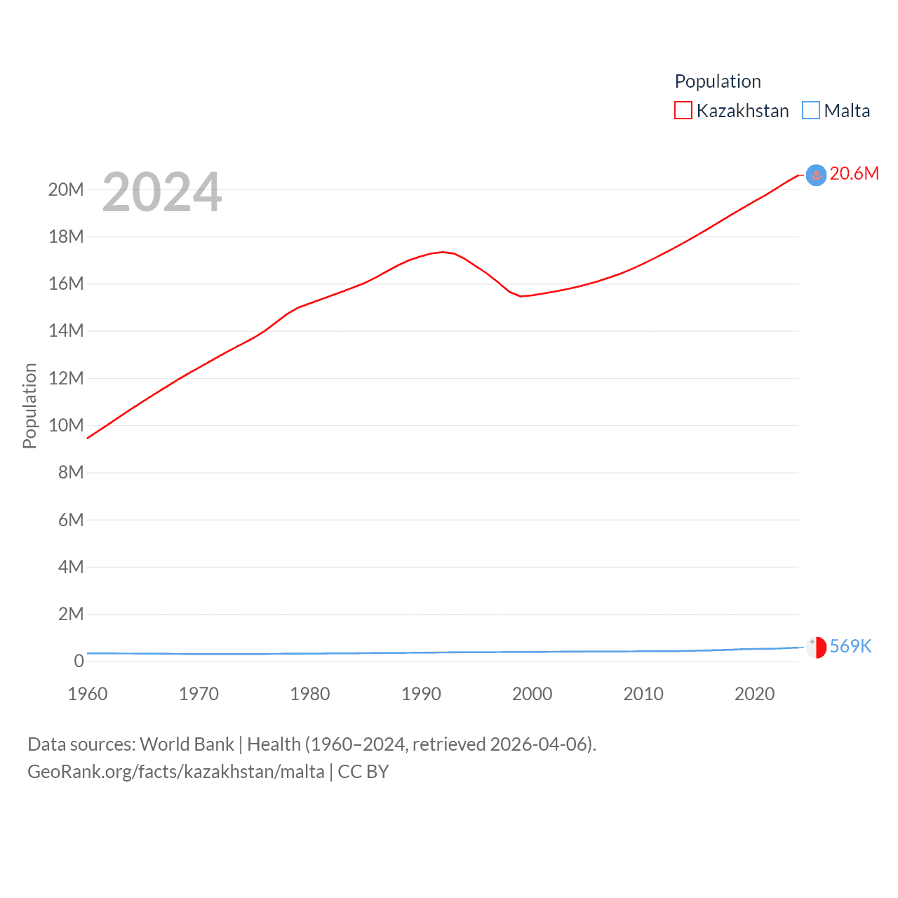 Kazakhstan has a population of 20.6M (ranked 64/197), compared with 569K in Malta (ranked 167/197). Kazakhstan's land area is 1,042,360 sq mi versus 123.6 sq mi for Malta (ranked 9th vs. 187th).