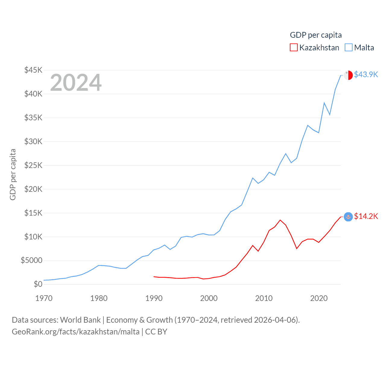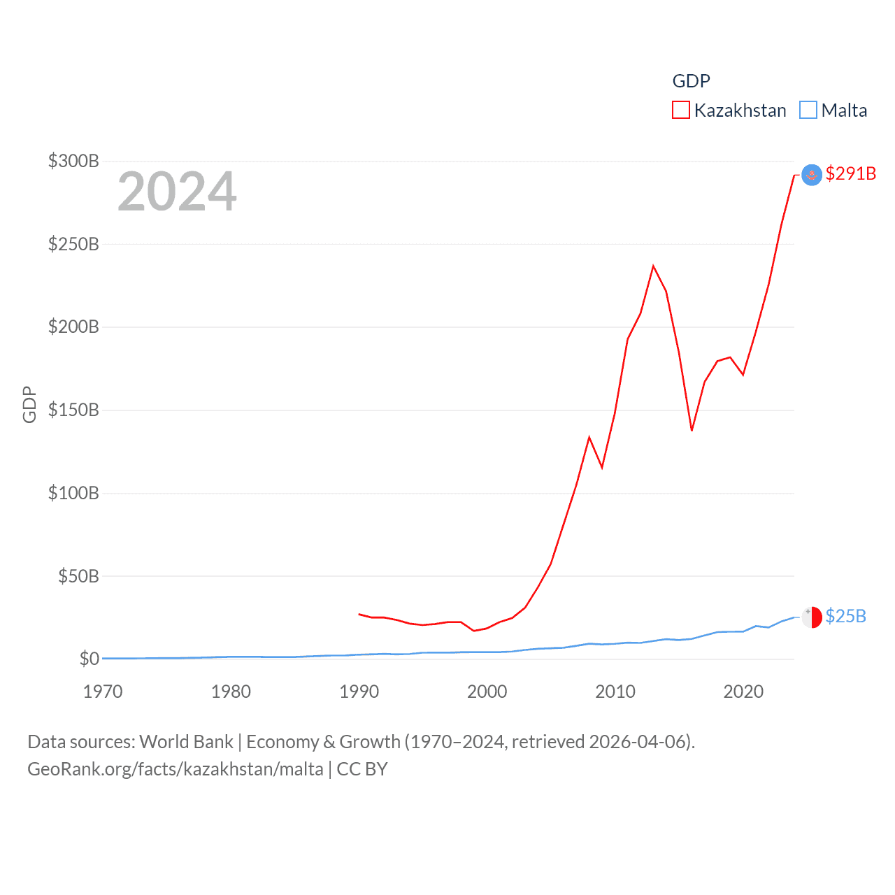 By GDP, Kazakhstan ranks 48/197 ($291B) and Malta ranks 119/197 ($25B). By GDP per capita, Kazakhstan ranks 71/197 ($14,155), while Malta ranks 28/197 ($43,899).