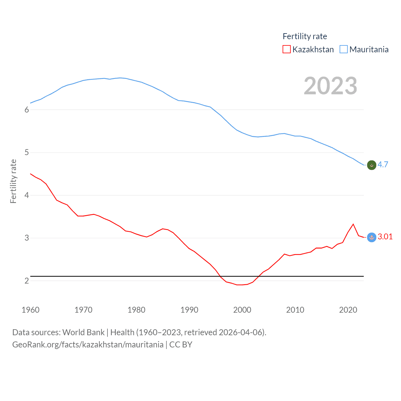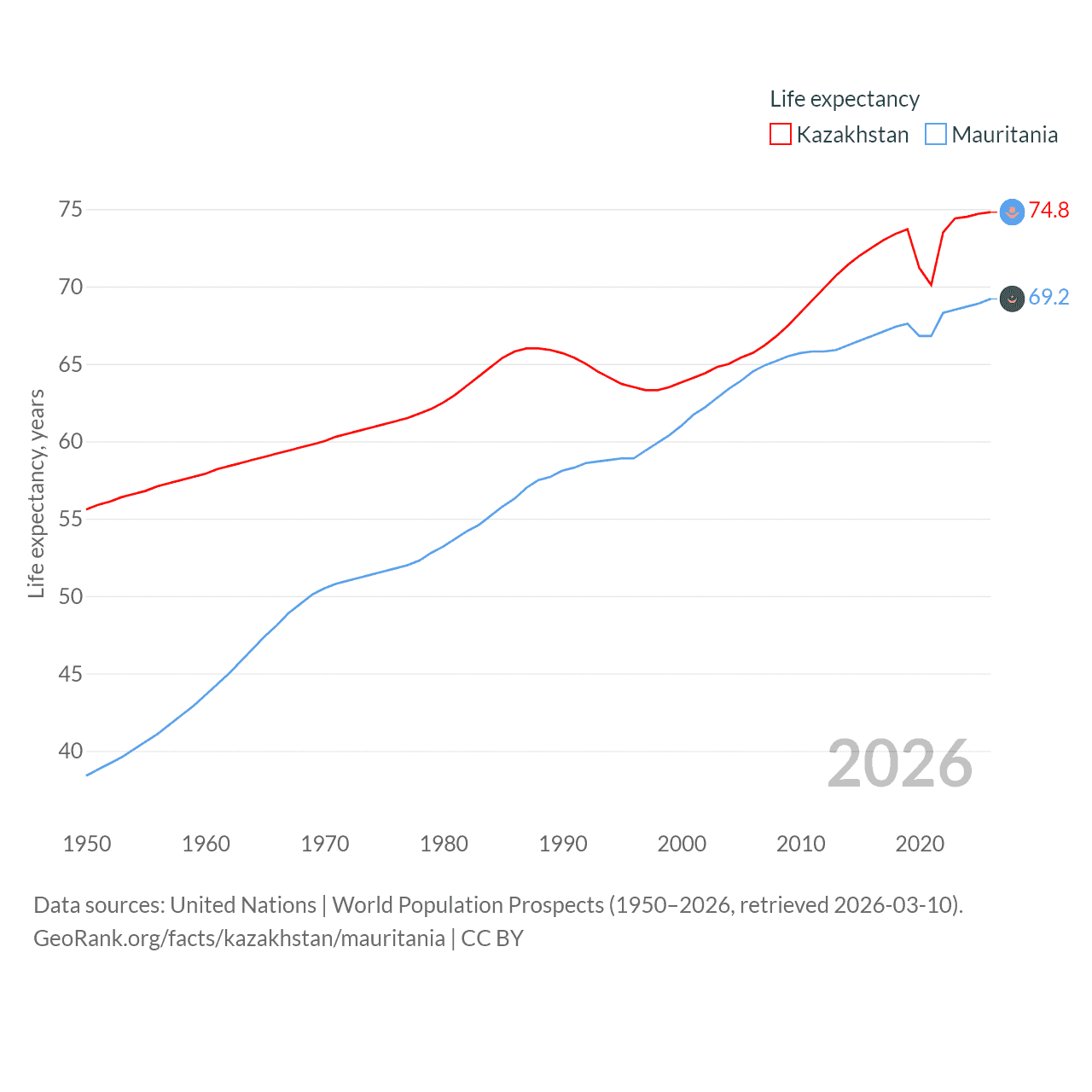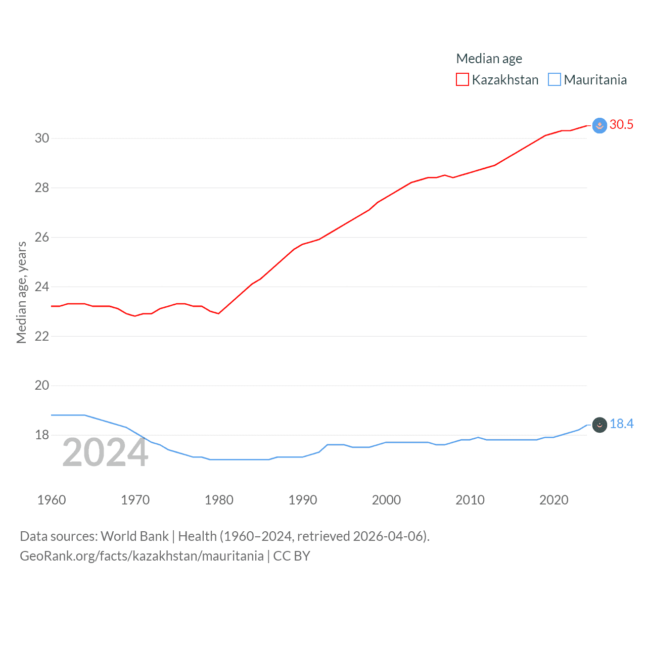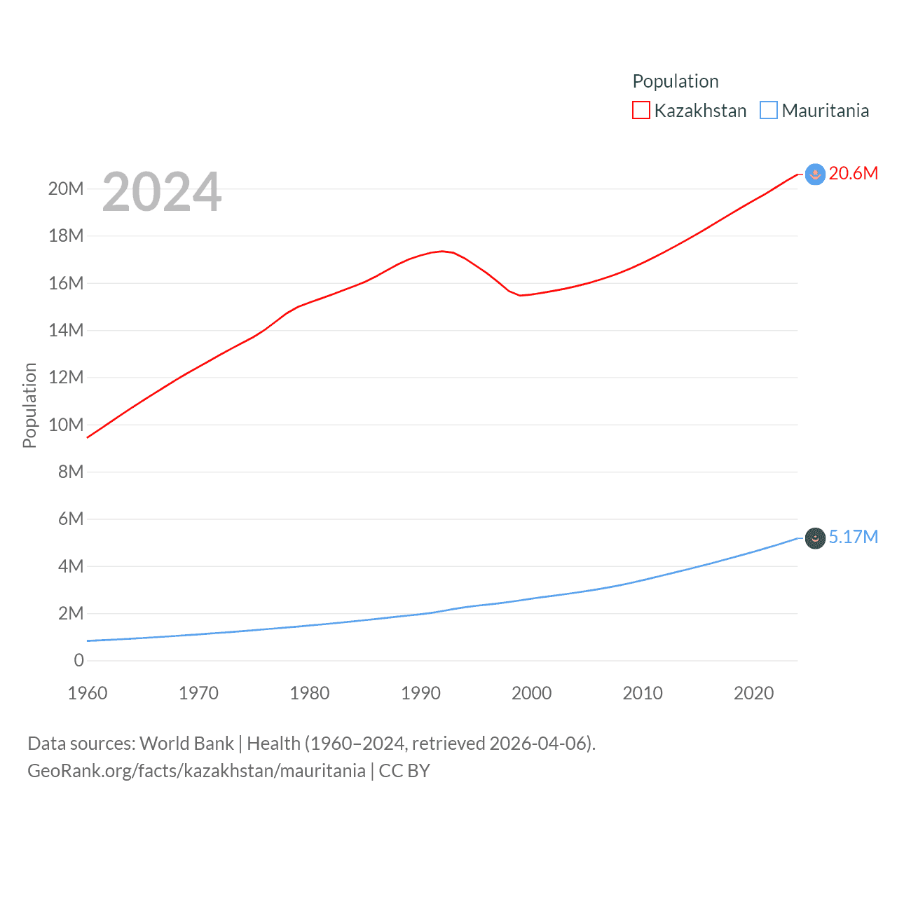 Kazakhstan has a population of 20.6M (ranked 64/197), compared with 5.17M in Mauritania (ranked 125/197). Kazakhstan's land area is 1,042,360 sq mi versus 397,955 sq mi for Mauritania (ranked 9th vs. 28th).