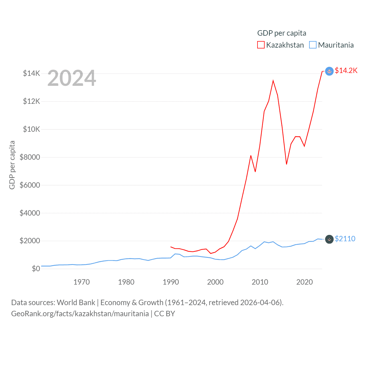 By GDP, Kazakhstan ranks 48/197 ($291B) and Mauritania ranks 153/197 ($10.9B). By GDP per capita, Kazakhstan ranks 71/197 ($14,155), while Mauritania ranks 156/197 ($2,110).