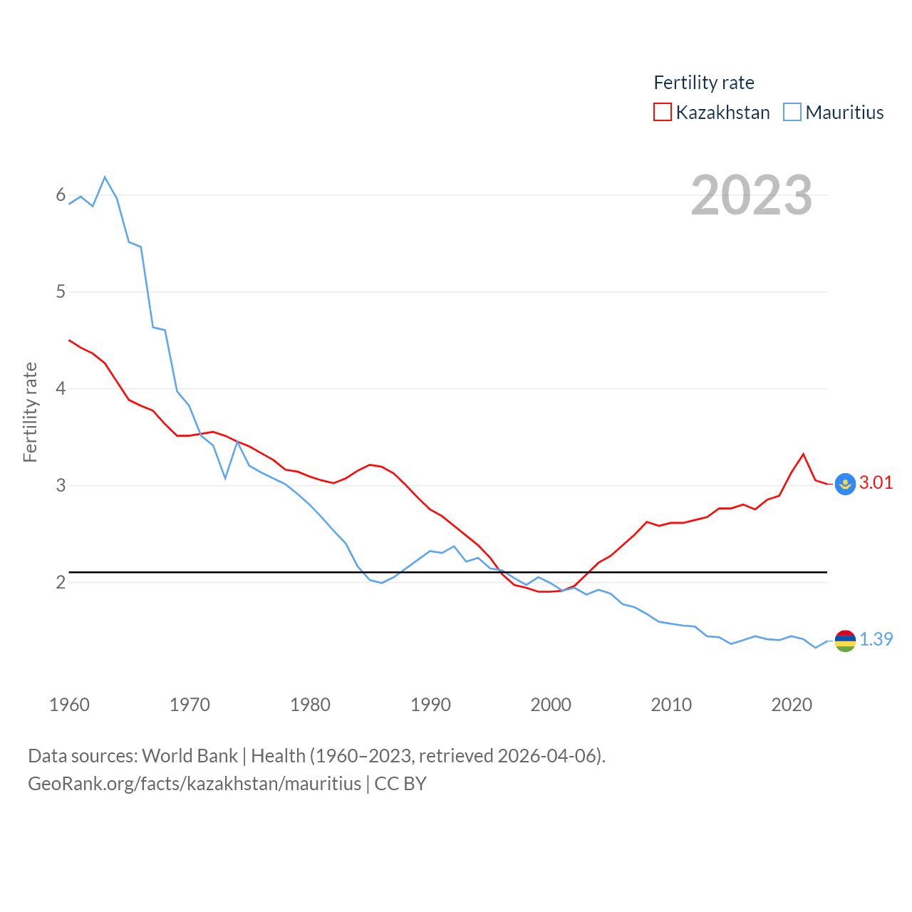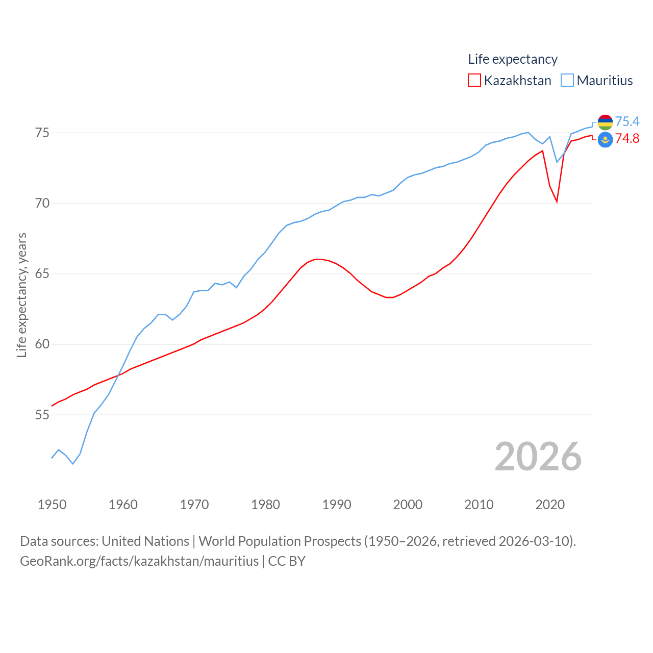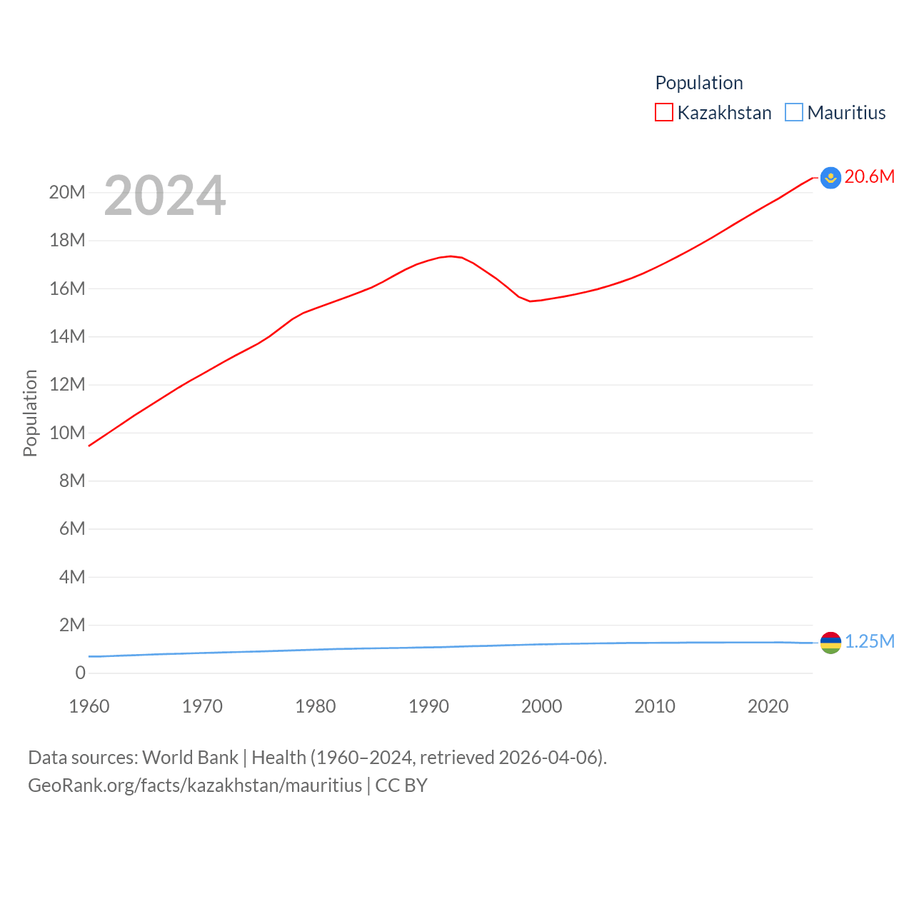 Kazakhstan has a population of 20.6M (ranked 64/197), compared with 1.25M in Mauritius (ranked 156/197). Kazakhstan's land area is 1,042,360 sq mi versus 771 sq mi for Mauritius (ranked 9th vs. 170th).