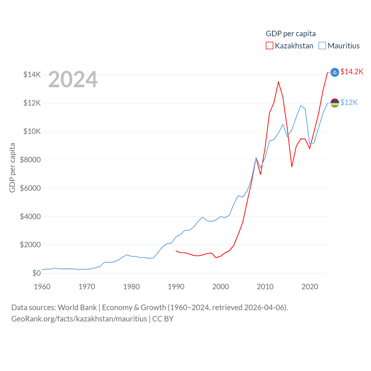 By GDP, Kazakhstan ranks 48/197 ($291B) and Mauritius ranks 143/197 ($14.9B). By GDP per capita, Kazakhstan ranks 71/197 ($14,155), while Mauritius ranks 78/197 ($11,991).
