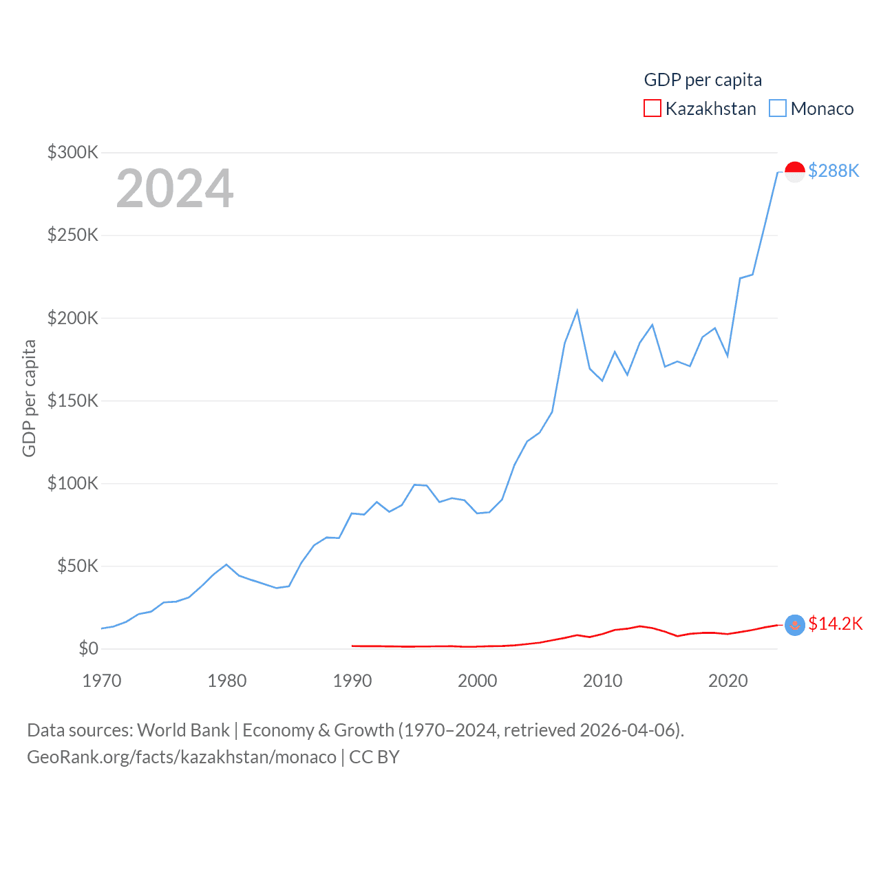 By GDP, Kazakhstan ranks 48/197 ($291B) and Monaco ranks 152/197 ($11.1B). By GDP per capita, Kazakhstan ranks 71/197 ($14,155), while Monaco ranks 1/197 ($288,001).