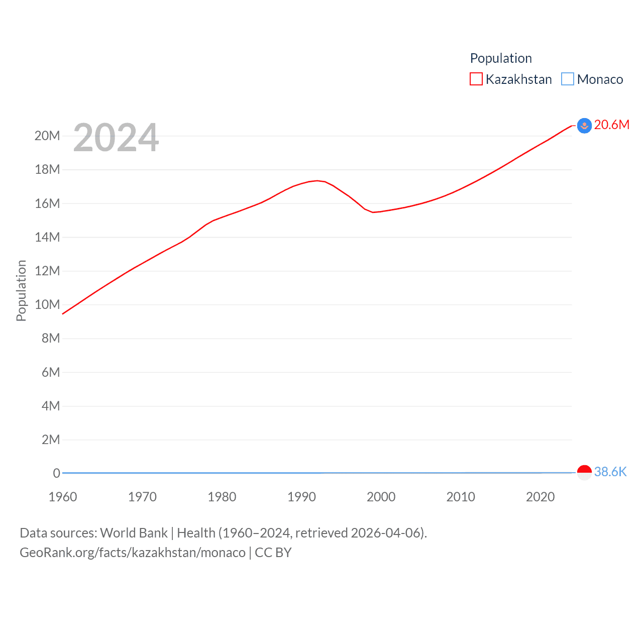 Kazakhstan has a population of 20.6M (ranked 64/197), compared with 38.6K in Monaco (ranked 191/197). Kazakhstan's land area is 1,042,360 sq mi versus 0.8 sq mi for Monaco (ranked 9th vs. 196th).