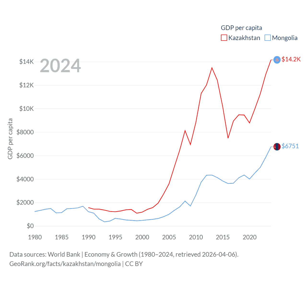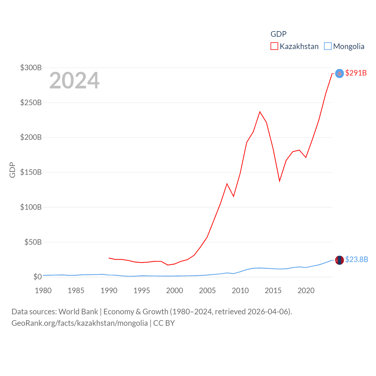By GDP, Kazakhstan ranks 48/197 ($291B) and Mongolia ranks 121/197 ($23.8B). By GDP per capita, Kazakhstan ranks 71/197 ($14,155), while Mongolia ranks 105/197 ($6,751).