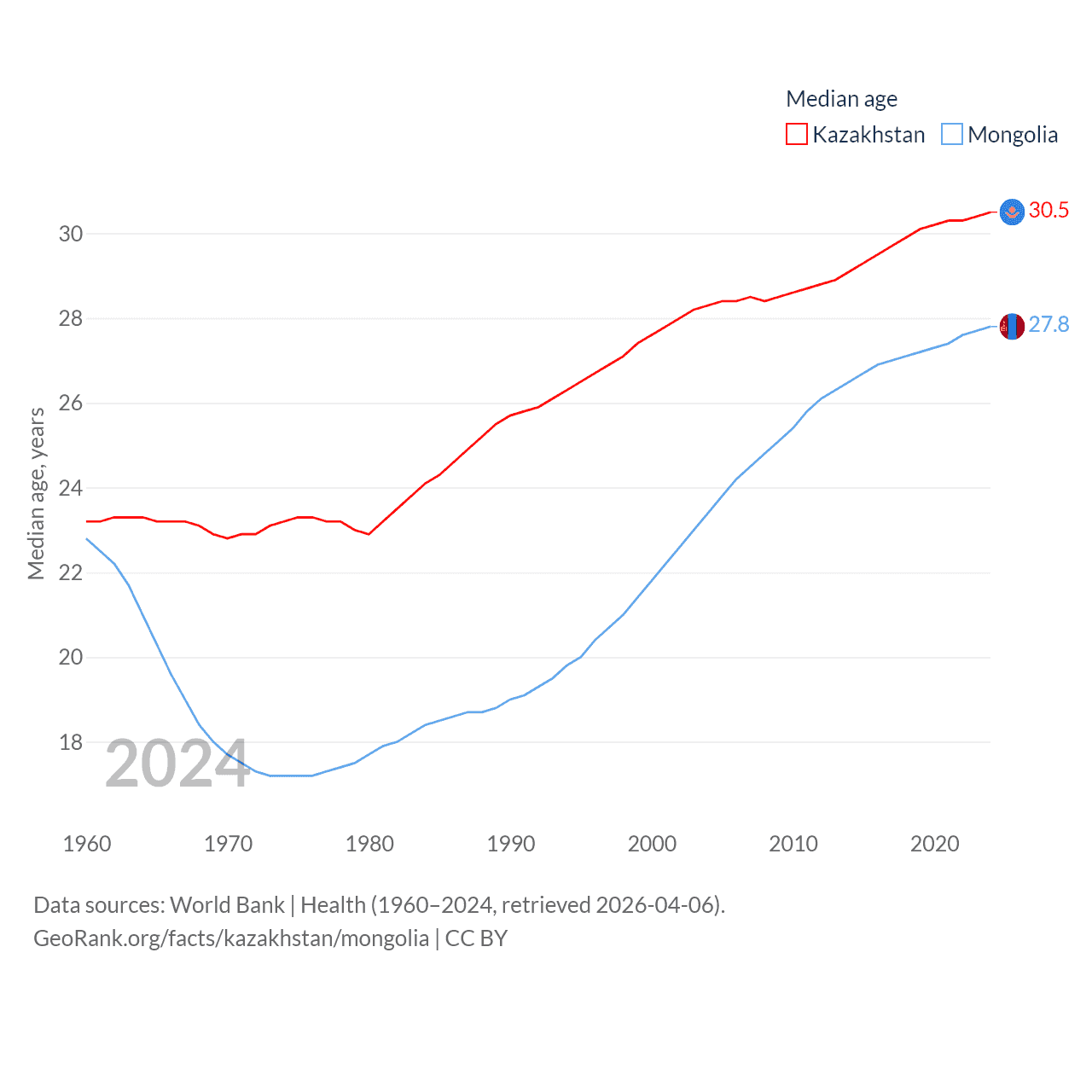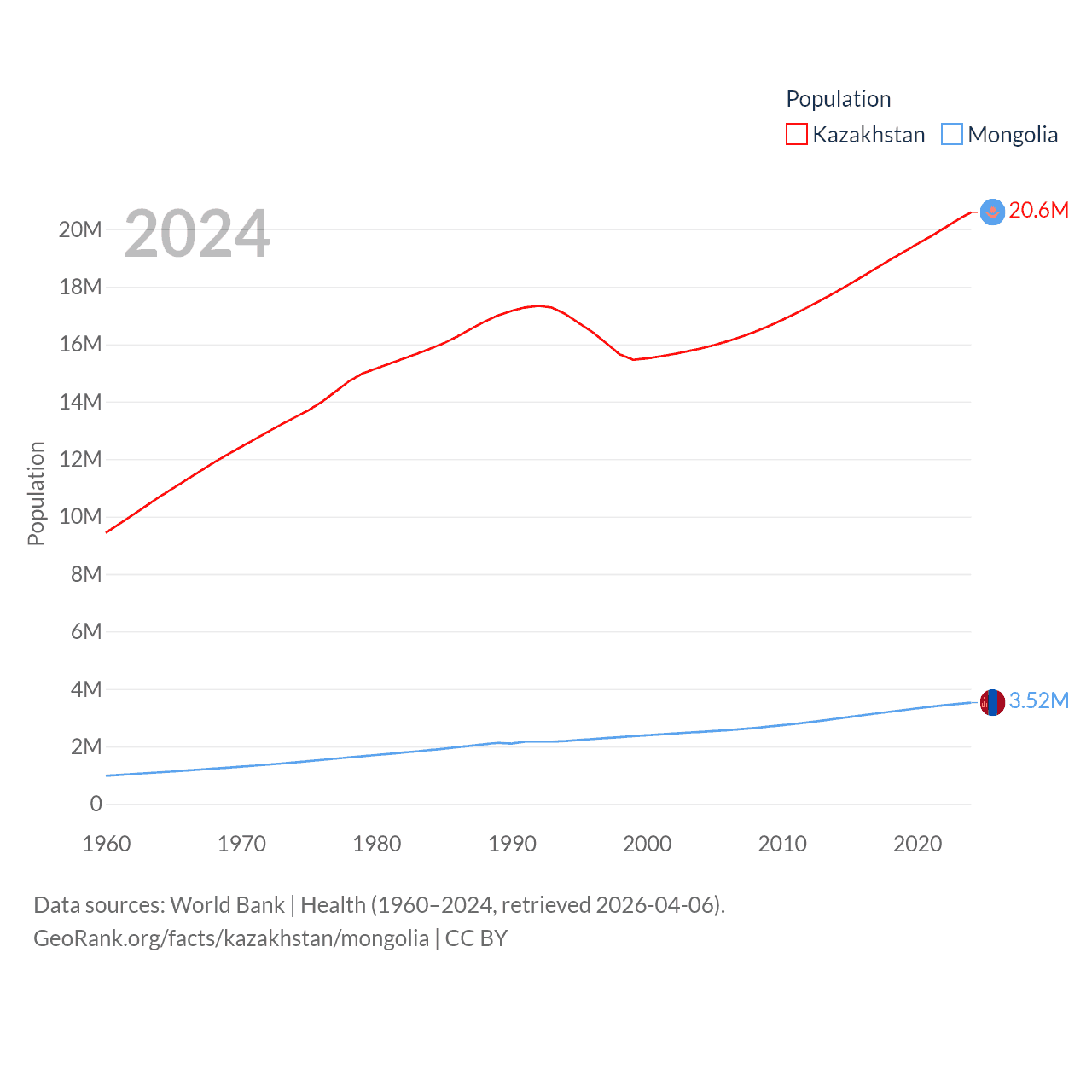 Kazakhstan has a population of 20.6M (ranked 64/197), compared with 3.52M in Mongolia (ranked 132/197). Kazakhstan's land area is 1,042,360 sq mi versus 601,740 sq mi for Mongolia (ranked 9th vs. 18th).