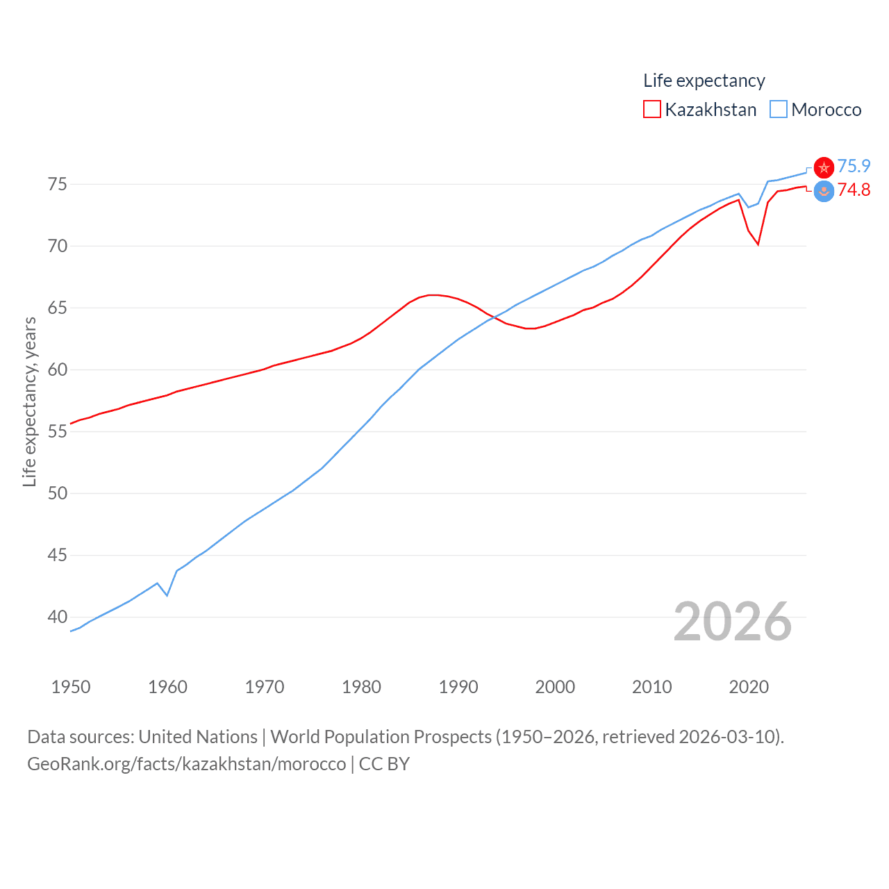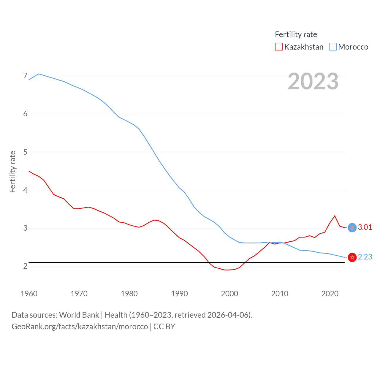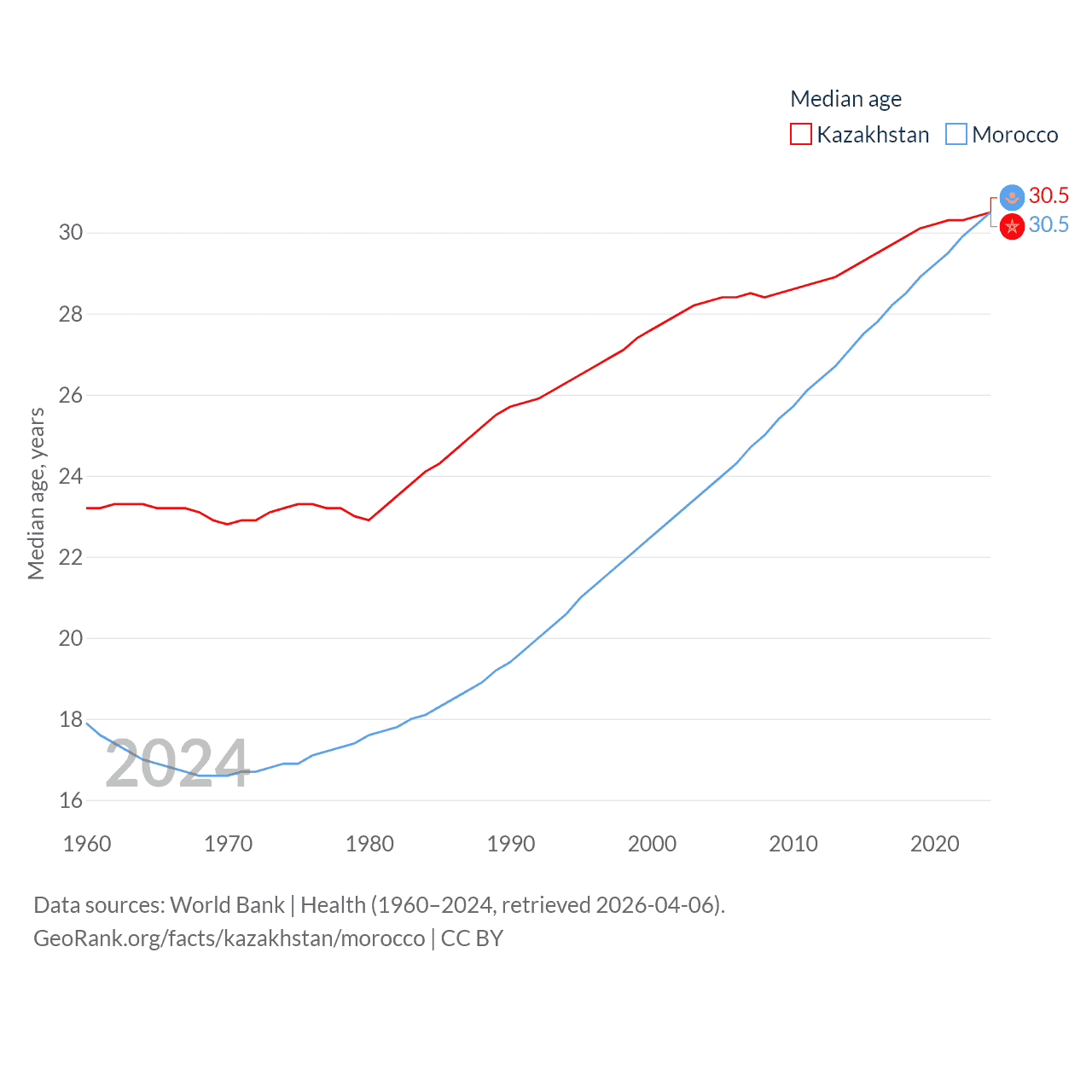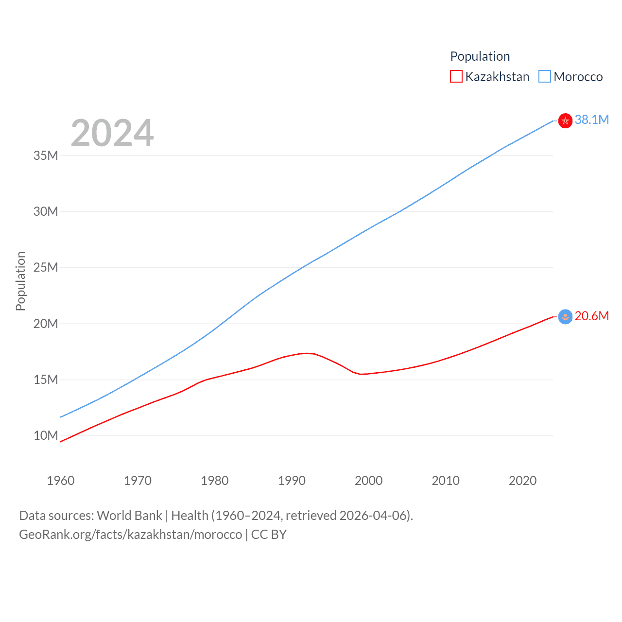 Kazakhstan has a population of 20.6M (ranked 64/197), compared with 38.1M in Morocco (ranked 39/197). Kazakhstan's land area is 1,042,360 sq mi versus 172,317 sq mi for Morocco (ranked 9th vs. 55th).