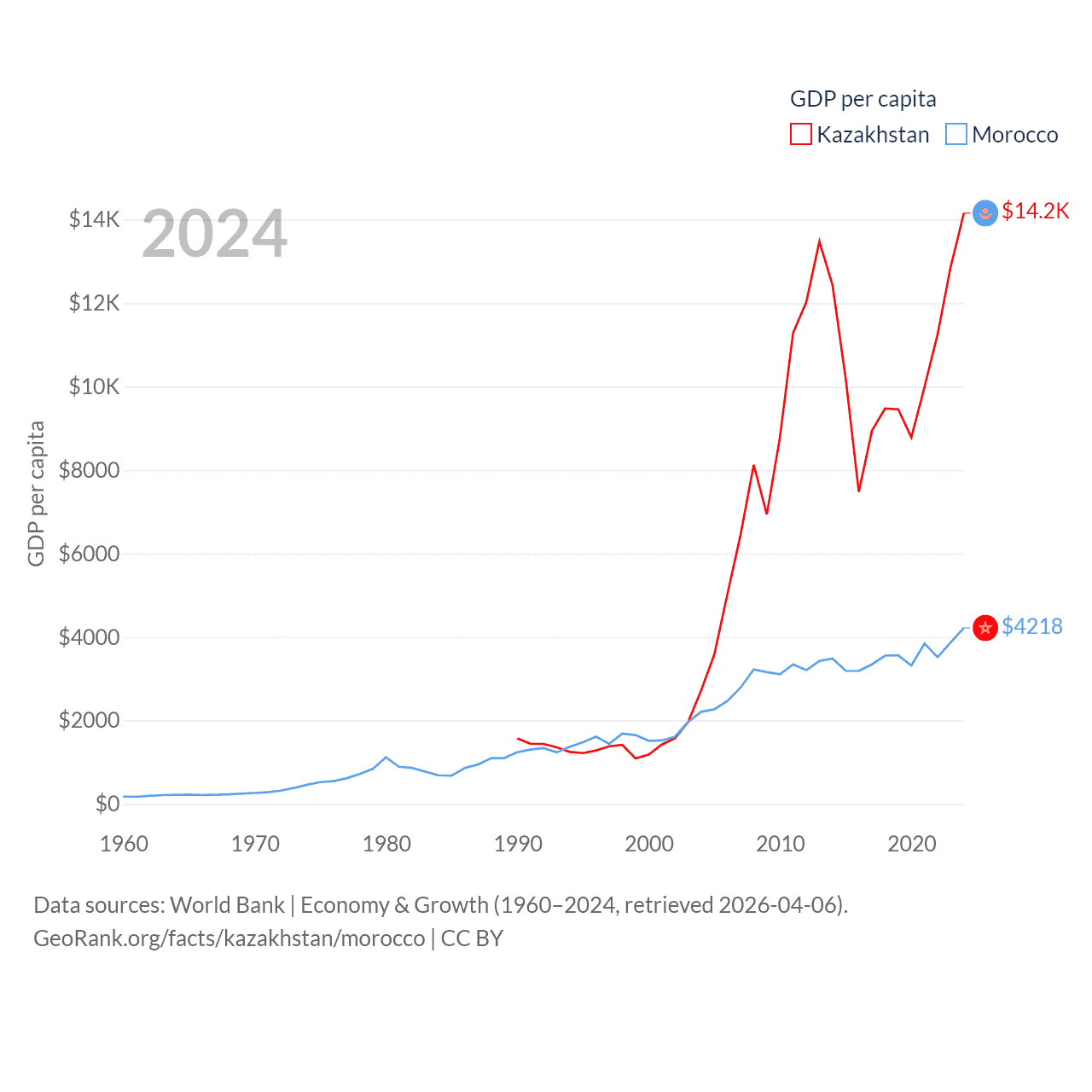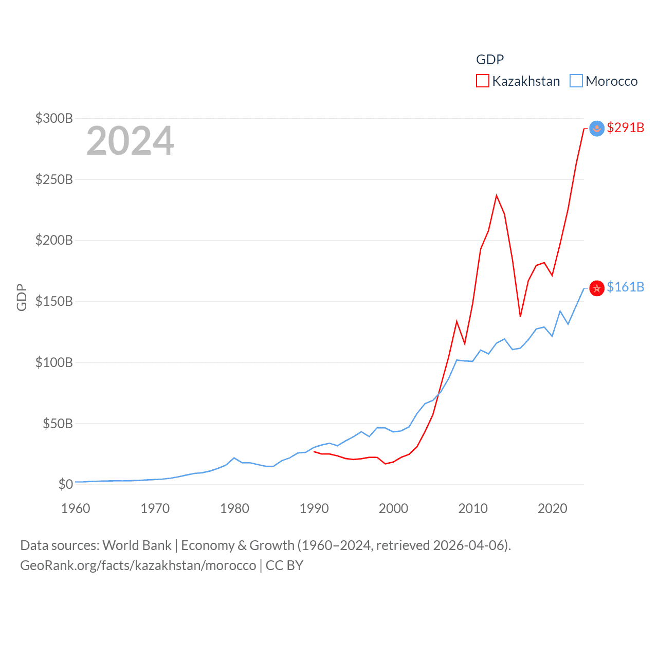 By GDP, Kazakhstan ranks 48/197 ($291B) and Morocco ranks 58/197 ($161B). By GDP per capita, Kazakhstan ranks 71/197 ($14,155), while Morocco ranks 127/197 ($4,218).