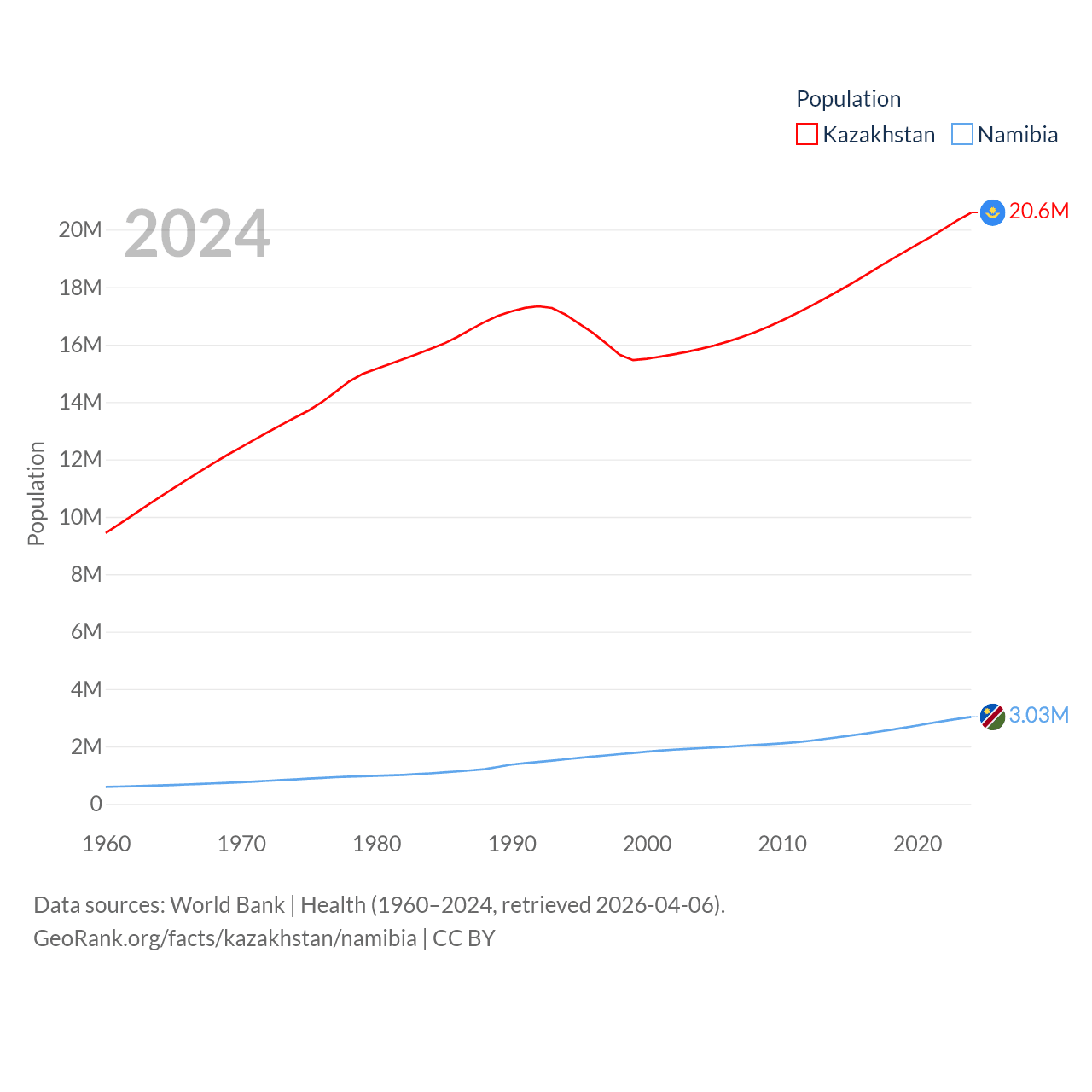 Kazakhstan has a population of 20.6M (ranked 64/197), compared with 3.03M in Namibia (ranked 136/197). Kazakhstan's land area is 1,042,360 sq mi versus 317,874 sq mi for Namibia (ranked 9th vs. 33rd).