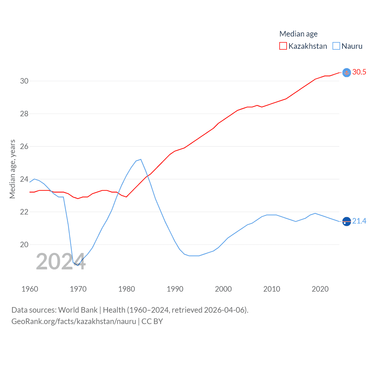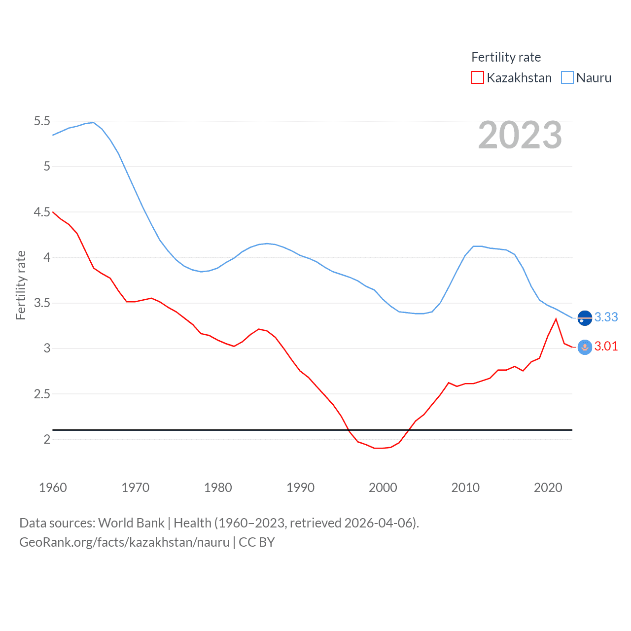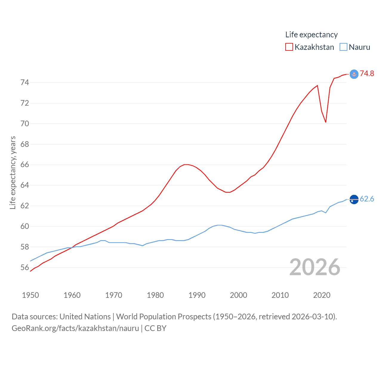 Kazakhstan has a population of 20.6M (ranked 64/197), compared with 11.9K in Nauru (ranked 195/197). Kazakhstan's land area is 1,042,360 sq mi versus 7.72 sq mi for Nauru (ranked 9th vs. 195th).
