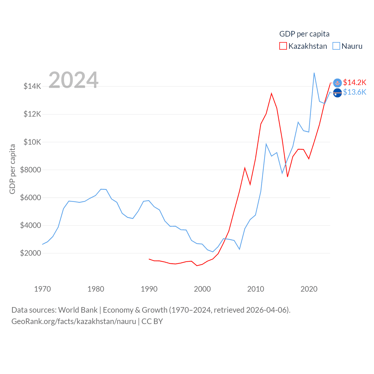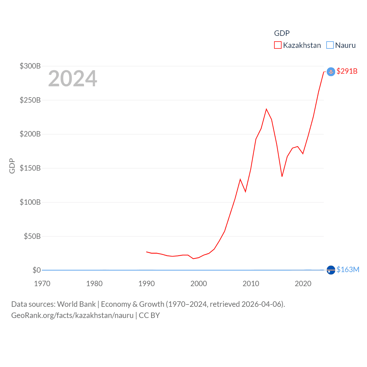 By GDP, Kazakhstan ranks 48/197 ($291B) and Nauru ranks 195/197 ($163M). By GDP per capita, Kazakhstan ranks 71/197 ($14,155), while Nauru ranks 74/197 ($13,609).