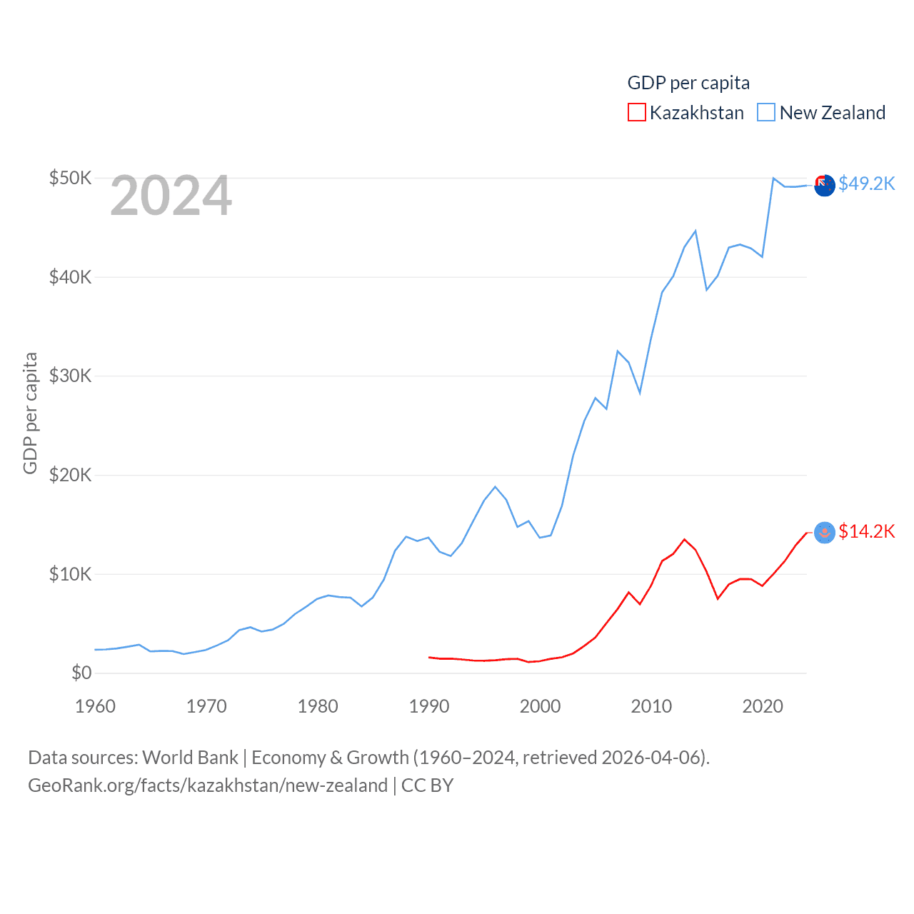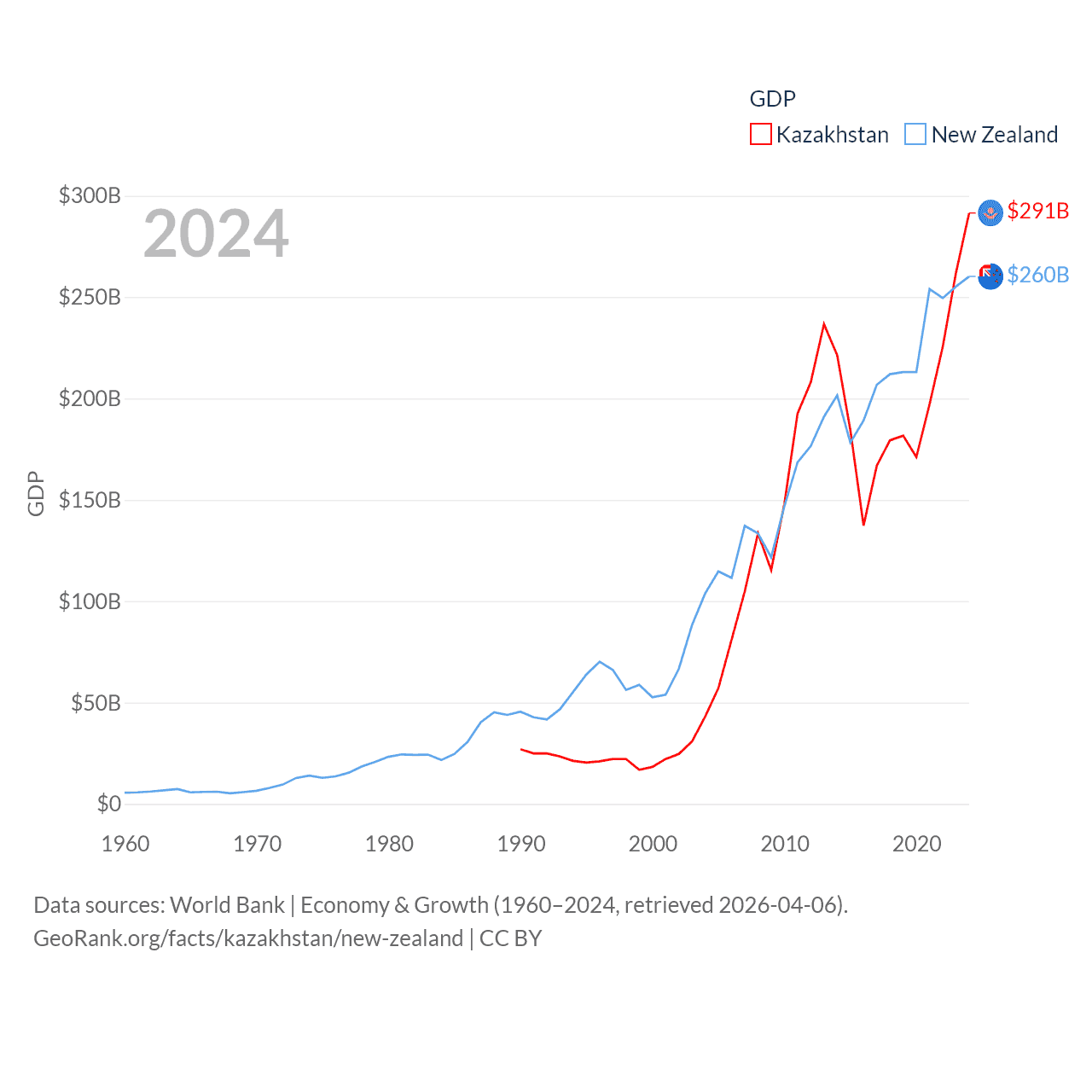 By GDP, Kazakhstan ranks 48/197 ($291B) and New Zealand ranks 52/197 ($260B). By GDP per capita, Kazakhstan ranks 71/197 ($14,155), while New Zealand ranks 26/197 ($49,205).